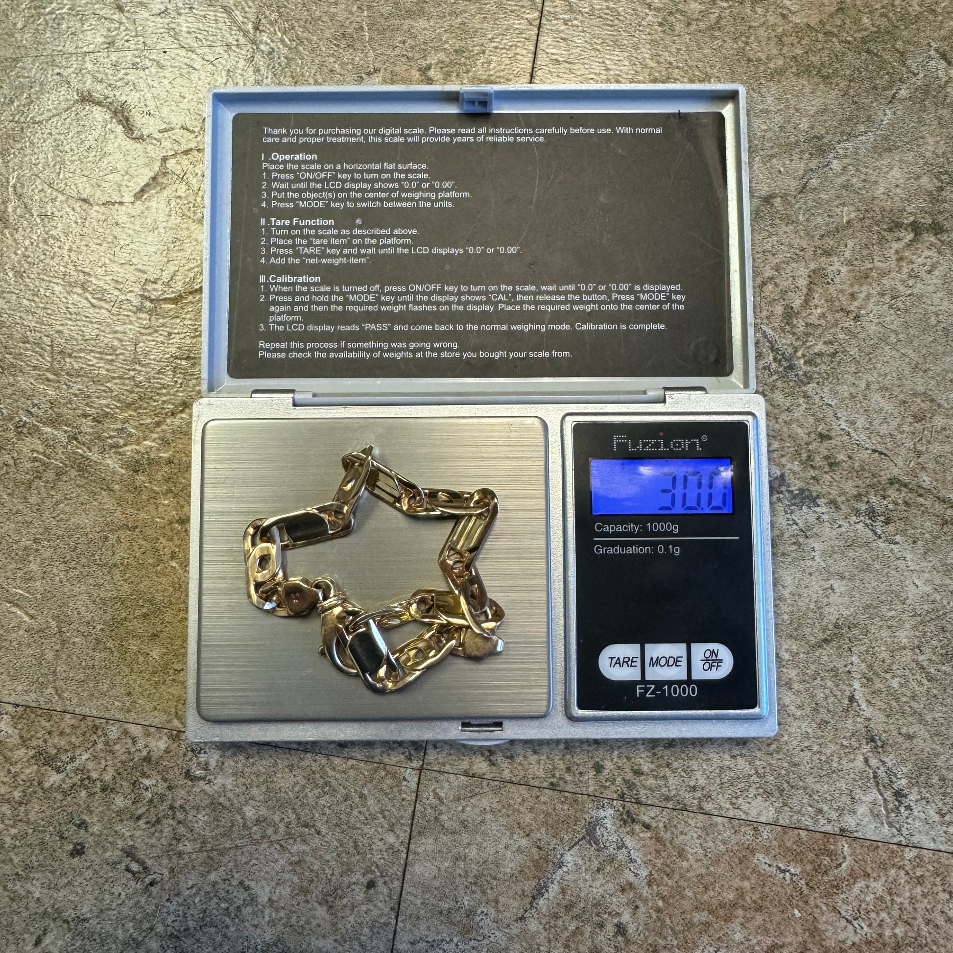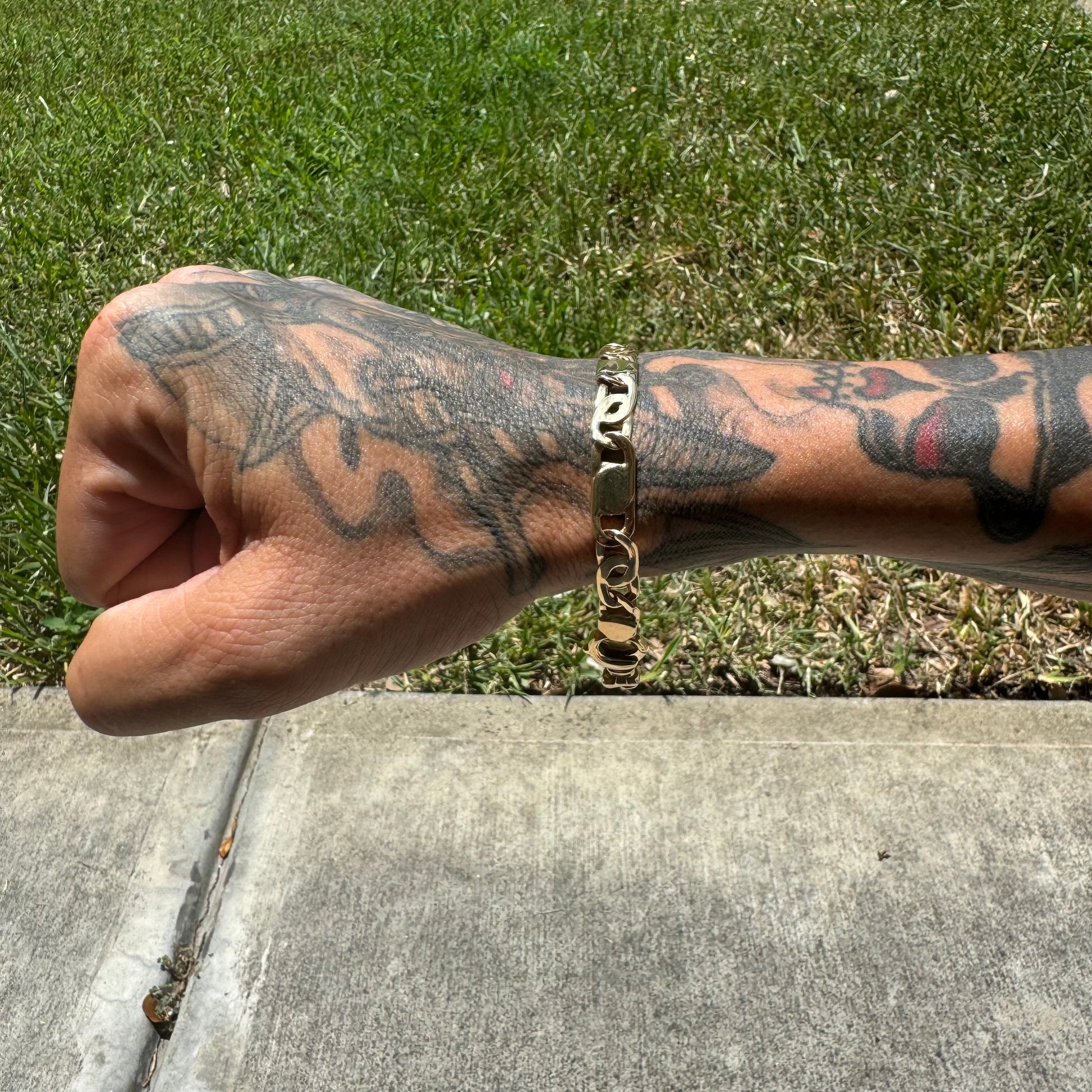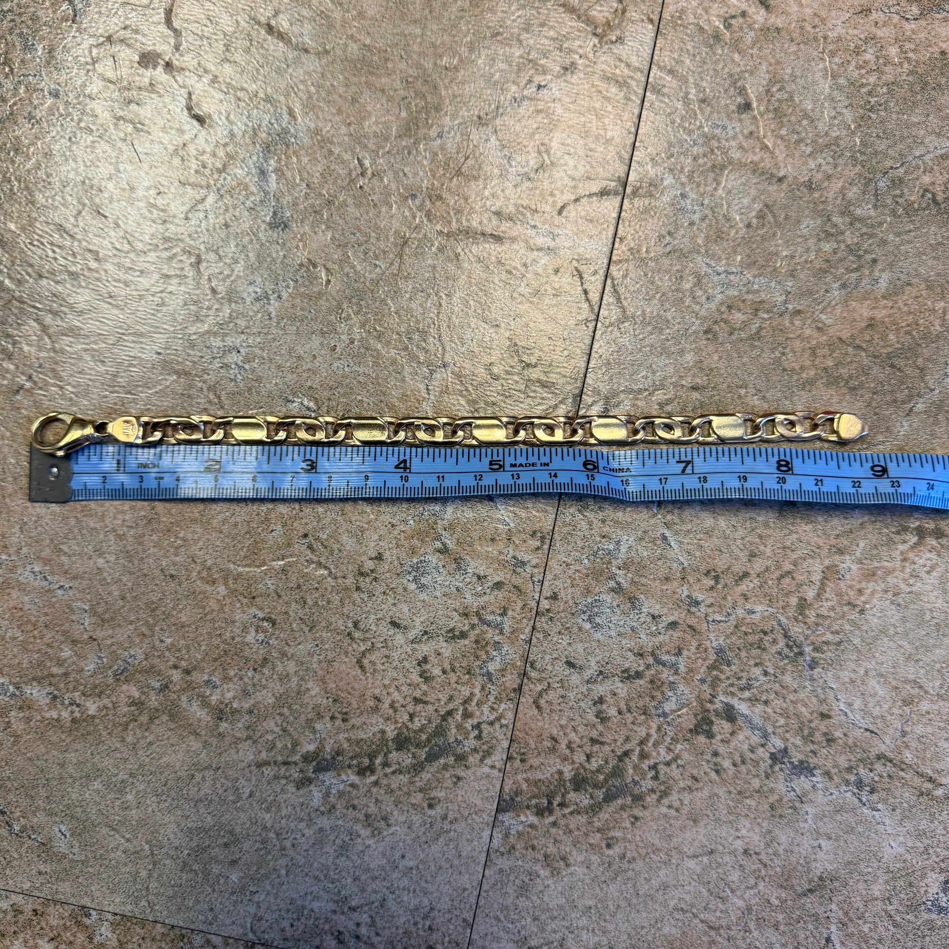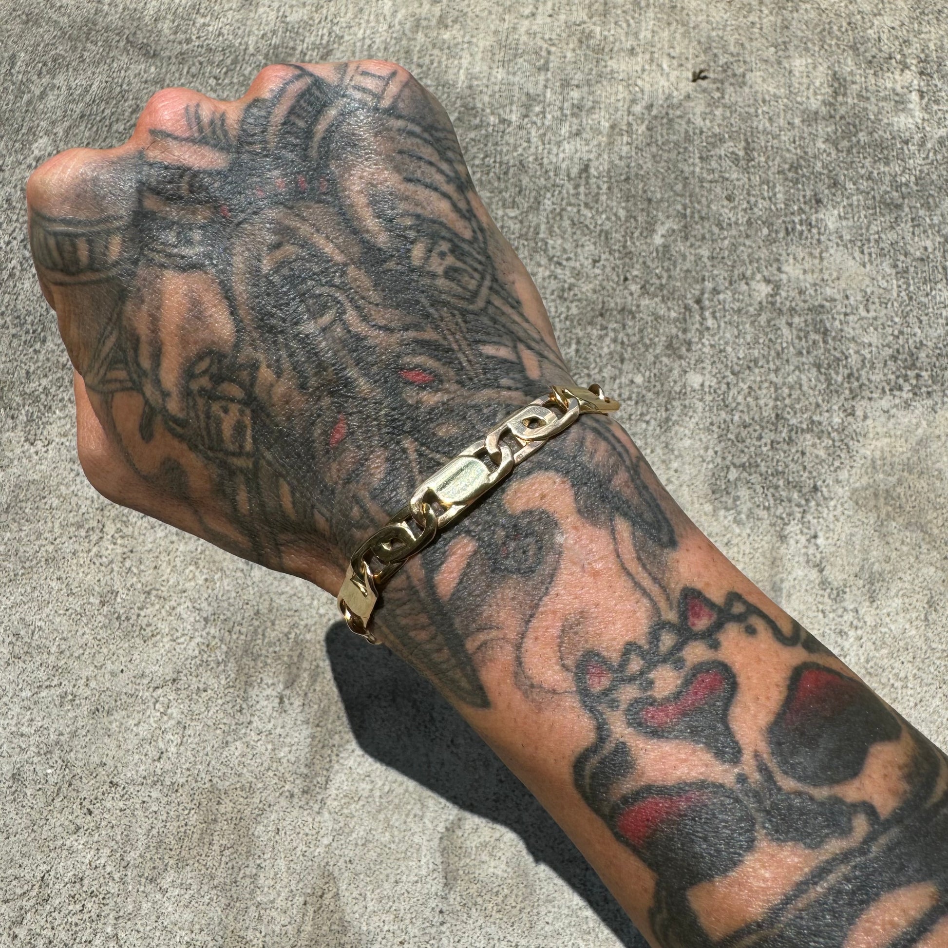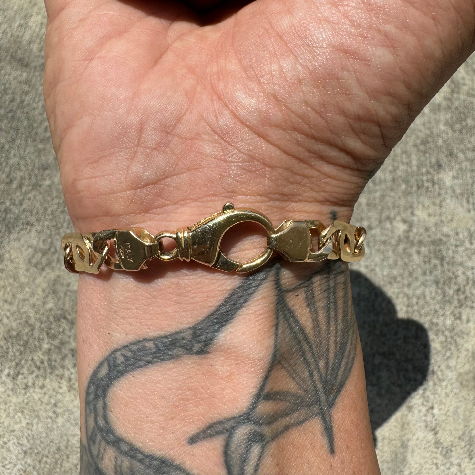 Coming straight out of the old school for the bigger wristed fellas is this very unique and one of a kind Italian made solid 14k gold tigers eye link bracelet. The difference between this and the other unique tigers eye bracelets you might have seen from back in the day, circa 1990’s is that each tigers eye link is seperated by a solid filled mariner link giving each link an almost evil eye look and feel. At 8.75” long and 8mm wide weighing in at a whopping 30g this heavy duty bracelet is no joke with oversized large lobster clasp and Heavyduty terminal ends this beast can take some damage and still look just as good and strong.