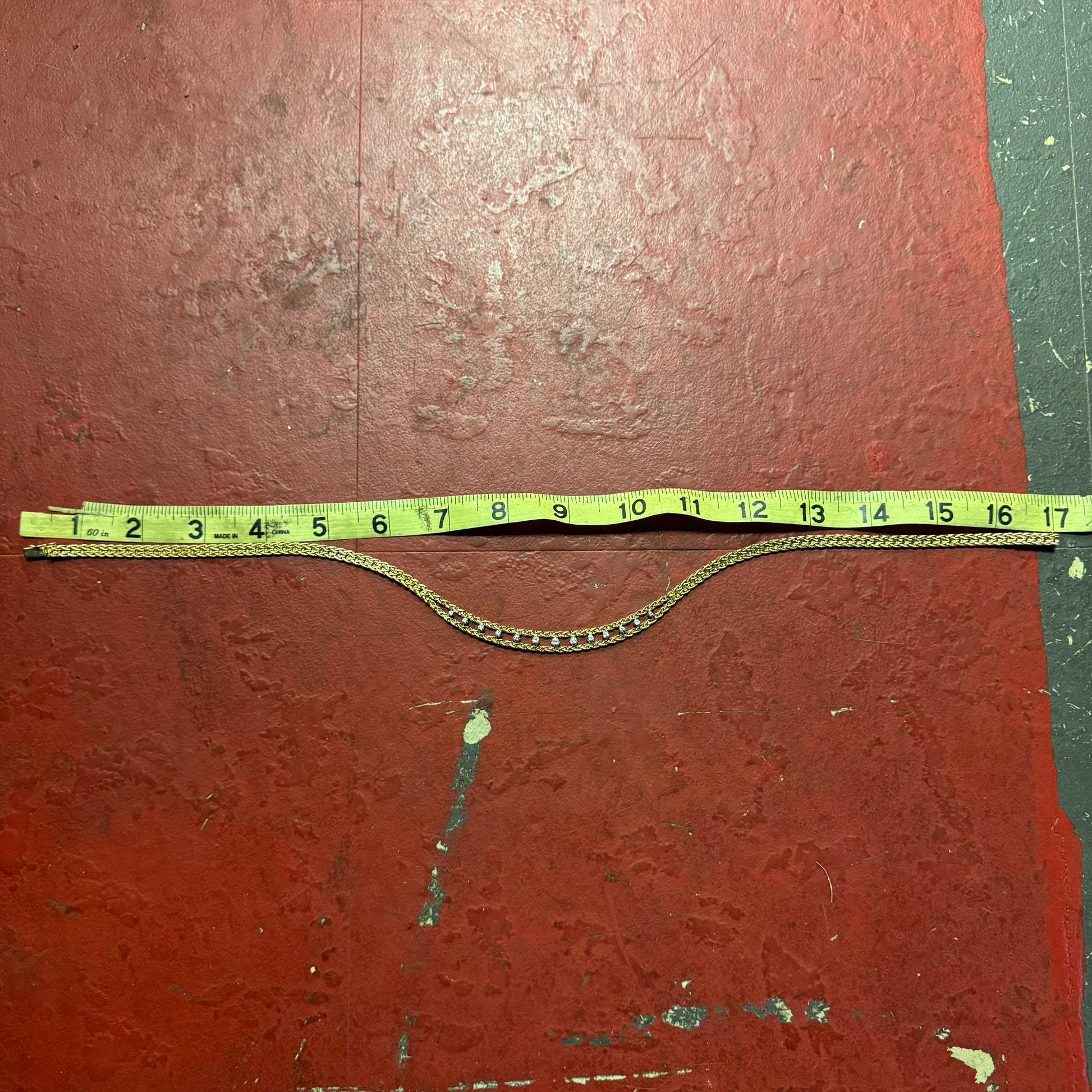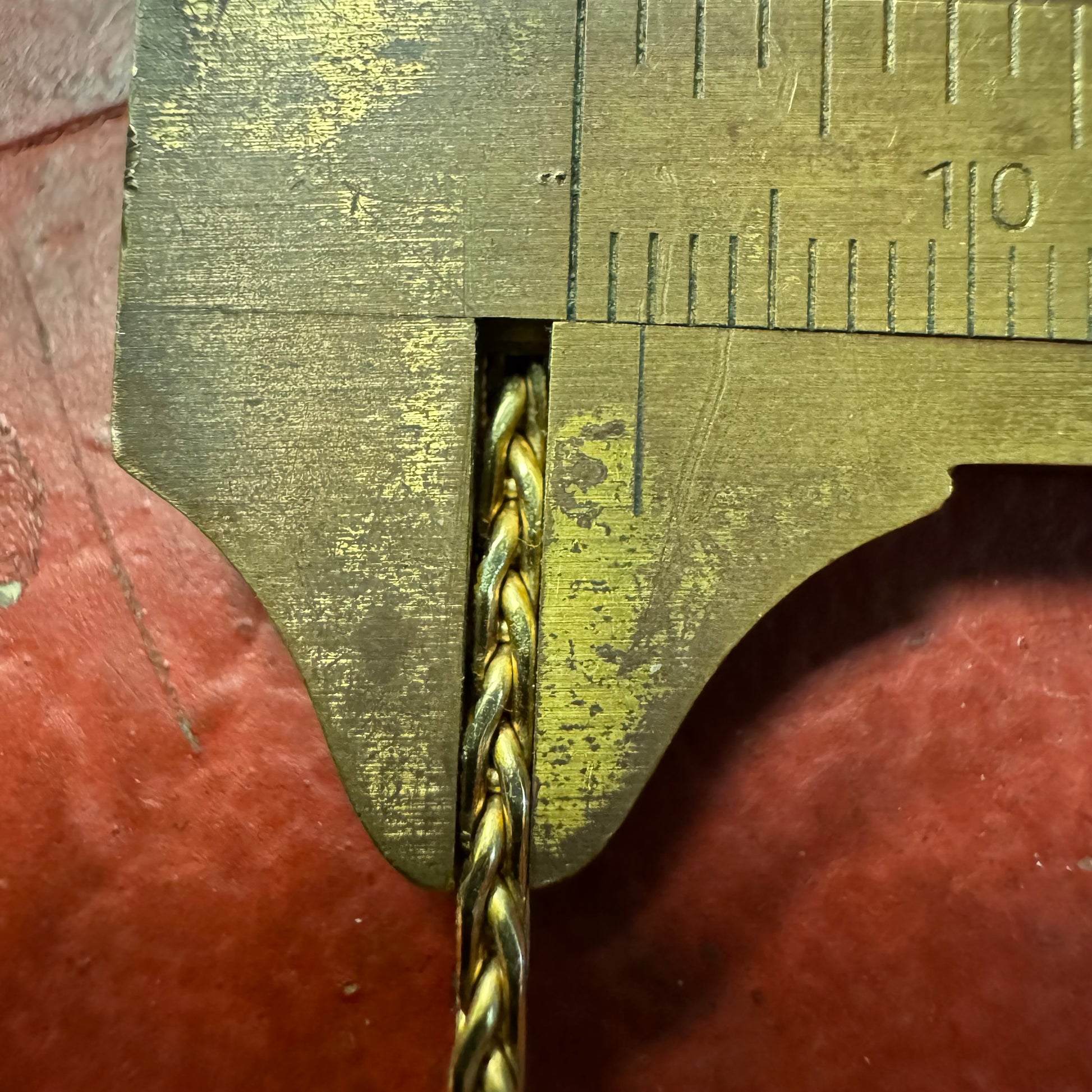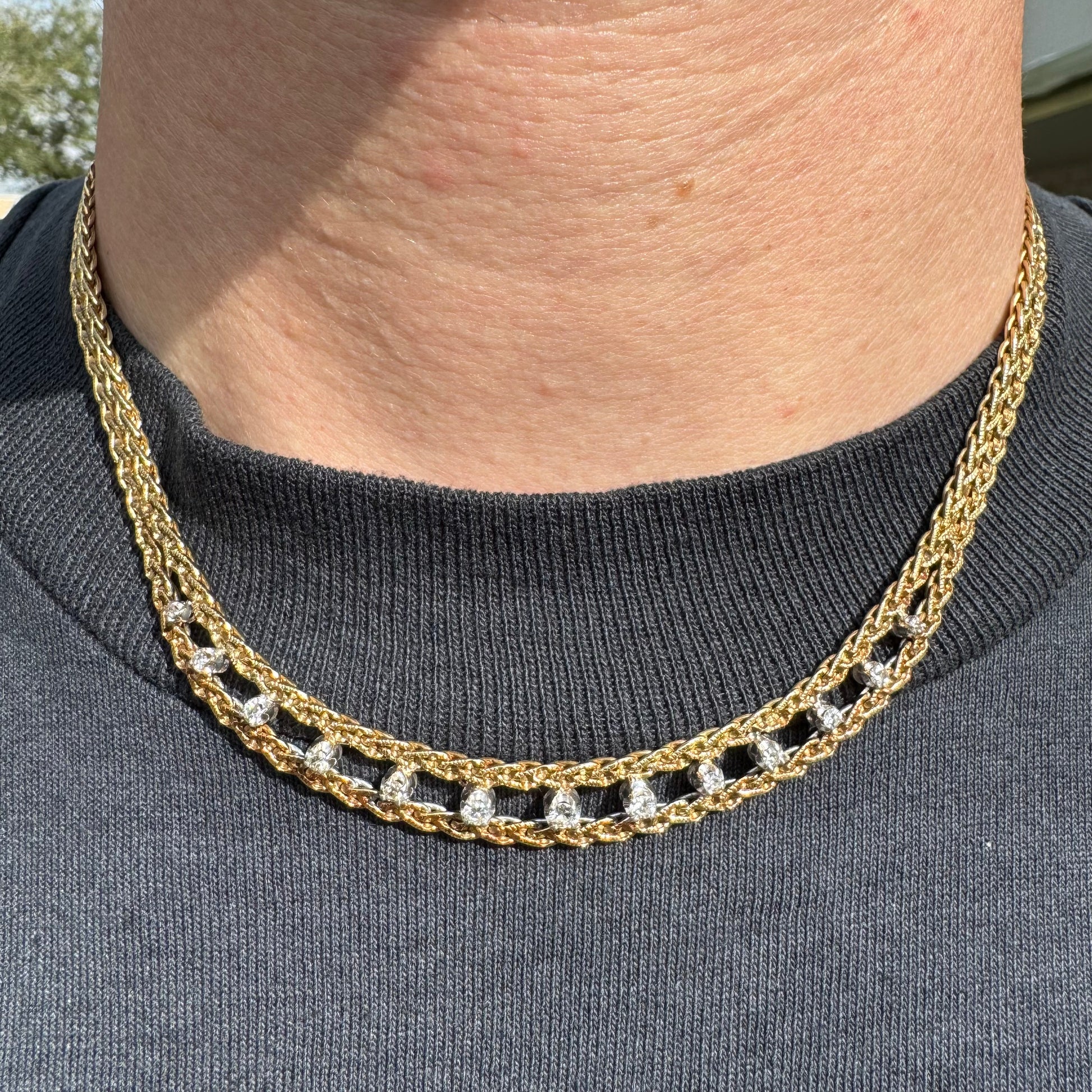 With 13 stunning VS quality natural diamonds totaling approximately 1.1ctw prong set in 14k white gold as if they appear “floating“ in between the 2 braided foxtail links is this solid 14k yellow gold Italian crafted high end necklace. With oversized box lock and measuring about 17” from end to end this heavy piece weighs 34.38g and is 9mm at its widest in the center of the Diamond row tapering down to 5mm and 2mm thick. At this price for a piece like this is an incredible deal and though it’s “meant” for a woman whether wearing it solo or bundled with other necklaces it also looks really cool on a man. I’ve been wearing it myself and one day I wore it solo while the other day stacked with 4 other chains and I love it.