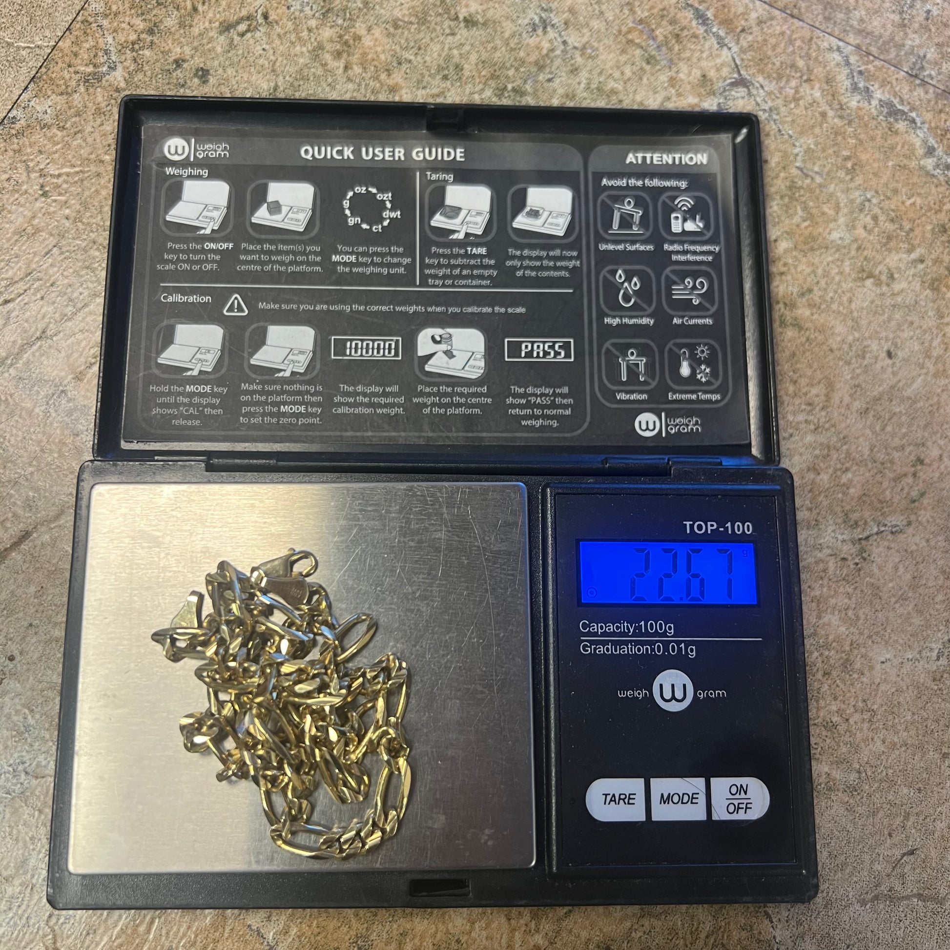 In absolutely immaculate Grade A condition is a solid heavyweight 14k yellow Italian gold Figaro link necklace, though this is not your average Figaro. This chain features a “Knife Edge”, if you look down the center of each link you’ll see a striation of pronounced cuts. These are meant to add depth and intake light into the necklace giving off a flashier appearance when in movement and while stationary to shine like the sun. Weighing in at a beefy 22.7g and approximately 20” in length by 5MM wide this is a perfect size chain.