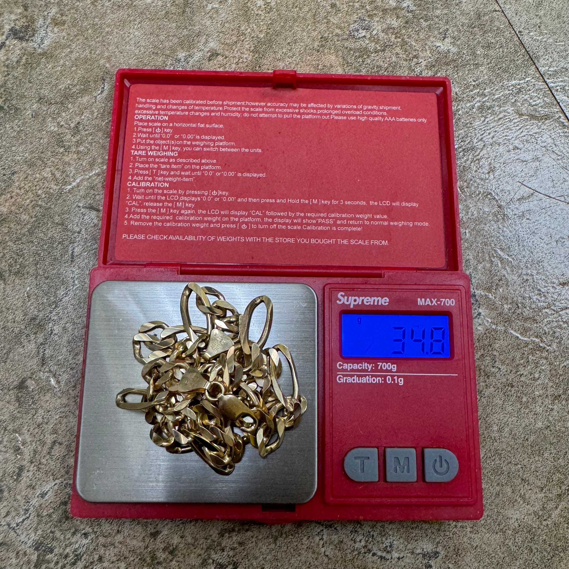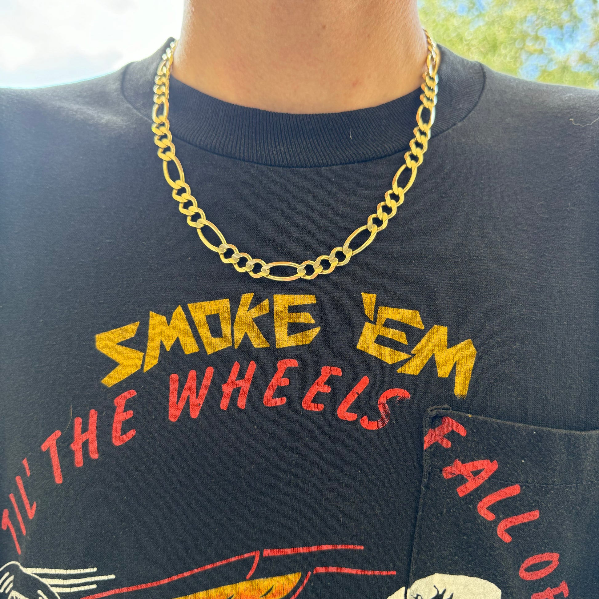 Damn near mind condition this piece is crafted with the utmost attention to detail and craftsmanship. Made sometime around the 1990’s to early 2000’s out of solid 14k yellow Italian gold this is a chunky heavyweight necklace. Weighing in at a hefty 34.8g with a thickness of 8mm and a length of 20” this is not just a classic rounded figaro link style. Each link has a knife edge diamondcut to it giving off drastic flashes of light as it moves around the neck in any sunlight or artificial light reminiscent of numerous photographic flashes. I was given this piece by my buddy at an extremely friendly price so I’m selling it for a lot cheaper than I normally could so take advantage on this one.