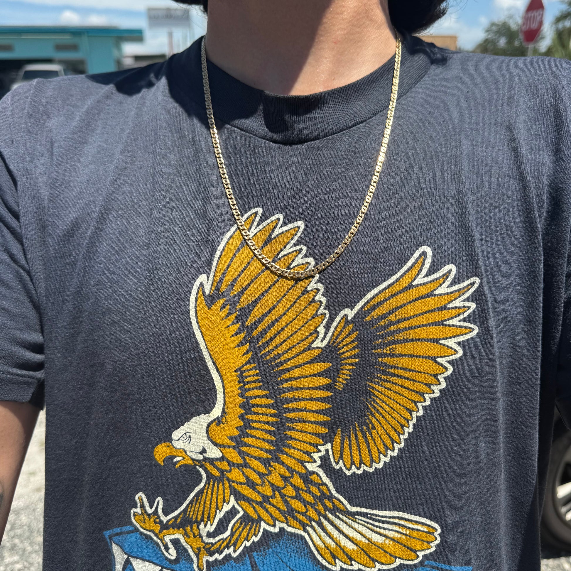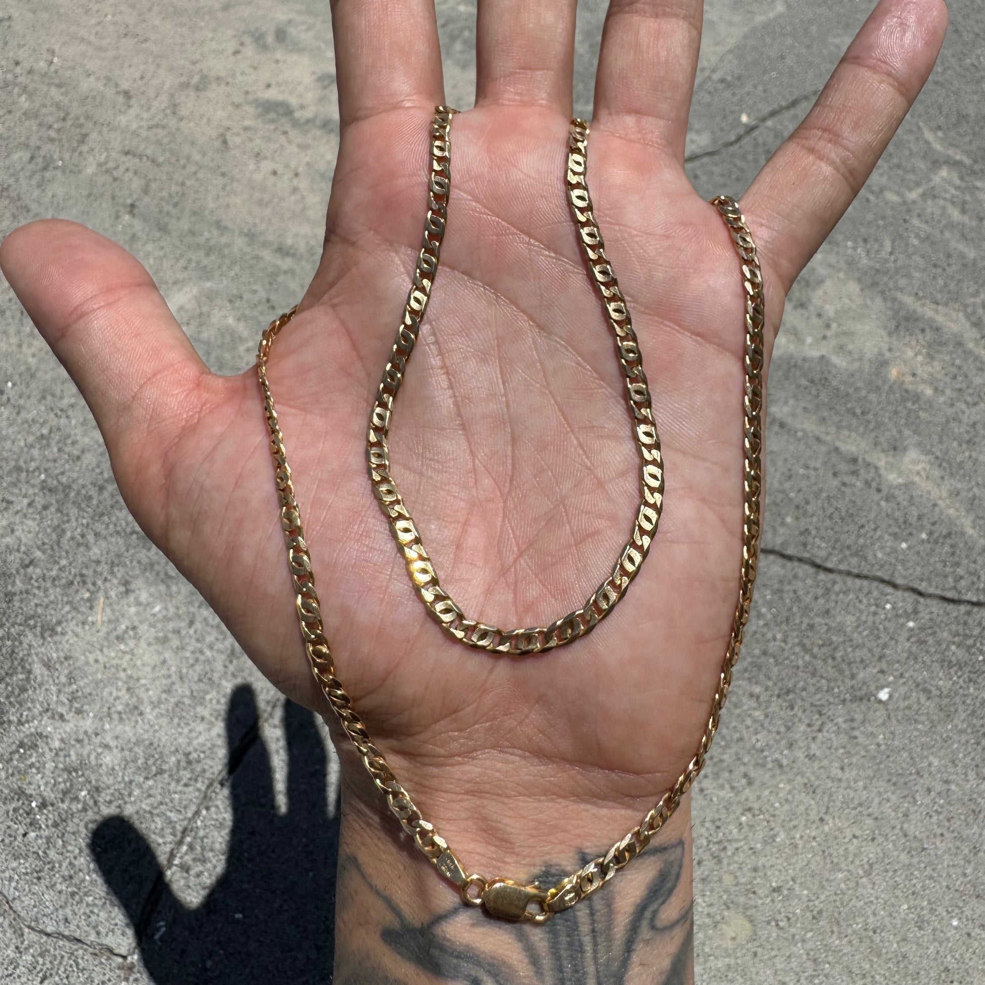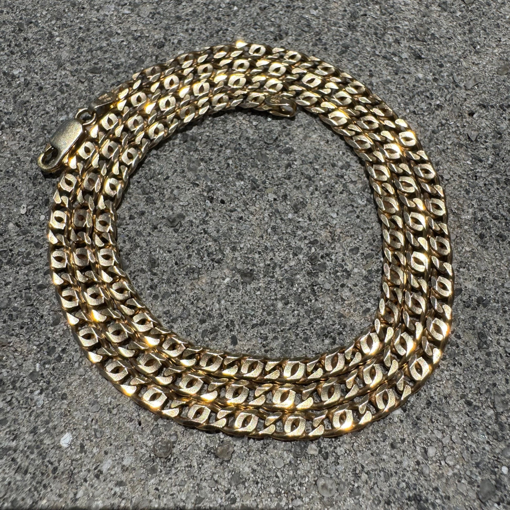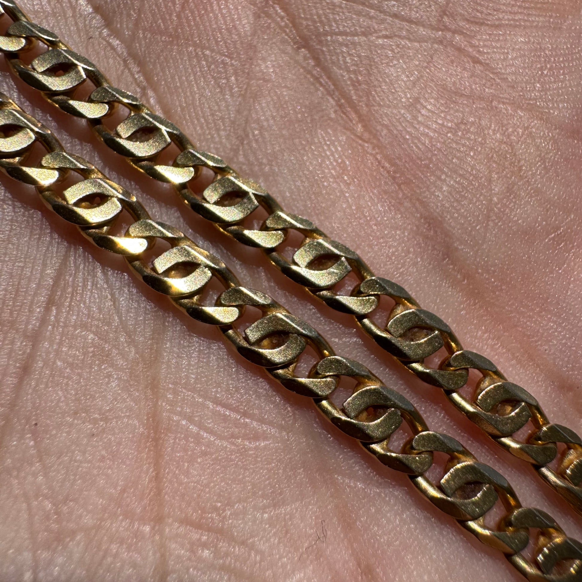 If you’re reading this you’re looking at one of my favorite chains available on the site right now. Quality, looks, weight, elegant, yet fierce style this chain has everything you want going for it. A vibrant glowing solid 14k yellow gold, made in Italy, weighing in at a hefty 19.65g and measuring at a longer 24” length by 4mm in width. This is called a Tigers Eye Chain, the name just sounds tough and it’s looks go right with the name but it’s better known as a “Chanel Link” for its double C look after the Parisian fashion house. This is serious strength that will fit any style no matter who you are or what look you’re going for.