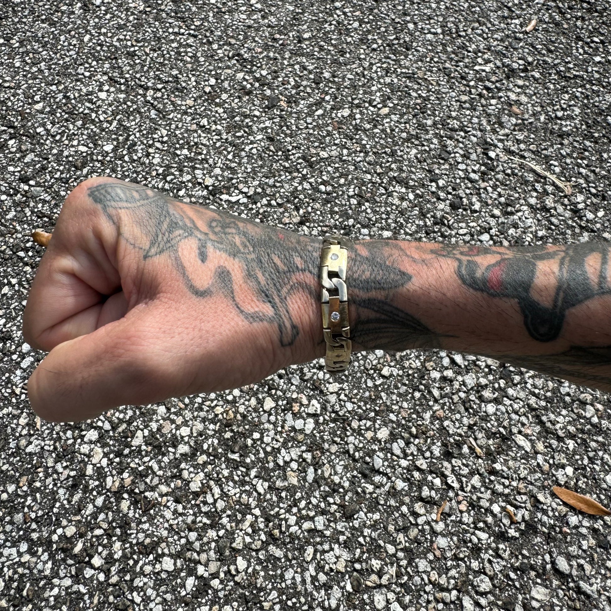 Have you ever seen this link style or a bracelet like this? I haven’t, this is a definitely a first for me. Crafted out of solid 14k gold this is a fancy style link to say the least as it’s a hybrid form of a Cuban link. Set in the center of the white gold Cuban links is a chunky “plus sign” crafted out of yellow gold and flush set with .07ct each of VS quality natural diamonds totaling up to 10 in all (.75ctw). A very sleek and low profile look that has just the right amount of edge with all the class and bad ass appearance to back it. Measures to fit 8.25” in length and 9mm wide by 2.5mm thick and quite heavy at 31.15g this bracelet is one you won’t see around again and if for some reason you do it 100% won’t be this cheap and that’s a fact.