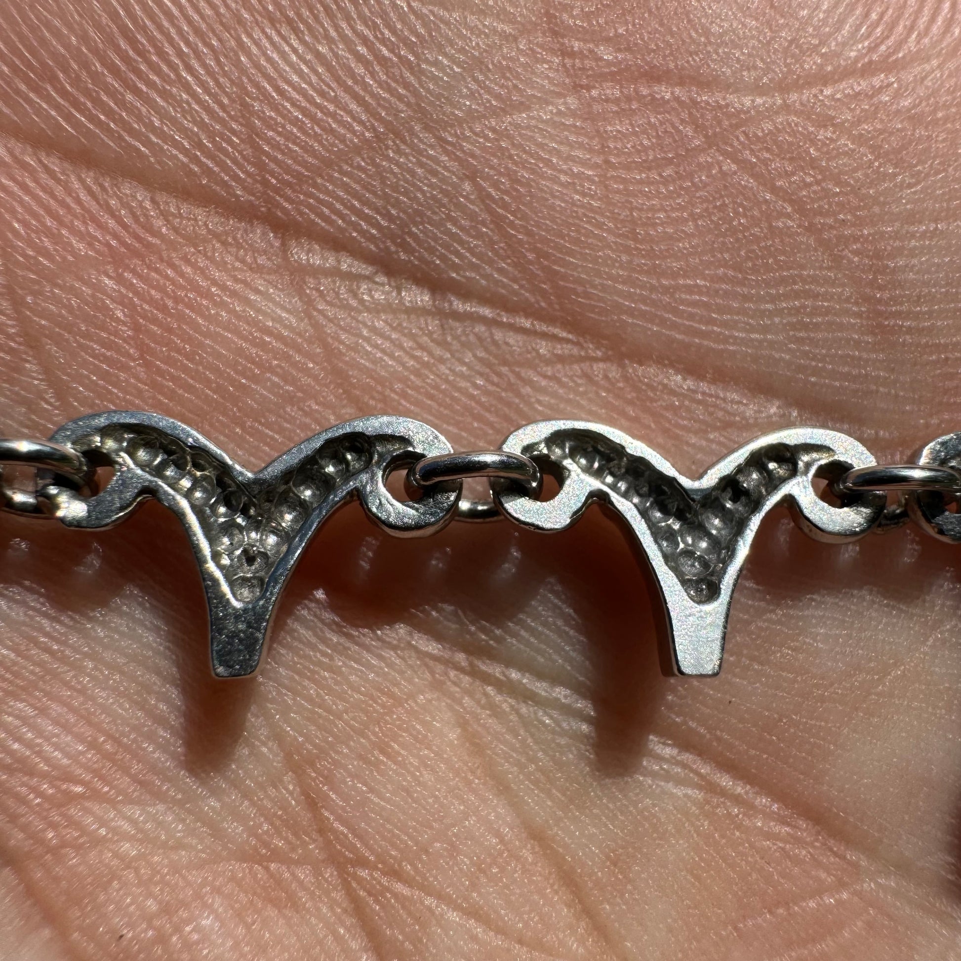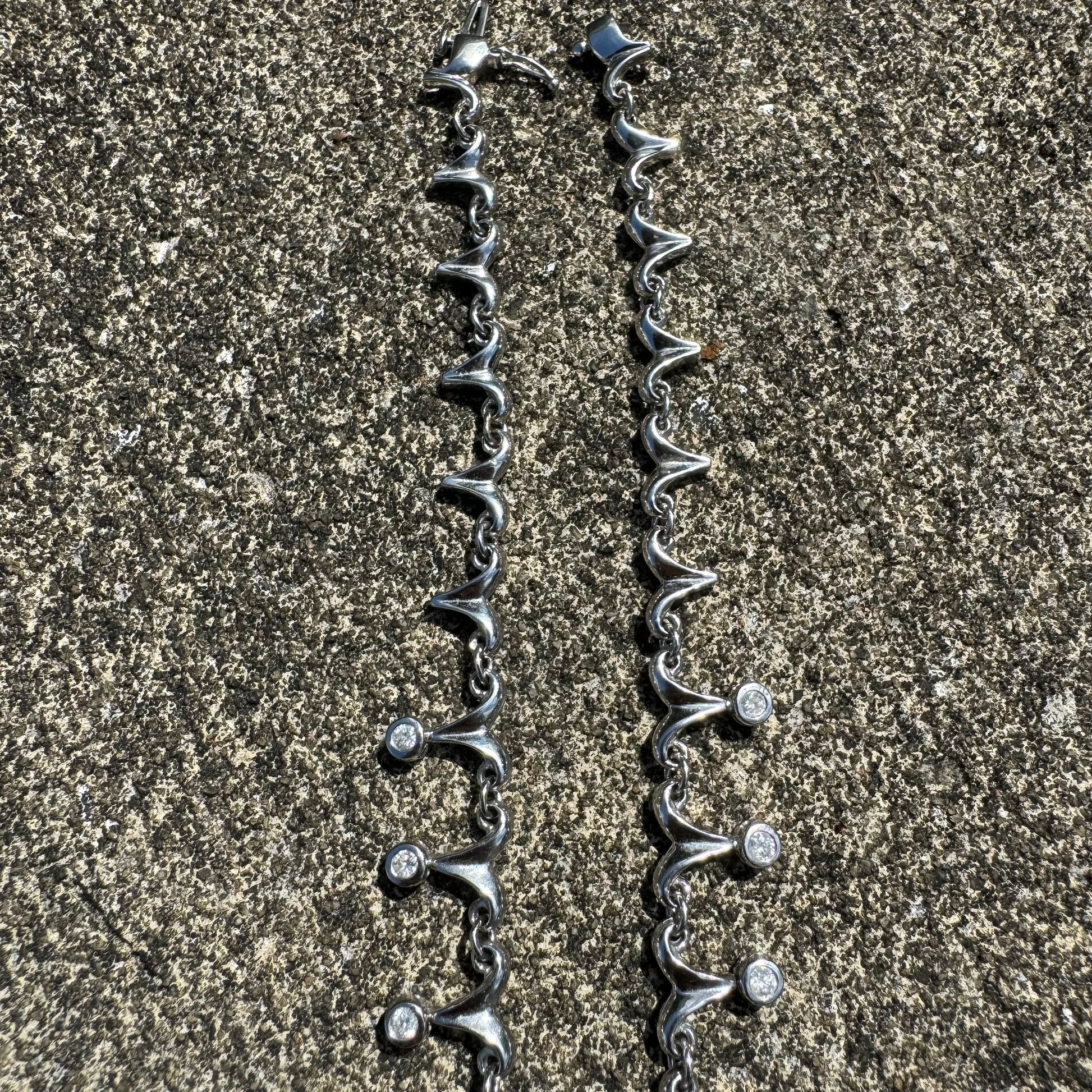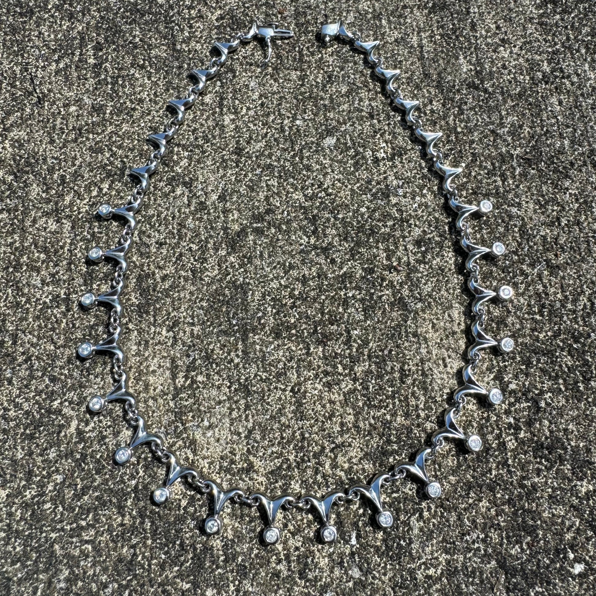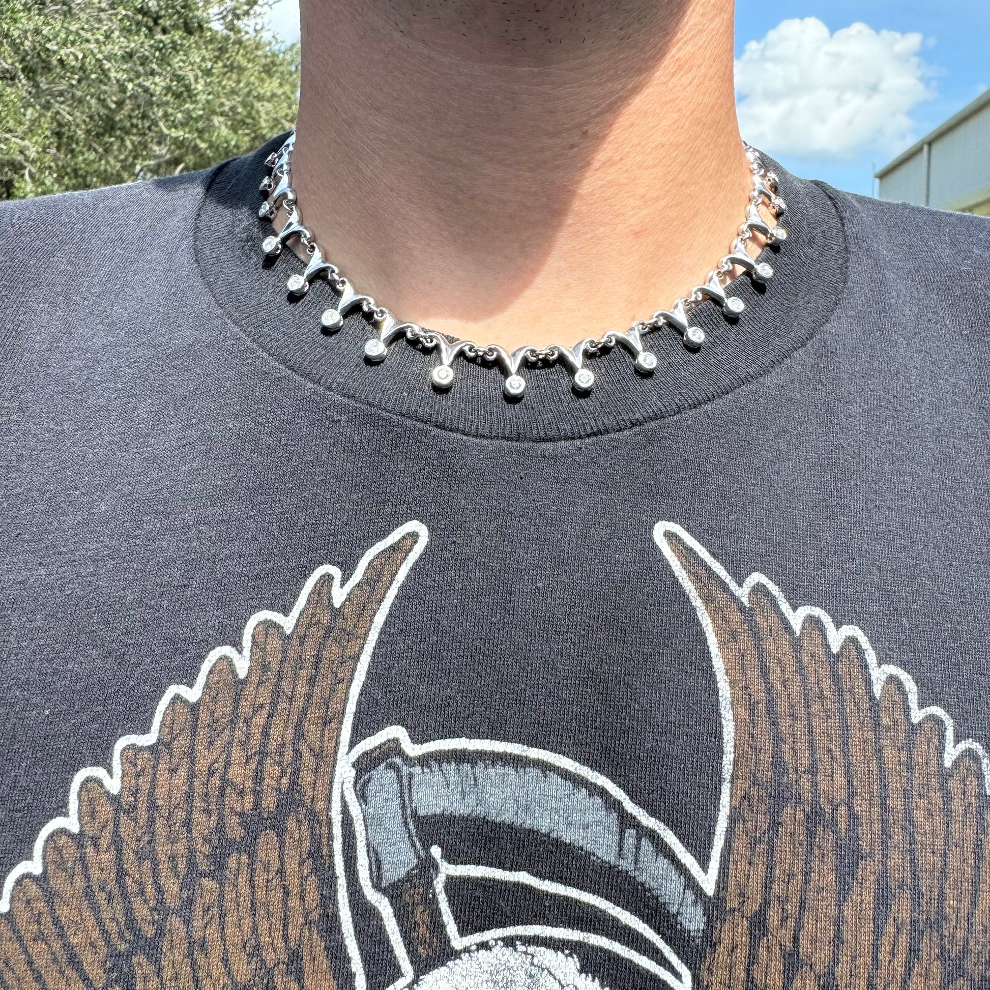 With an overall elegant yet dark and sinister looking vibe this necklace can be worn by a man or woman. Crafted out of solid 14k white gold with a hefty weight of approximately 33g this necklace lays down very comfortably just above the collarbone and consists of 18 natural diamond drops each totaling around .15ct with a combined 2.70ctw. As the Diamond drops give off class and elegance the sharp dagger like links just above give off the gothic and violent edge to add a beautiful mix of good vs evil. Measuring 16.5” end to end with a heavy duty box lock with security side latch the Diamond drop links measure 13mm as the dagger links taper upward to measure 8mm. I can imagine this being worn on the red carpet of an elegant event yet at the same time around a vampires neck.