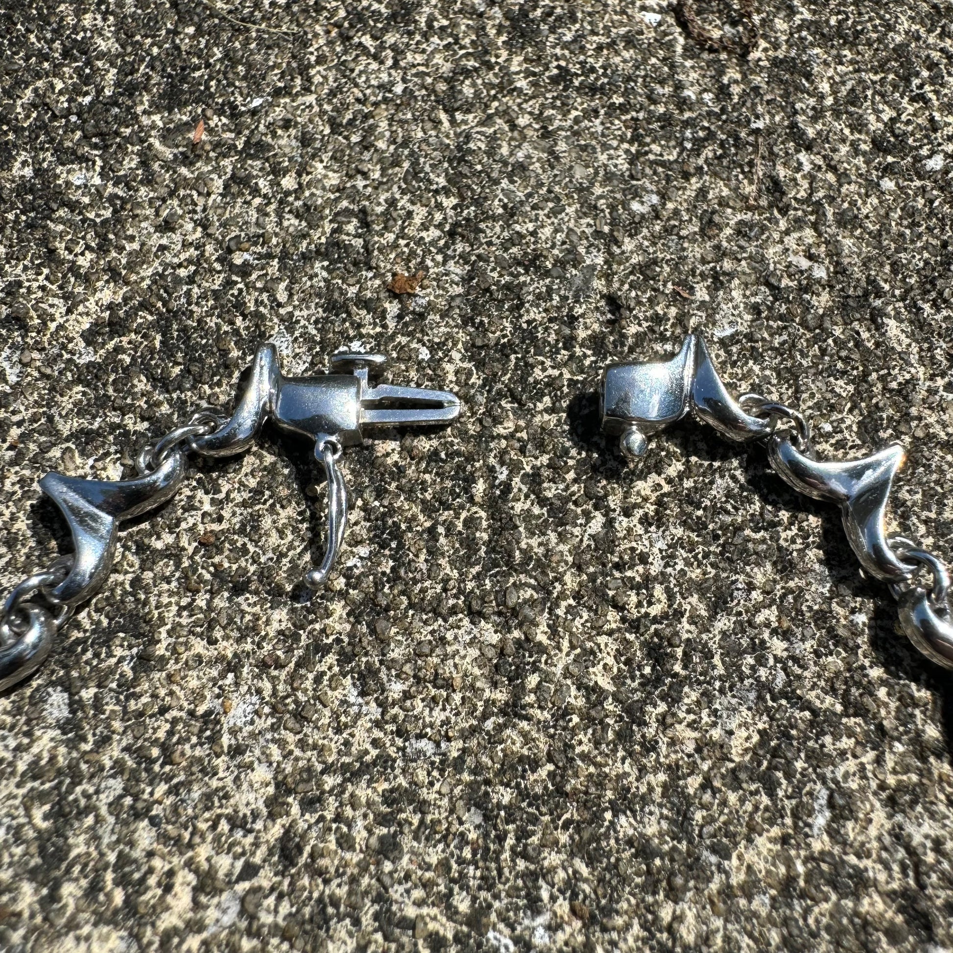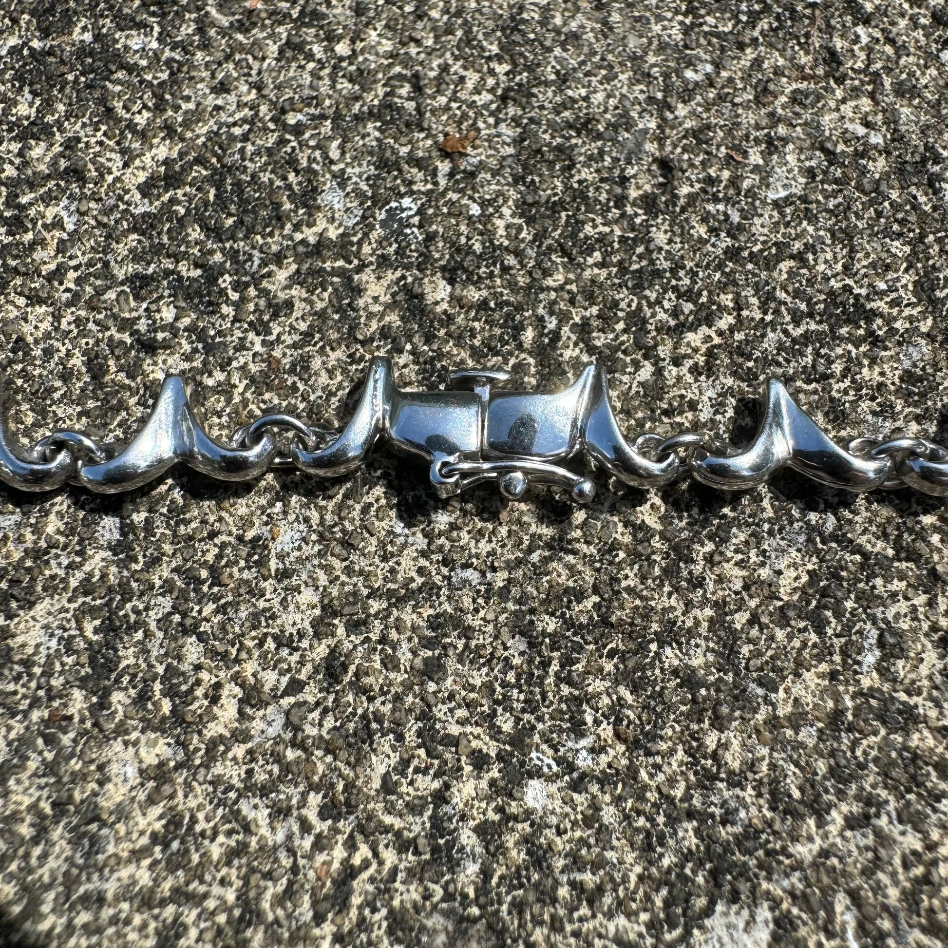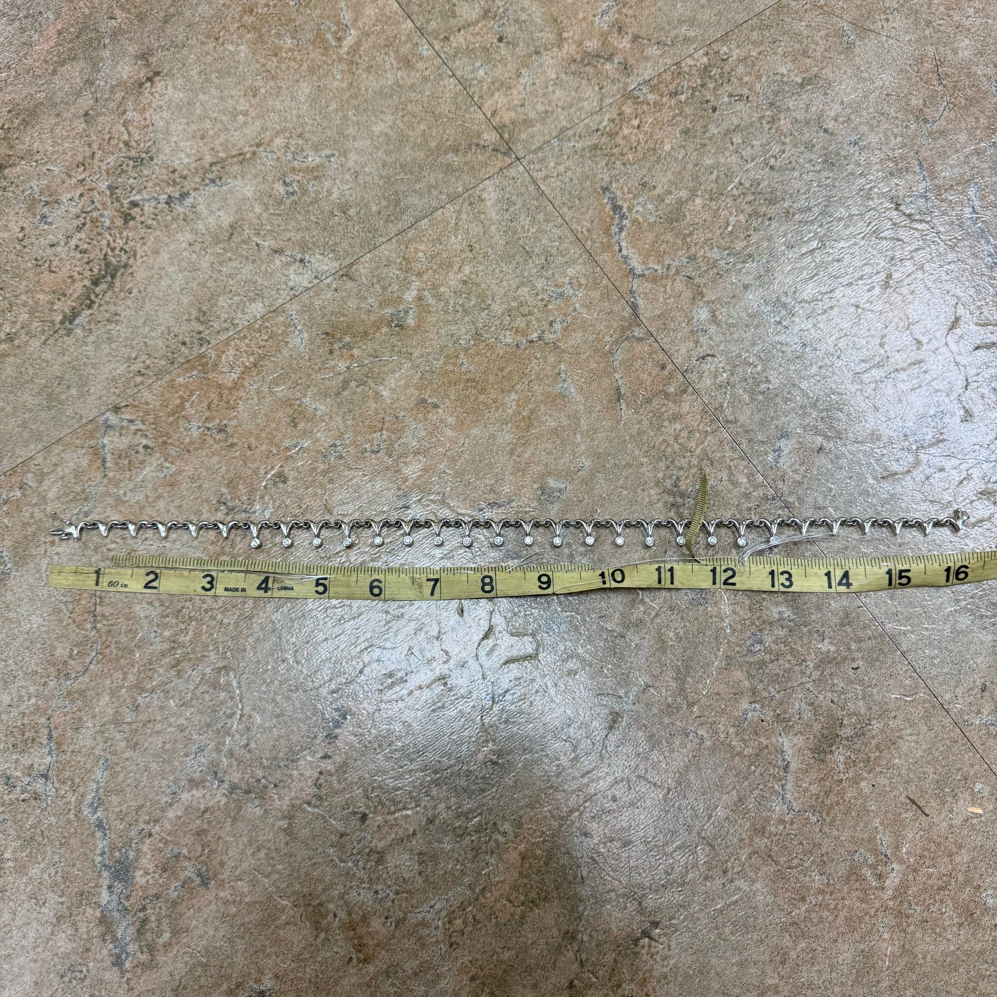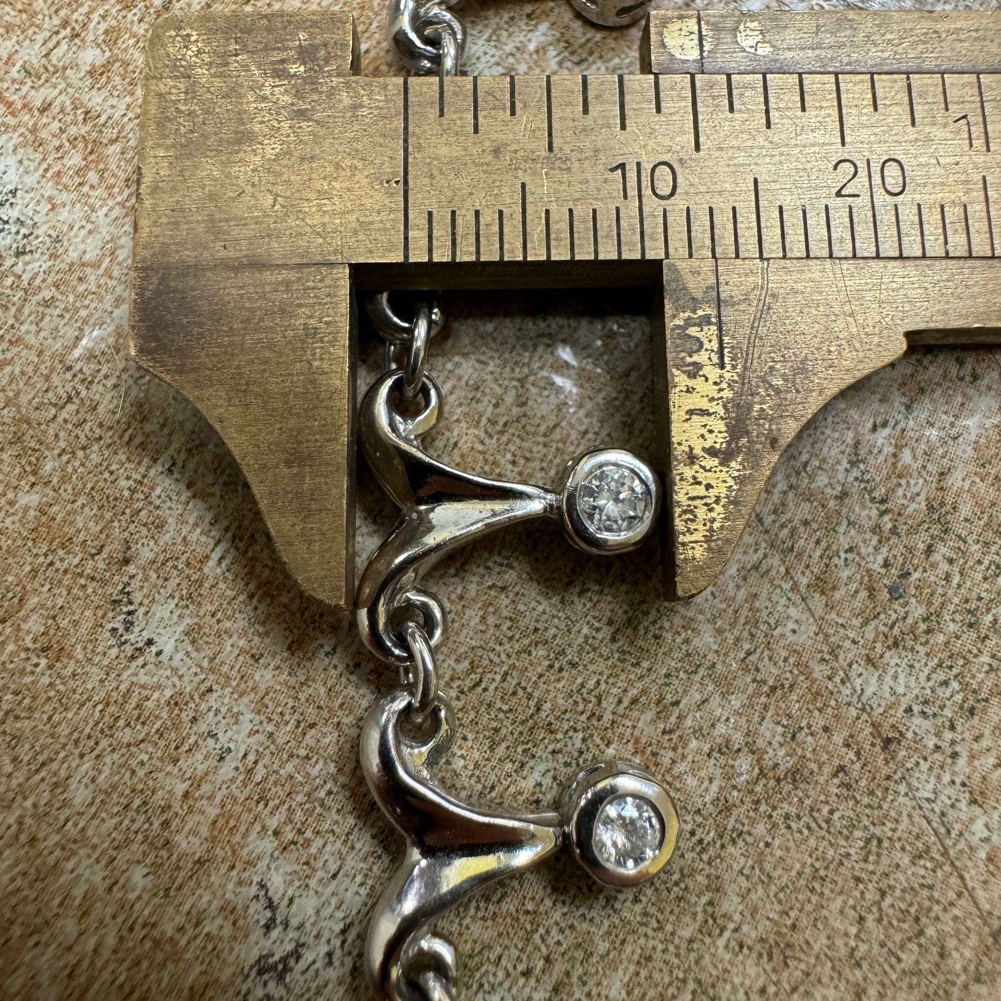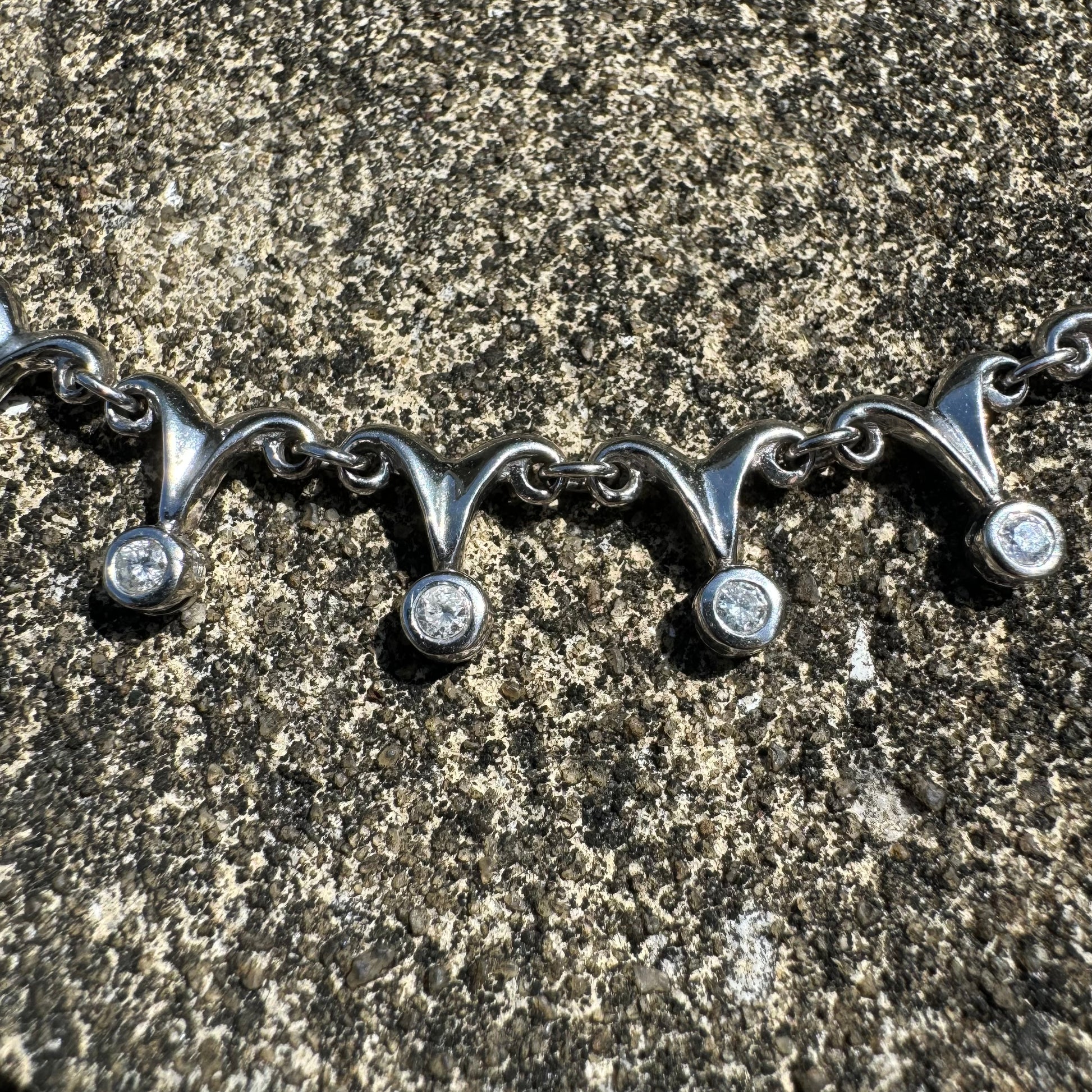 With an overall elegant yet dark and sinister looking vibe this necklace can be worn by a man or woman. Crafted out of solid 14k white gold with a hefty weight of approximately 33g this necklace lays down very comfortably just above the collarbone and consists of 18 natural diamond drops each totaling around .15ct with a combined 2.70ctw. As the Diamond drops give off class and elegance the sharp dagger like links just above give off the gothic and violent edge to add a beautiful mix of good vs evil. Measuring 16.5” end to end with a heavy duty box lock with security side latch the Diamond drop links measure 13mm as the dagger links taper upward to measure 8mm. I can imagine this being worn on the red carpet of an elegant event yet at the same time around a vampires neck.