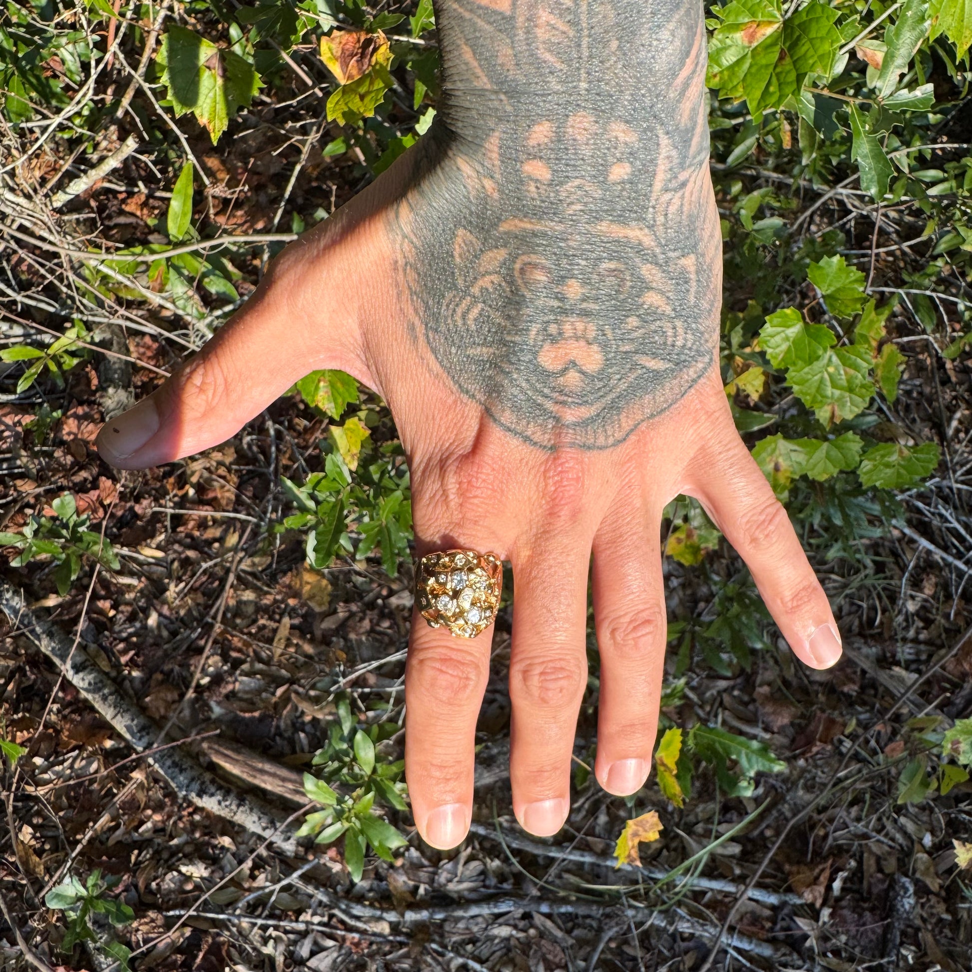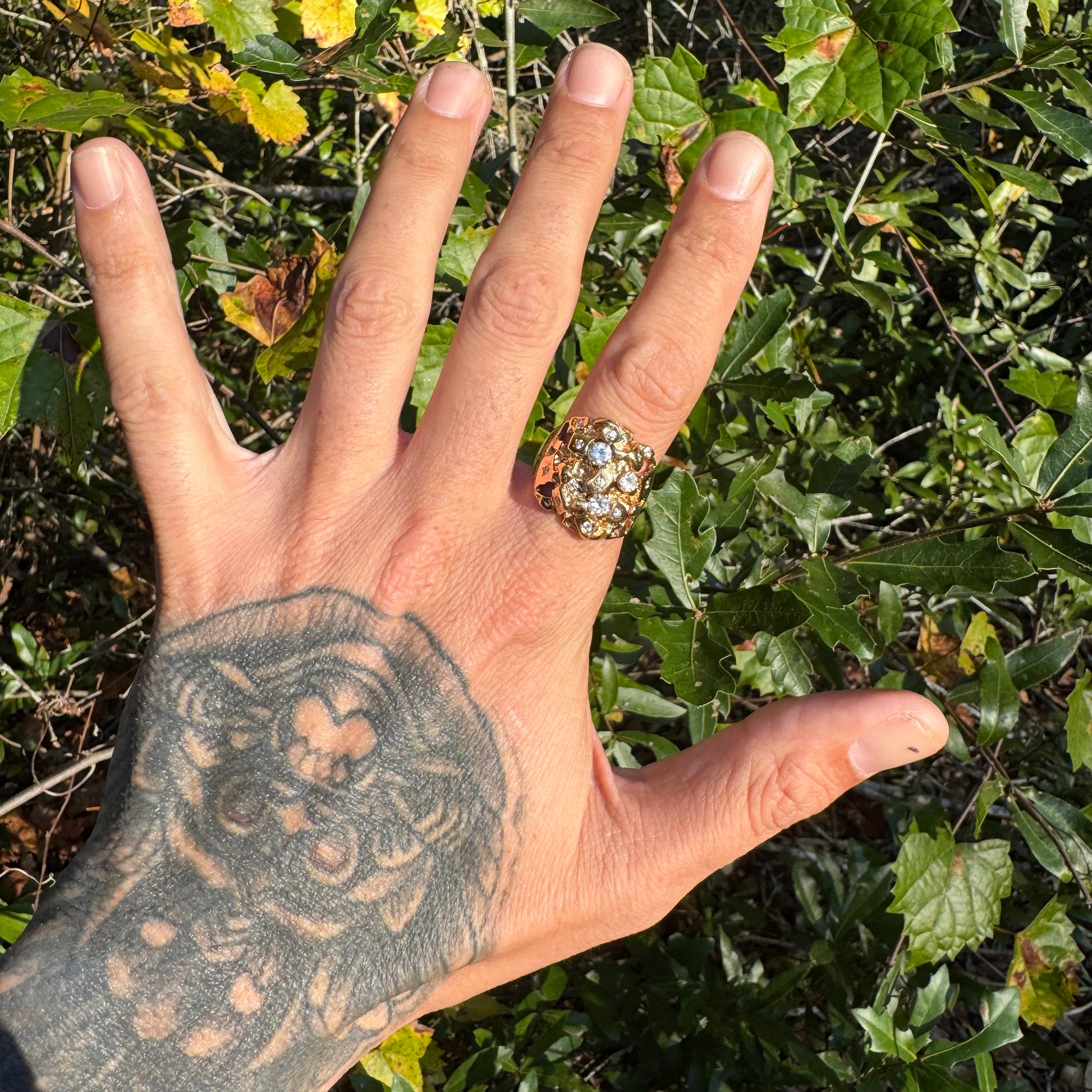 Crafted sometime around the 1980’s out of a vibrant solid and heavyweight 14k yellow gold this is a chunky beast of an old school brutalist style nugget ring. With over 1.0ctw of colorful and clean VS/SI natural diamonds that have been both flush and prong set fully around the entirety of the ring with the largest diamond at approximately .30ct. Weighing in at a hefty 12.7g this ring fits just around a 9.25 with a large take up of the finger at around 21.5mm. This piece was made with the utmost attention to detail and craftsmanship that is apparent even more when you have it in hand and on the finger.