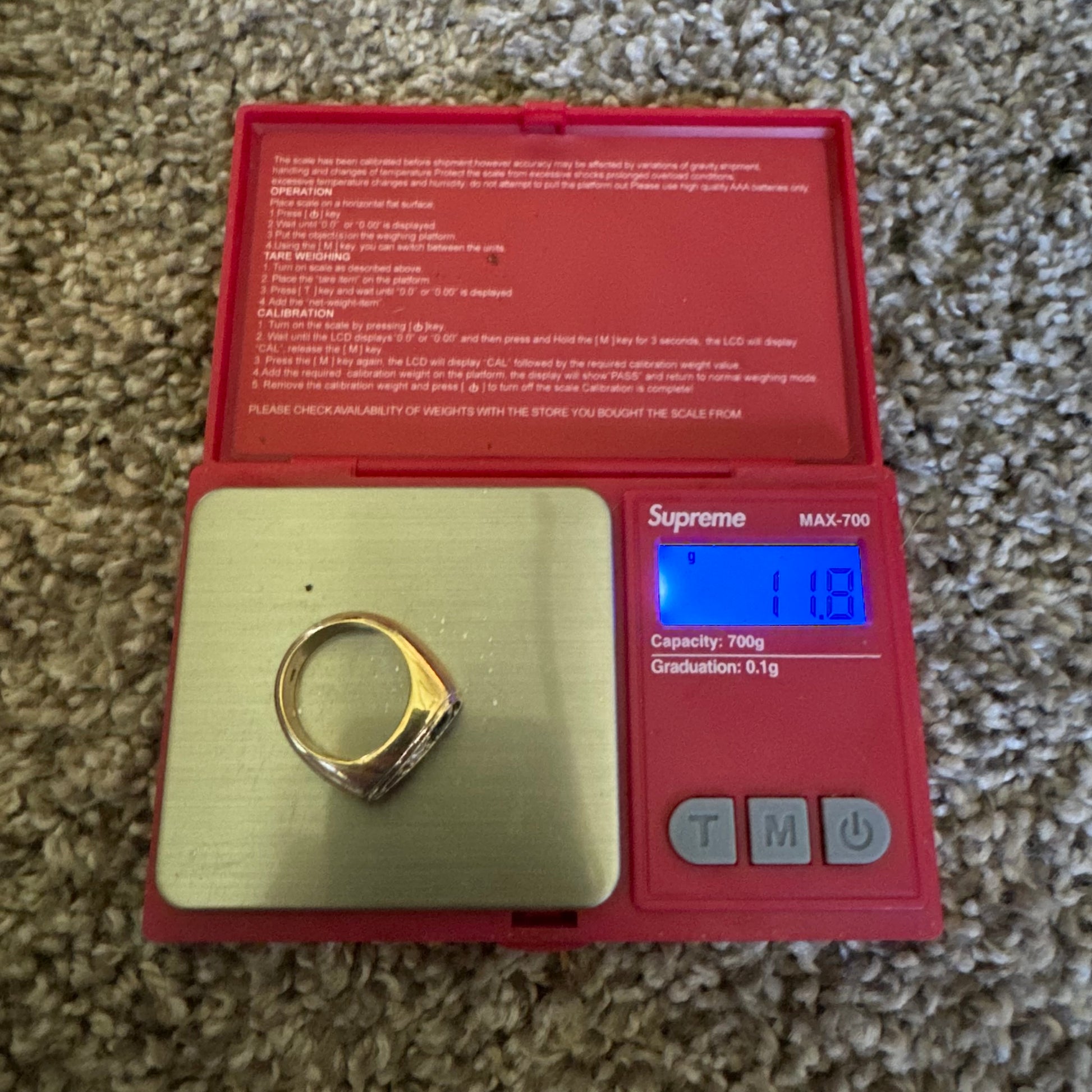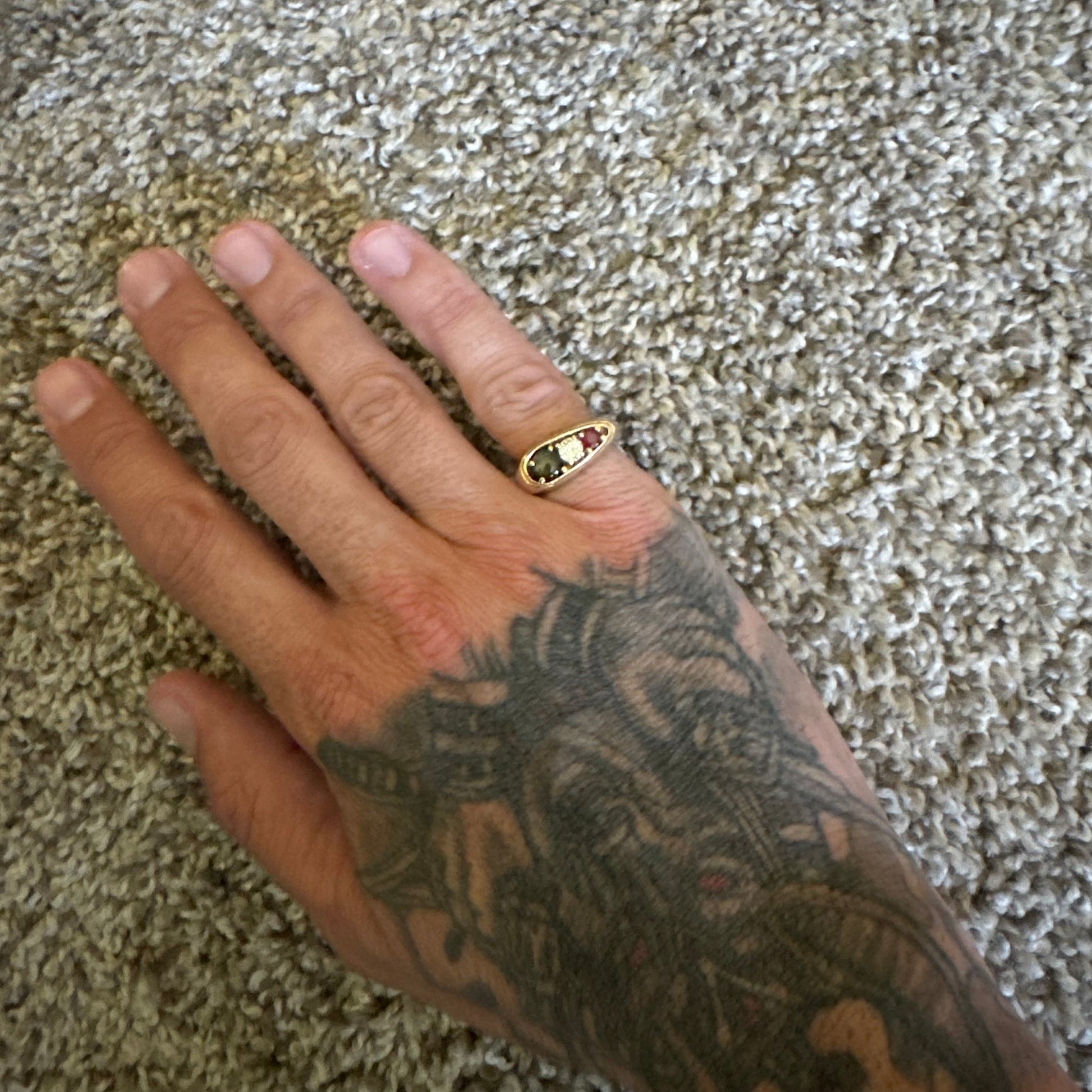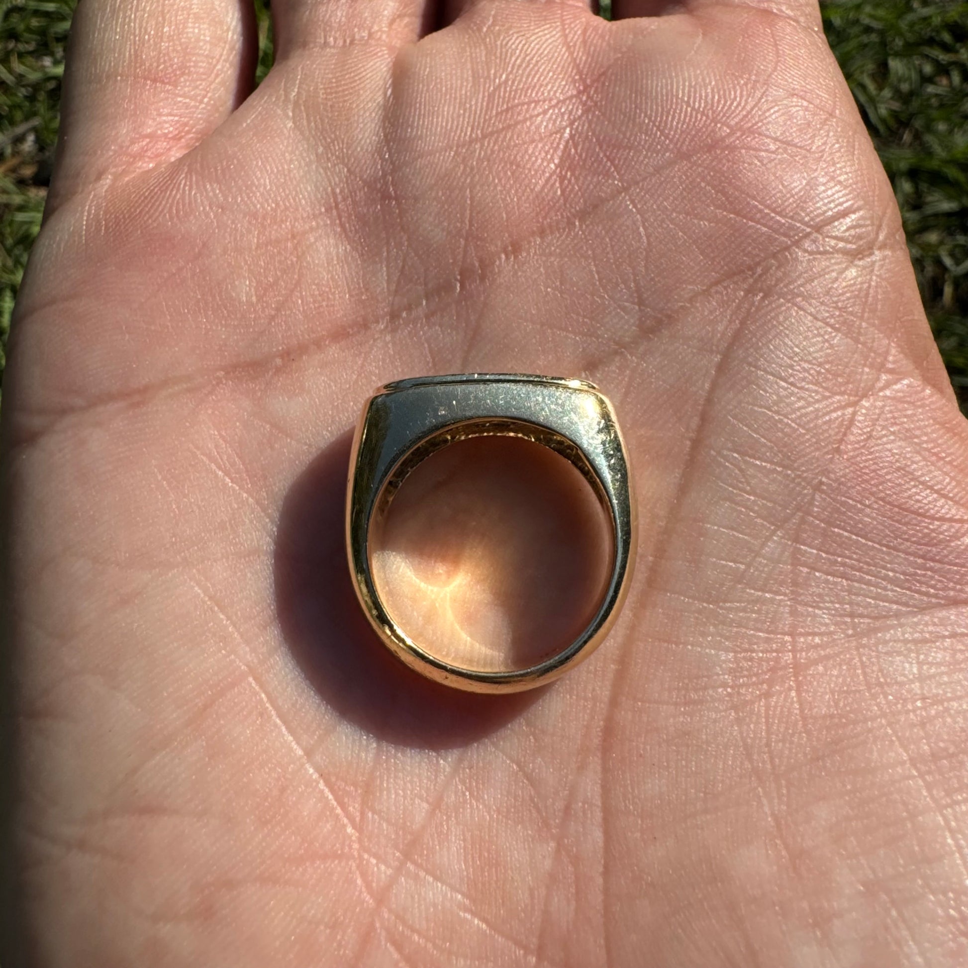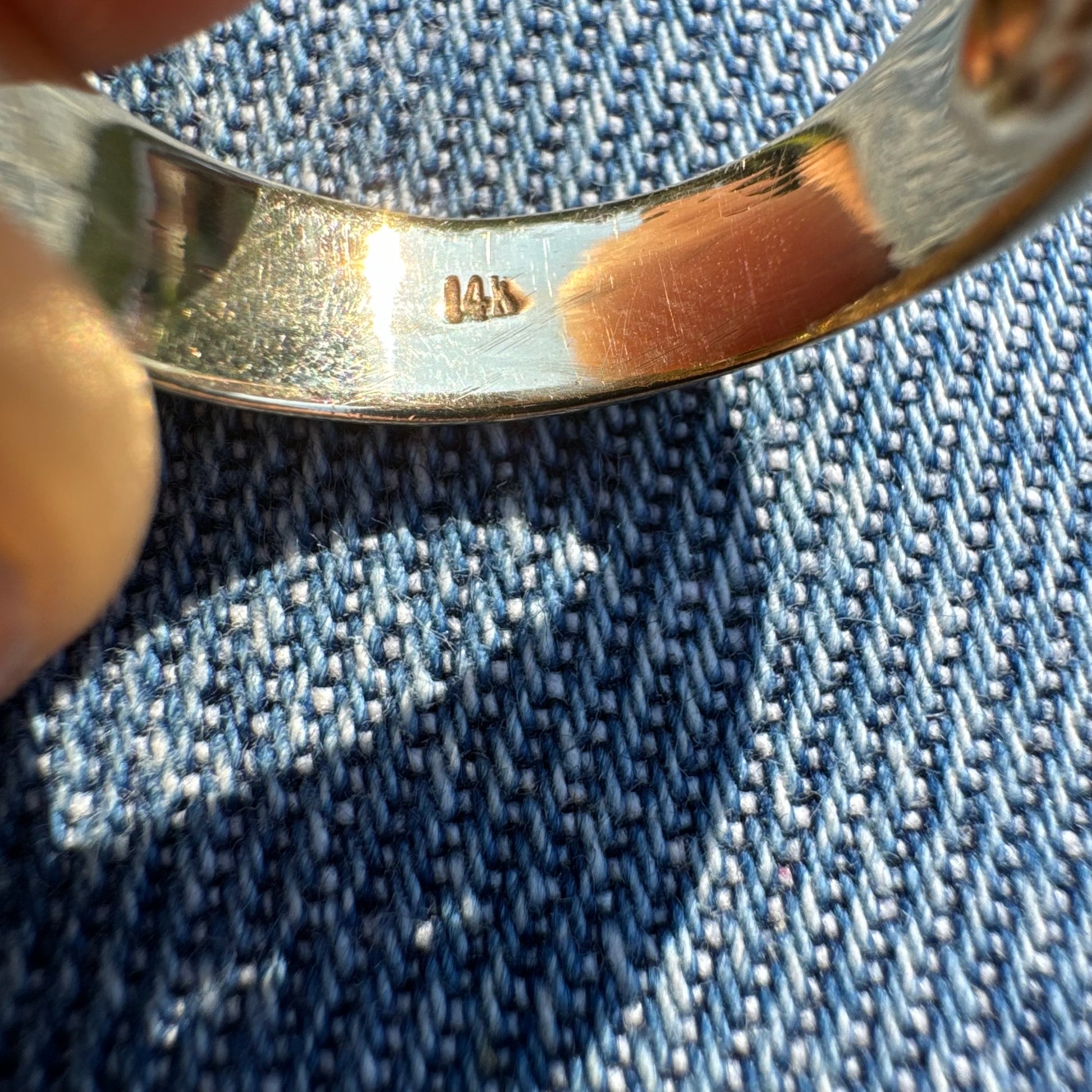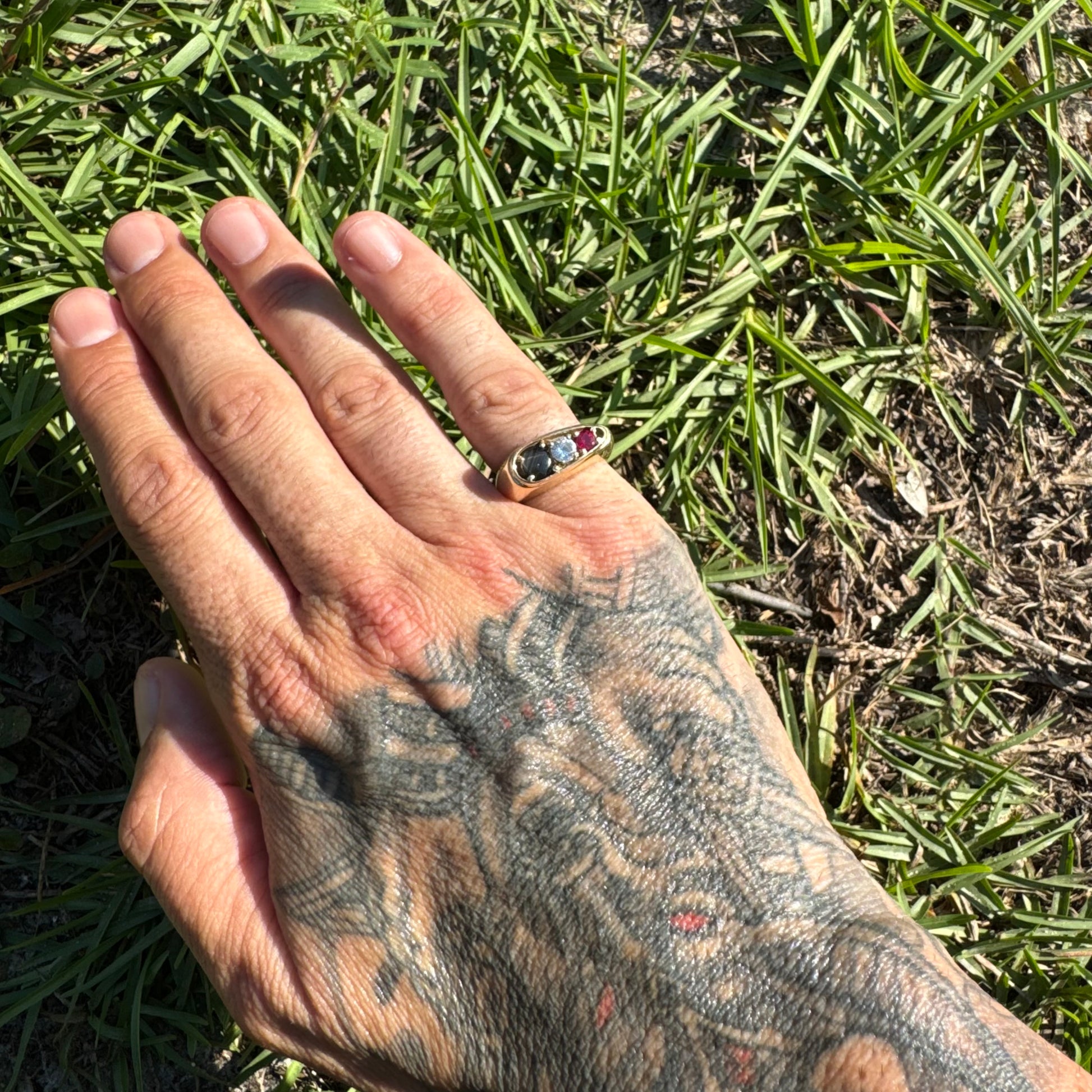 Circa 1970’s-1980’s weighing in at a hefty 11.8g of all solid, very chunky, and strong 14k yellow gold is this beautifully crafted modernist style statement piece. With a stunning large black star sapphire on the inner rounded edge, a super vivid and large .40ct ( 4.5mm in circumference) natural diamond smack dab in the center, and then a glowing pinkish red natural ruby on the outer pointed edge of the ring all sturdily prong set into the center valley this is a unique and really cool look. Whether worn on an outer finger like the index or the pinky or whether the rounded edge or pointed edge is facing out or in its a bad ass statement piece that will get a lot of looks and conversation. Very thick bottom shank at 6mm x 2mm the ring is approximately fitting of a size:7.75 with a broad posture on the finger at 21MM x 9mm. This is a real serious ring that’s waaaayyyyy better in person than any of these pics can try to show.