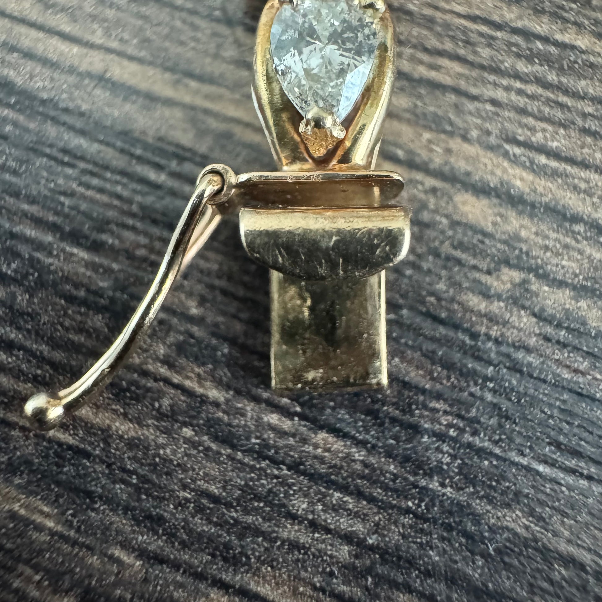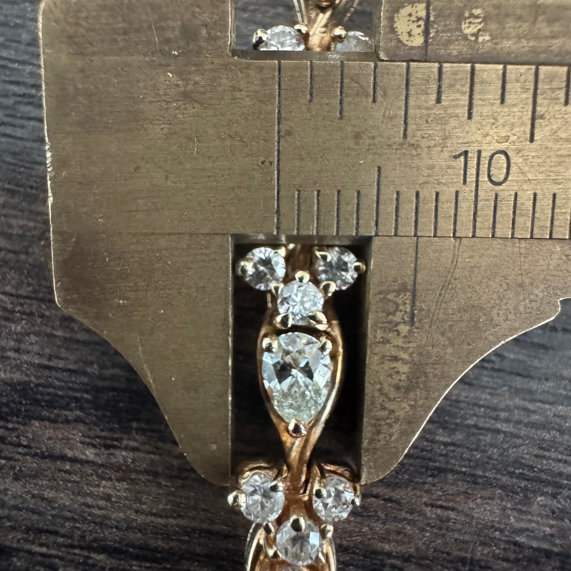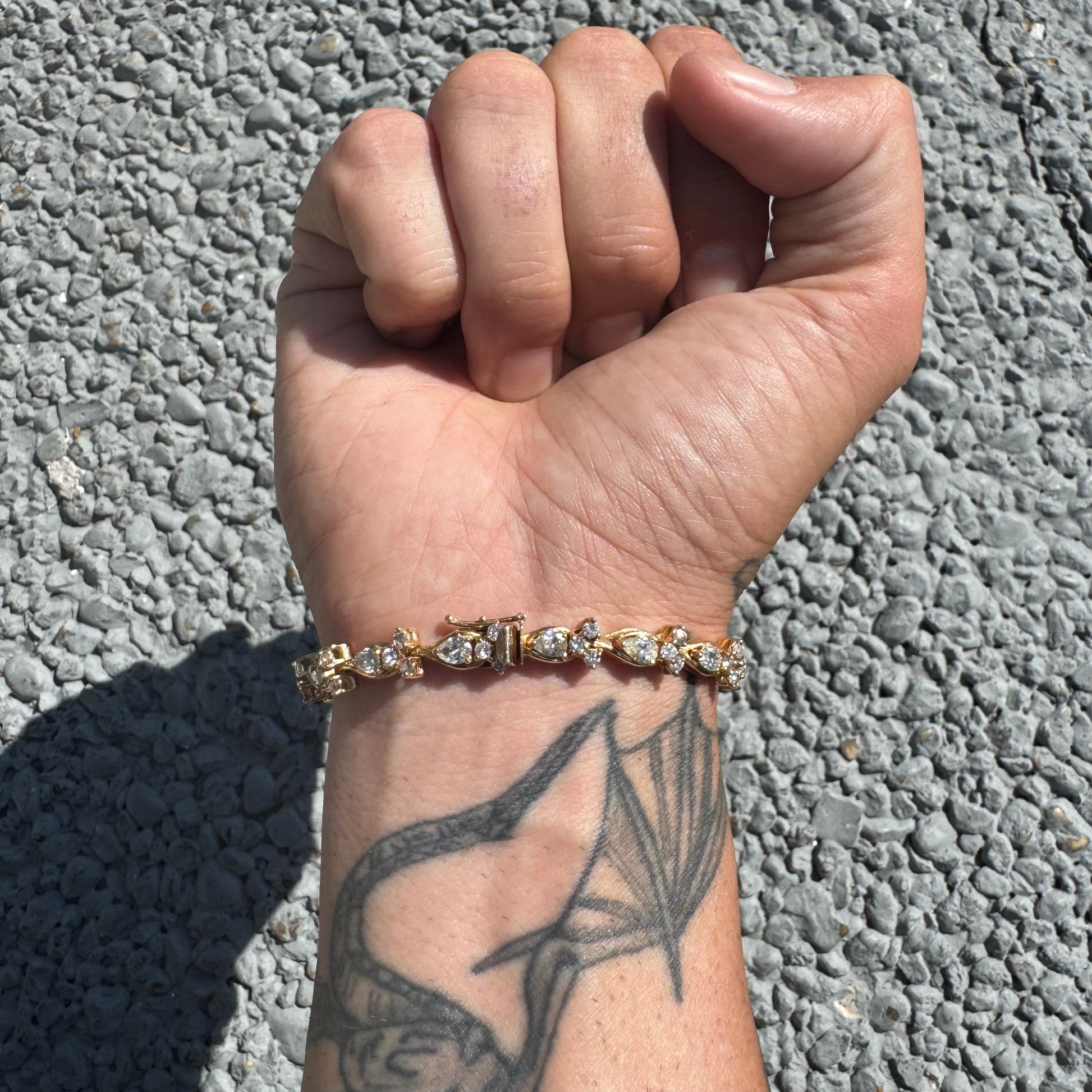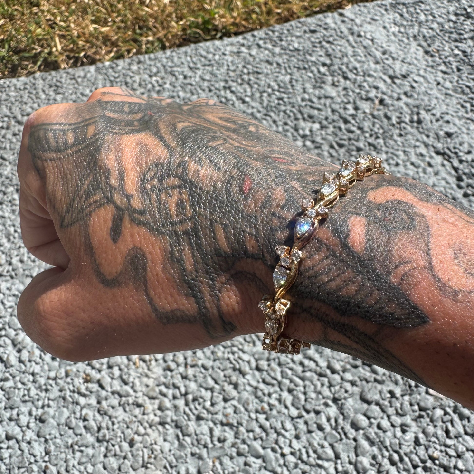 One of the best Diamond bracelets I’ve ever sourced and had in my inventory, hands down. Crafted out of a solid, thick and chunky, heavyweight 14k yellow gold there’s approximately 6.0ctw of 60 all natural diamonds. With 15 hinged station sections consisting of around .40ctw of the 4 diamonds each respectively. The main pear cut diamonds are about .25ct each with the round brilliant cut diamonds at about .05ct each. Sized at a wearable 7” (7.35” end to end) and 7mm wide by 5mm thick this hunk weighs in at 19.1g. An amazing price for a top tier quality diamond bracelet.
