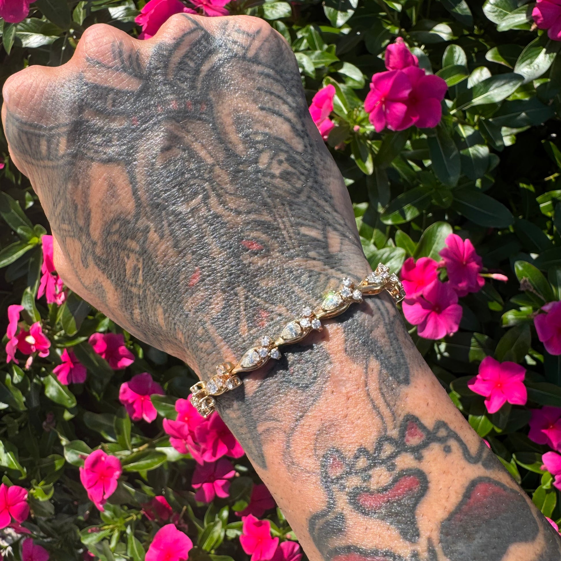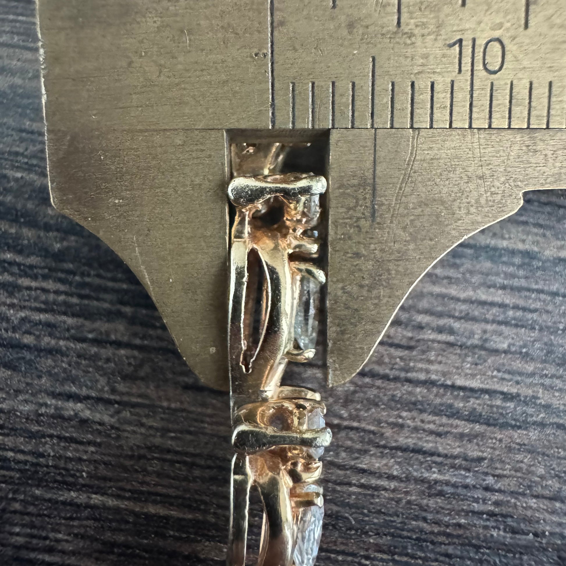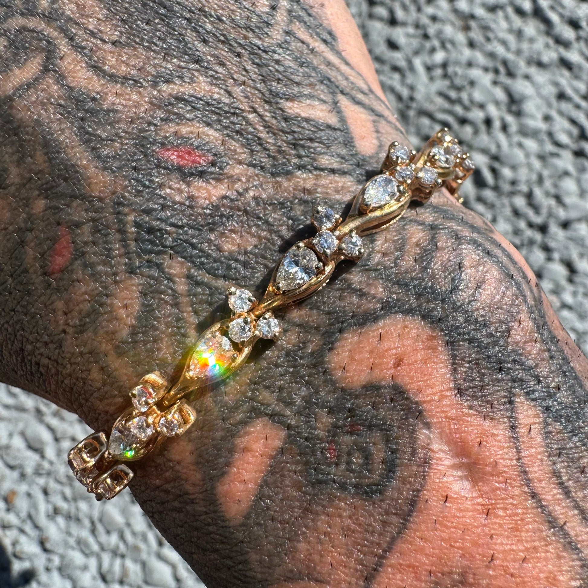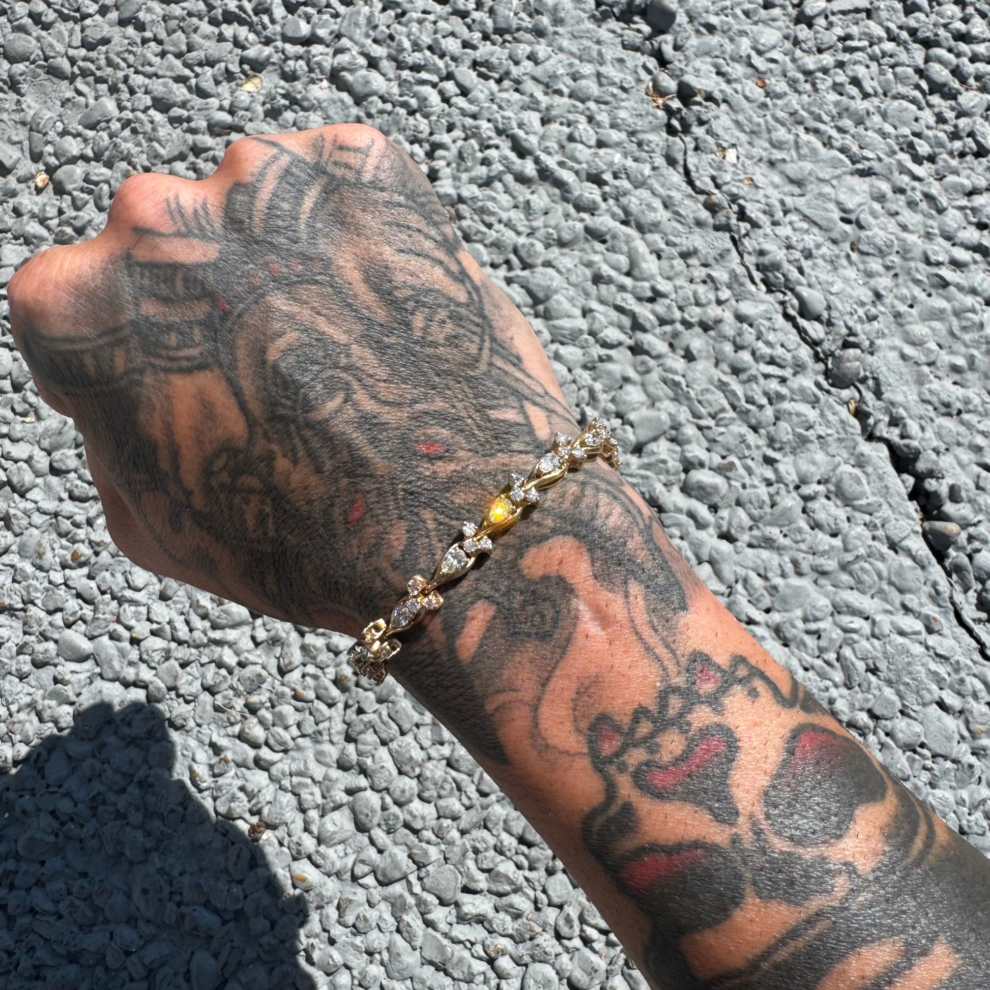 One of the best Diamond bracelets I’ve ever sourced and had in my inventory, hands down. Crafted out of a solid, thick and chunky, heavyweight 14k yellow gold there’s approximately 6.0ctw of 60 all natural diamonds. With 15 hinged station sections consisting of around .40ctw of the 4 diamonds each respectively. The main pear cut diamonds are about .25ct each with the round brilliant cut diamonds at about .05ct each. Sized at a wearable 7” (7.35” end to end) and 7mm wide by 5mm thick this hunk weighs in at 19.1g. An amazing price for a top tier quality diamond bracelet.