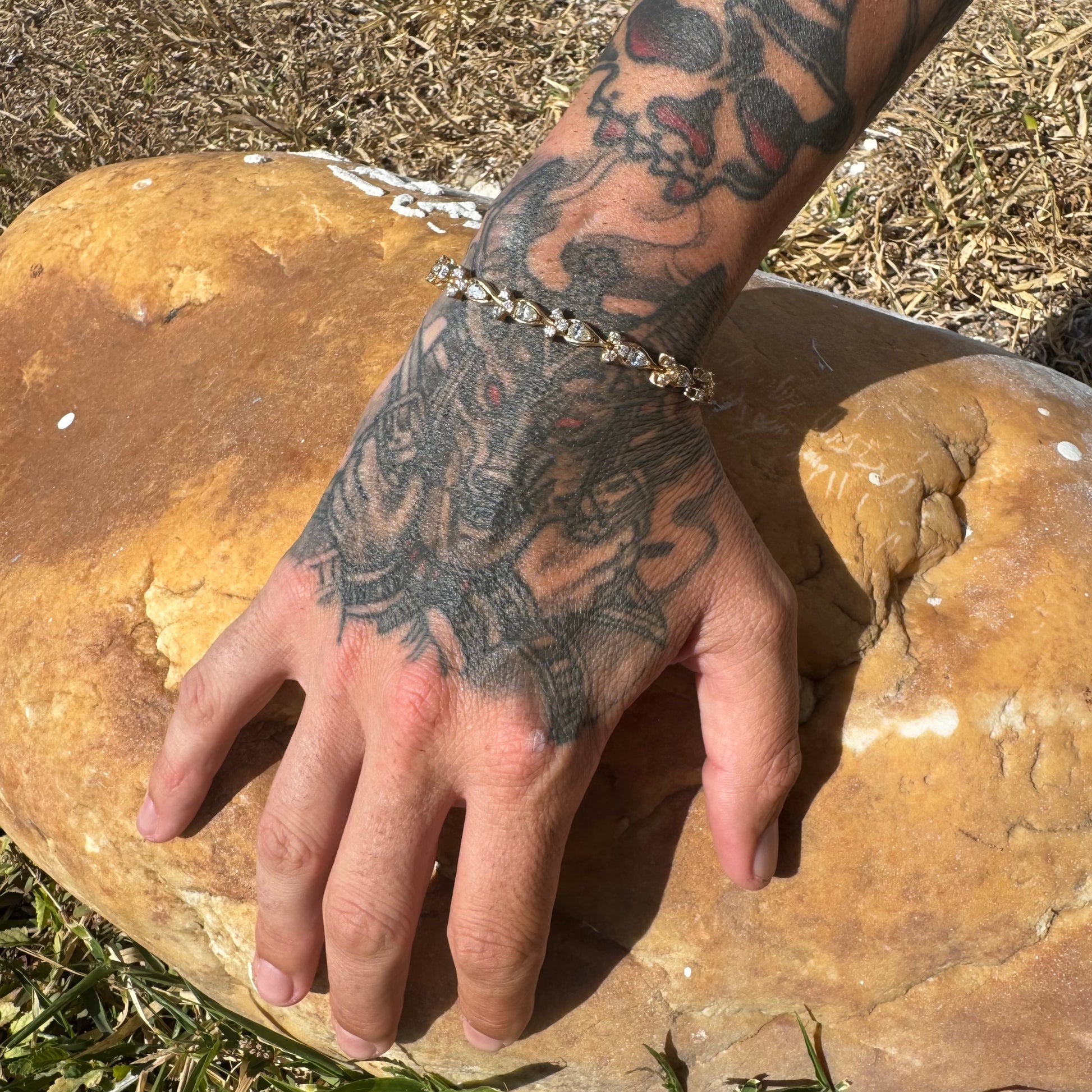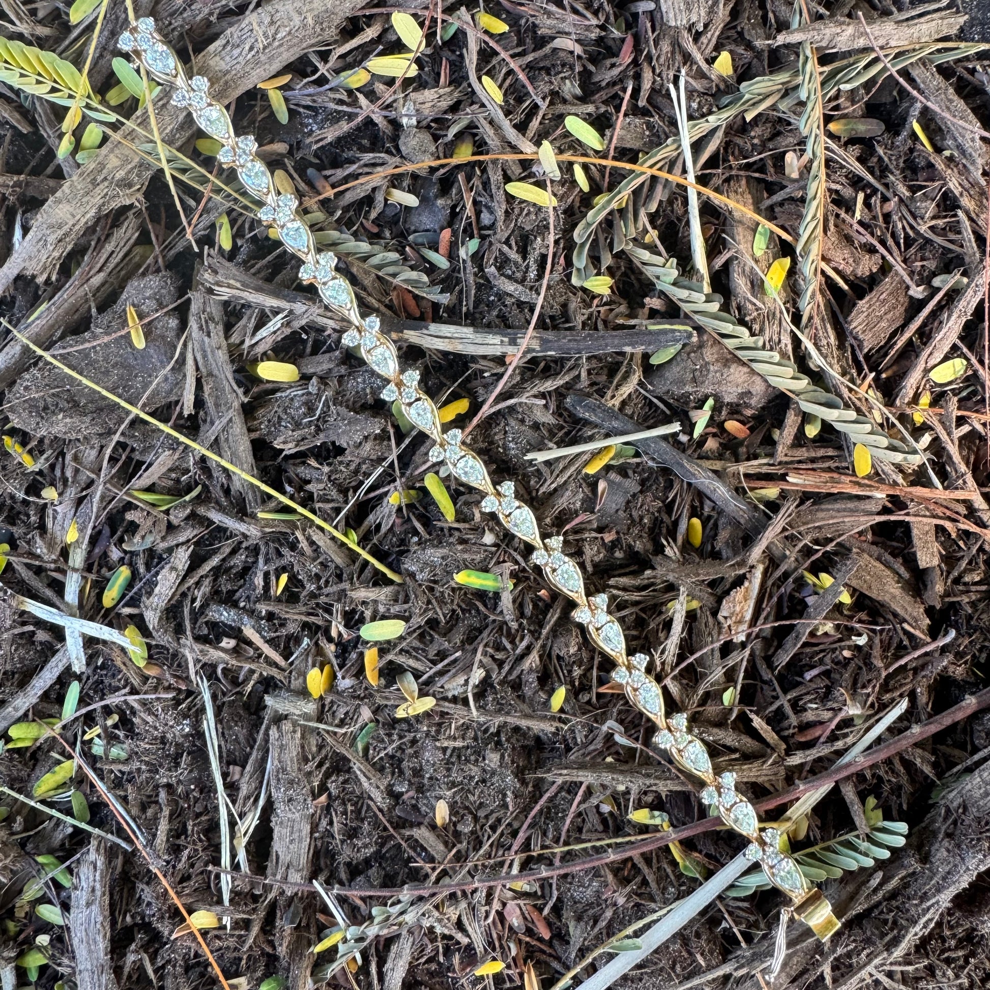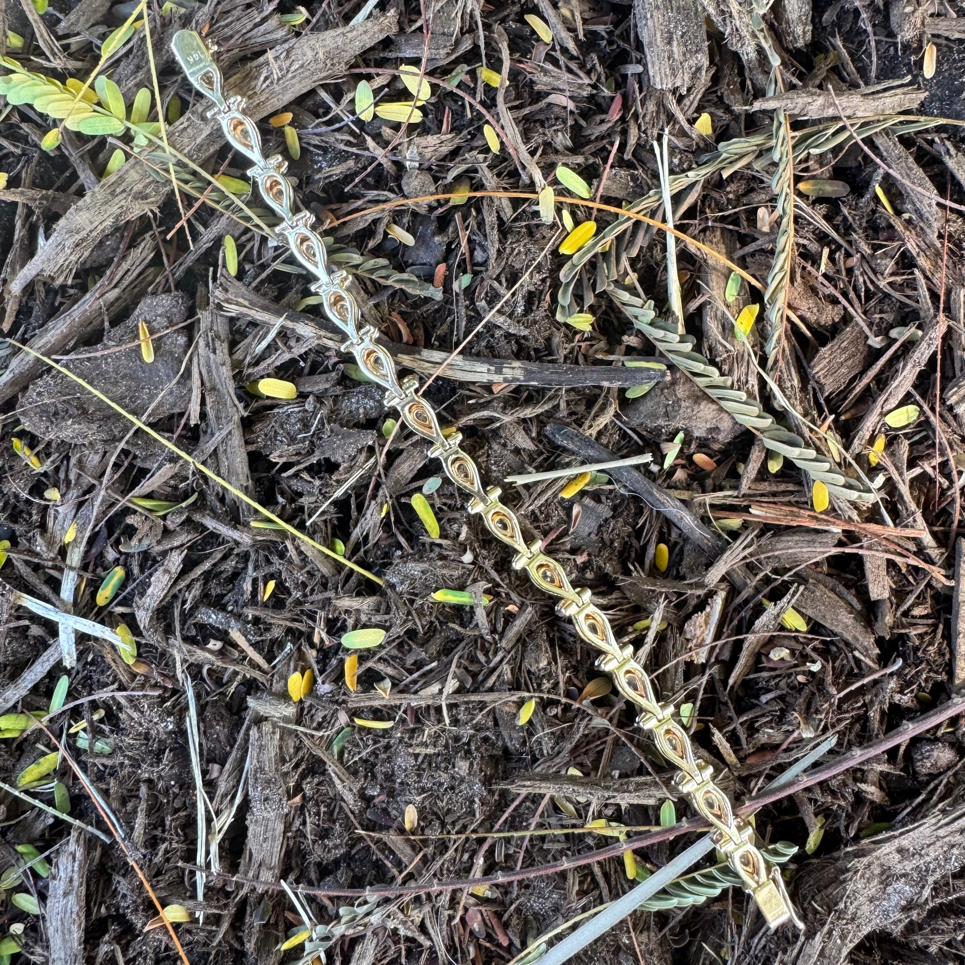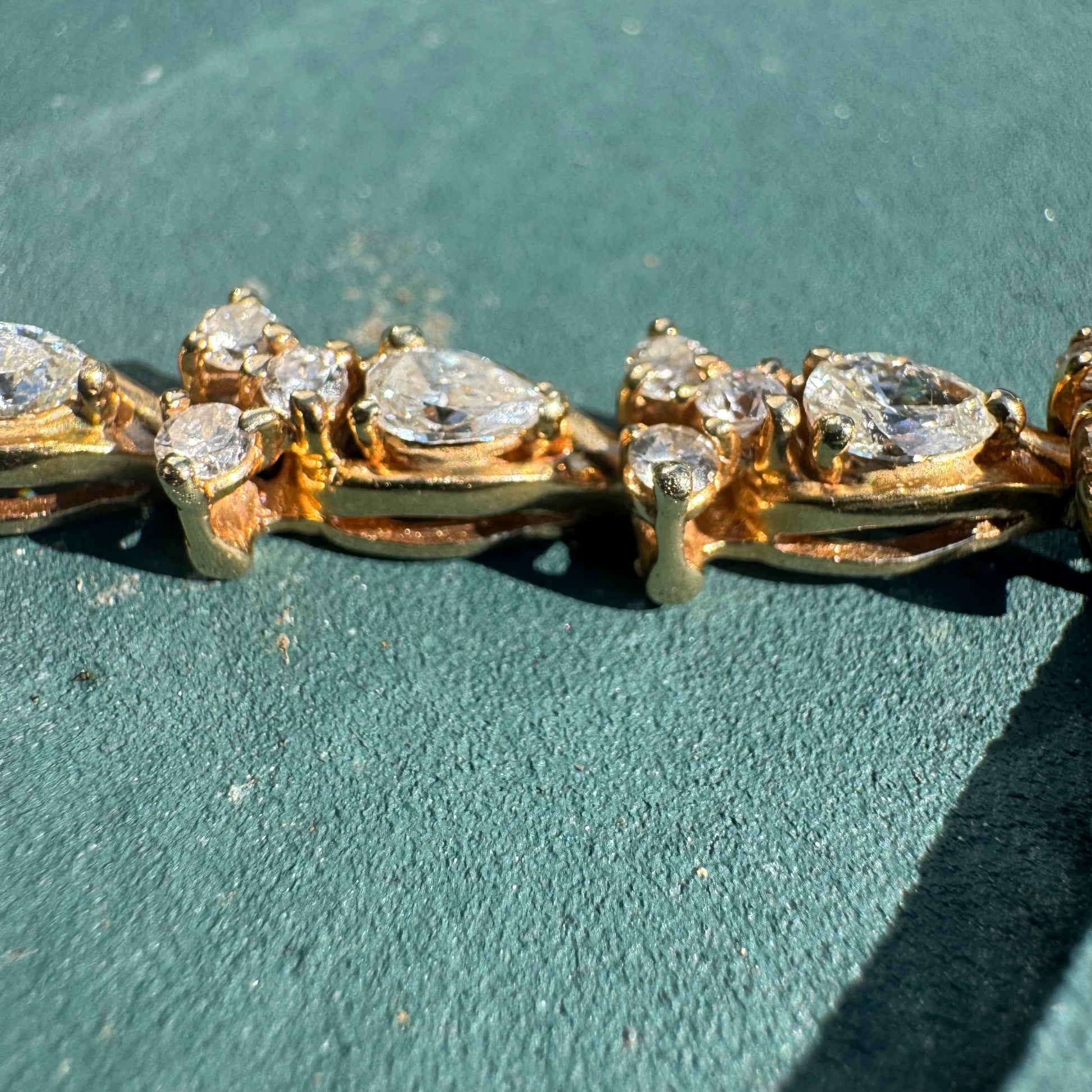 One of the best Diamond bracelets I’ve ever sourced and had in my inventory, hands down. Crafted out of a solid, thick and chunky, heavyweight 14k yellow gold there’s approximately 6.0ctw of 60 all natural diamonds. With 15 hinged station sections consisting of around .40ctw of the 4 diamonds each respectively. The main pear cut diamonds are about .25ct each with the round brilliant cut diamonds at about .05ct each. Sized at a wearable 7” (7.35” end to end) and 7mm wide by 5mm thick this hunk weighs in at 19.1g. An amazing price for a top tier quality diamond bracelet.