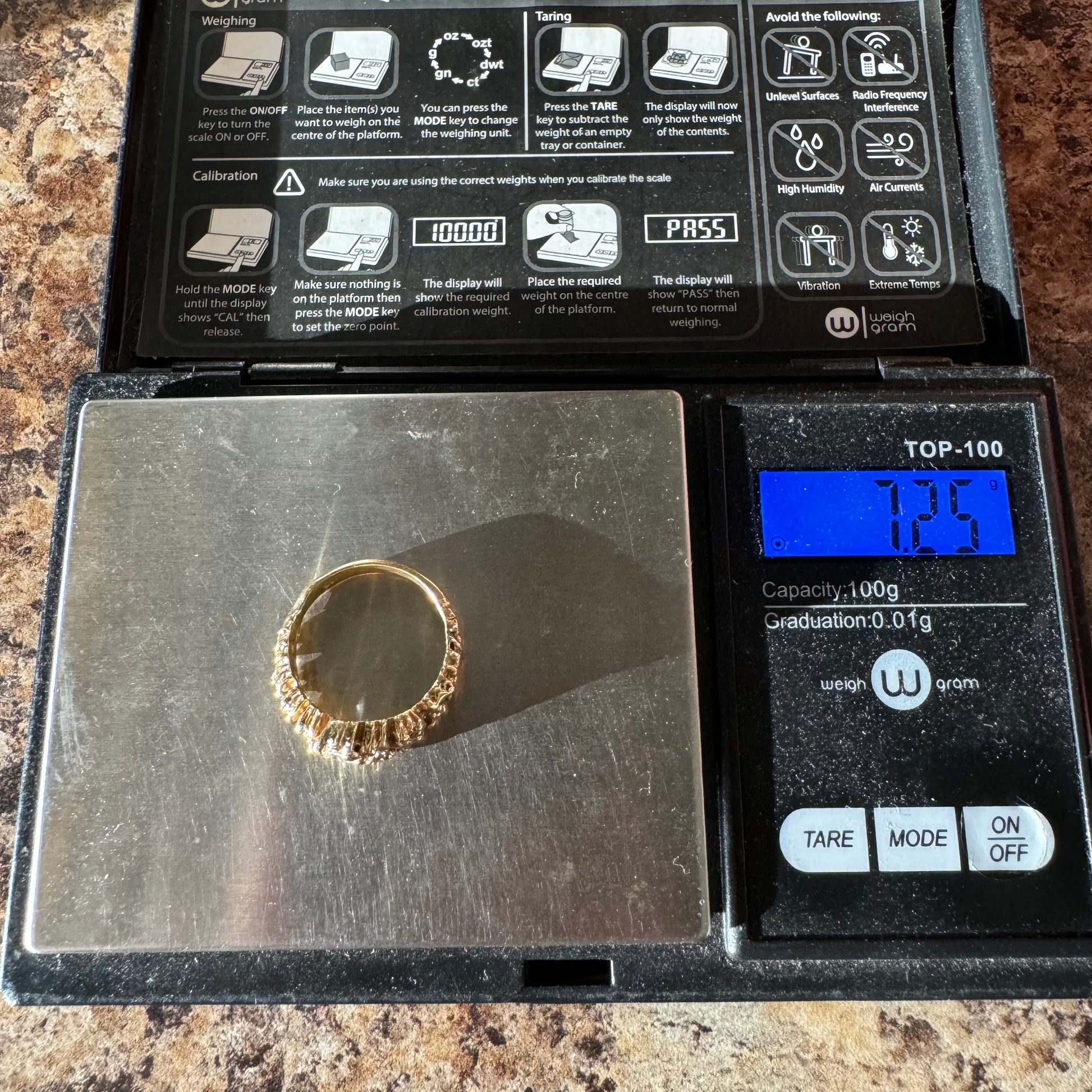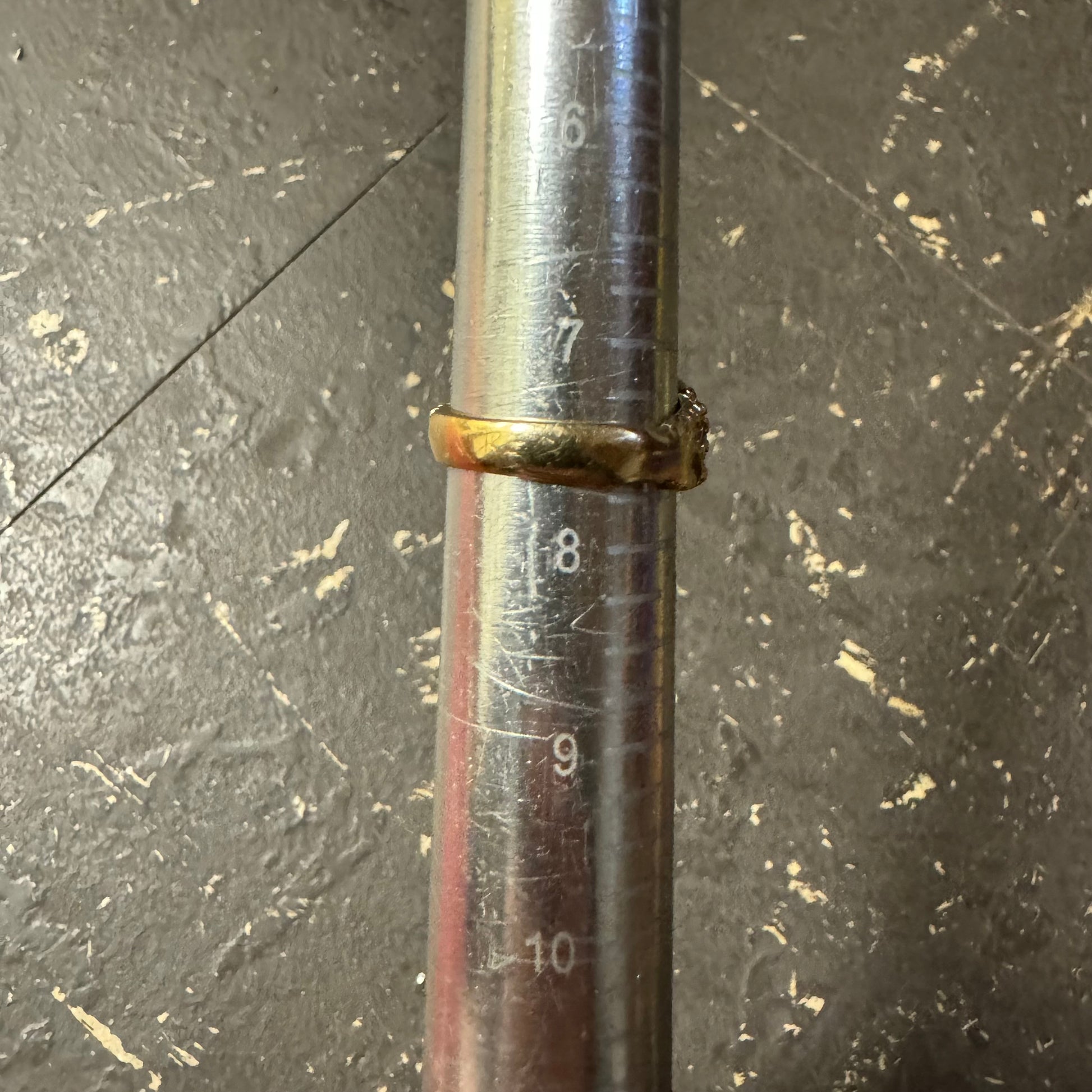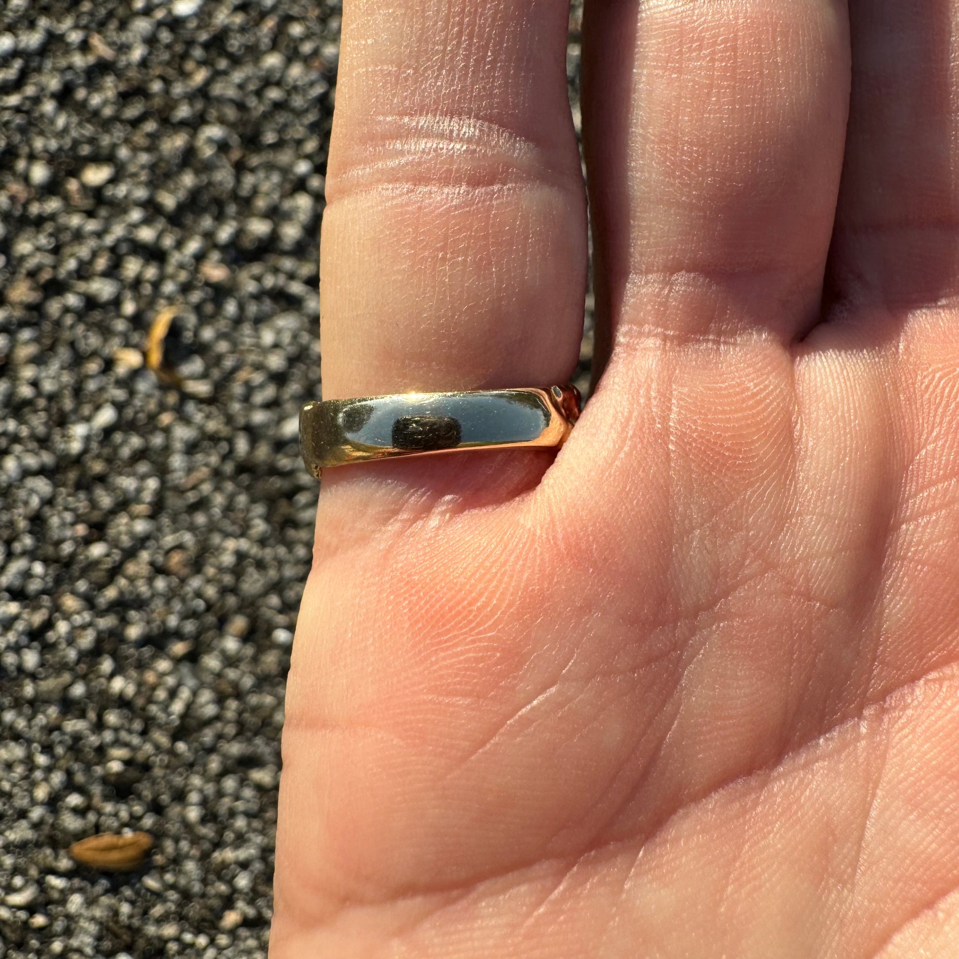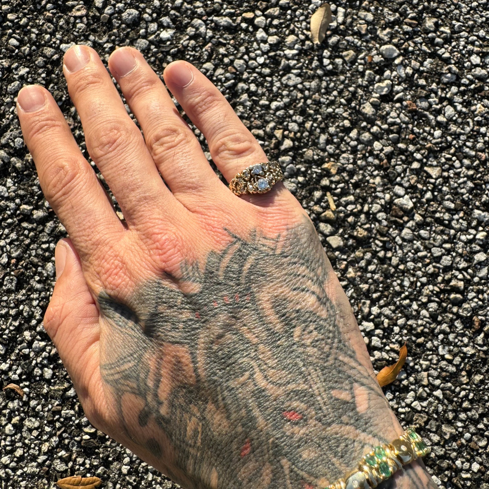 Let’s get that big bad center stone out of the way as it’s approximately .35ct of a super eye clean quality natural diamond surrounded next to a cluster of .55ctw of additional diamonds. Set in a solid 14k yellow gold brutalist Nugget style this ring is tough as nails. Sized at approximately a 7.5 and weighing 7.25g this one is pure bad ass with a clean and elegant look.