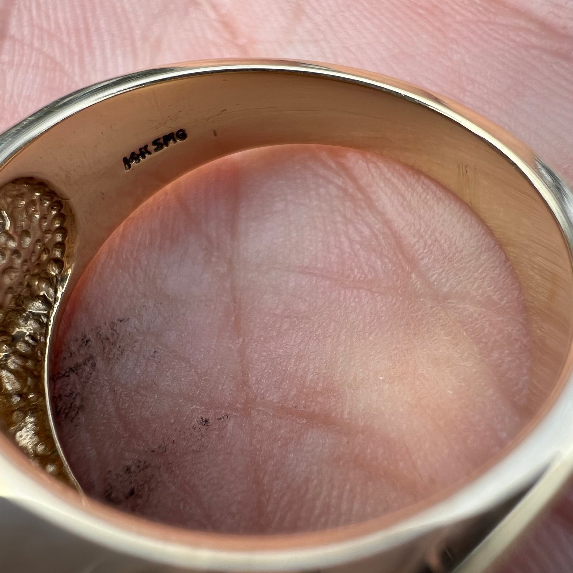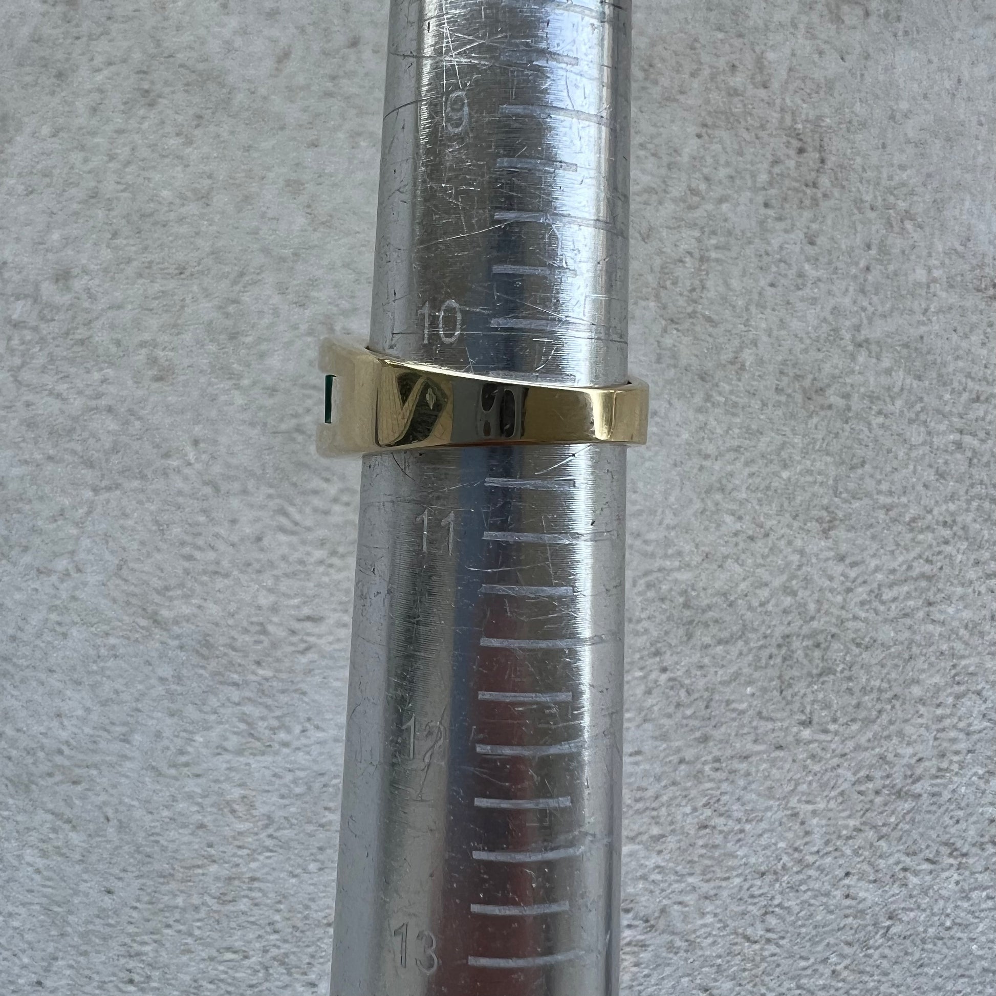 This one is in excellent condition and looks to hardly ever been worn. Set with a large princess cut green Columbian emerald, 2 very clean natural diamonds (.10ctw) and a flawless black onyx stone in a modsernist style setting with a high polished mirror finish. This has a very clean look to it while being super high quality, heavy, and durable. Sized approximately a 10.5 and weighing 11.6g
