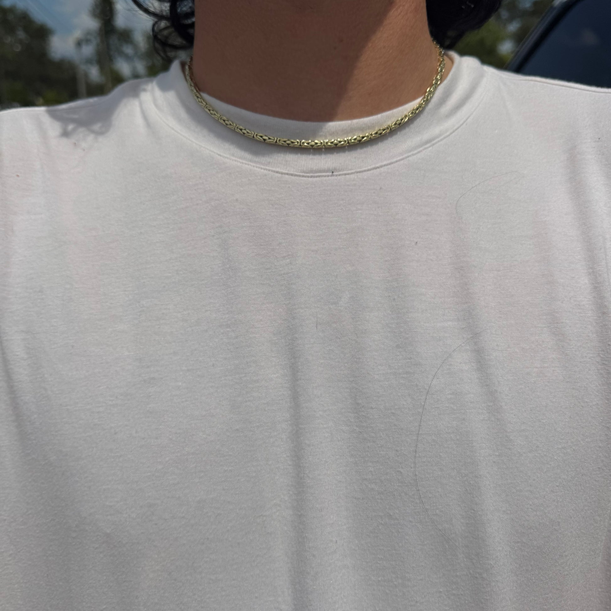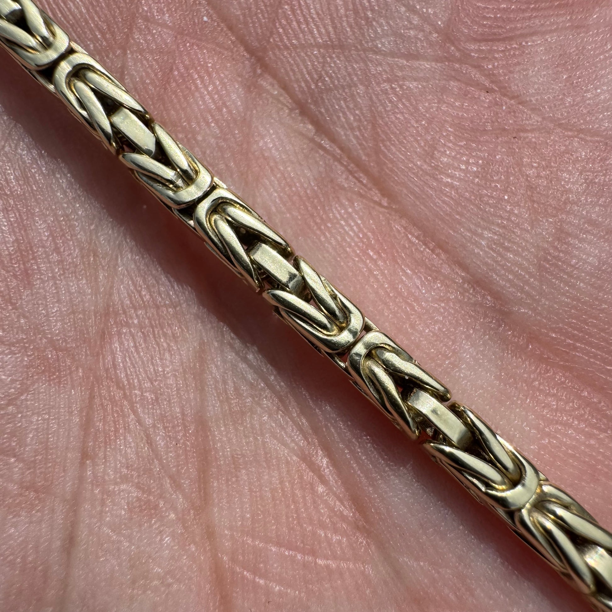 This one hits all the checkmarks and is one of my most sought after link styles when I’m sourcing my inventory. The Byzantine link is the hardest and least cost effective link for any jeweler to make and one that is not often made anymore because of this. Due to this fact you don’t see them unless looking at older estate jewelry and when you find them they have higher premiums than any other link style. This piece was crafted out of all solid 14k yellow Italian gold with beautiful heavy duty box lock giving you one of the most secure chains to keep around your neck without being overbearing. At 16.25” in wearable length and a thick 3mm x 3mm circumference while weighing in at a solid weight of 29.14g this is a great everyday chain if you’re looking for something to wear 24/7 that is going to stand the test of time.