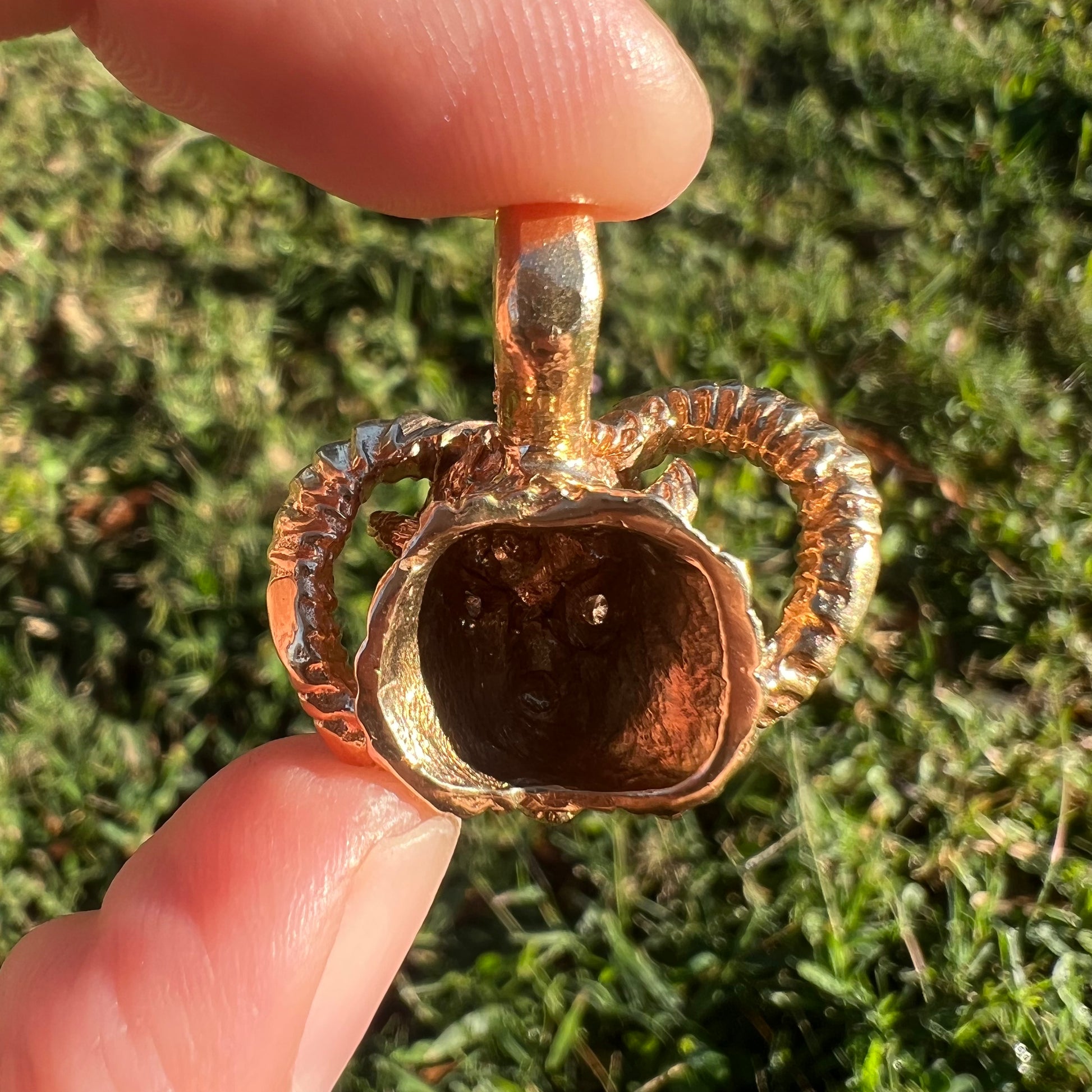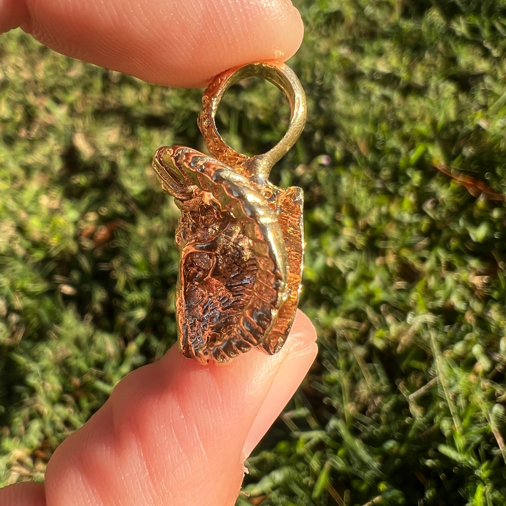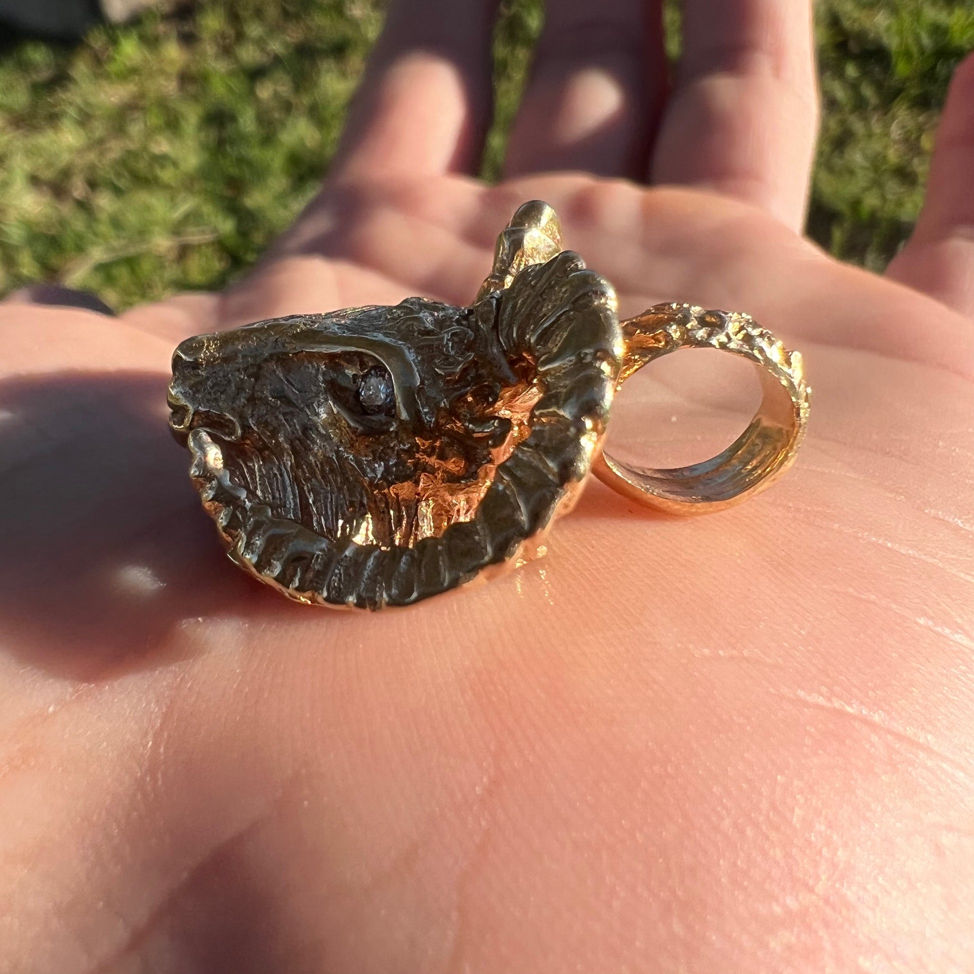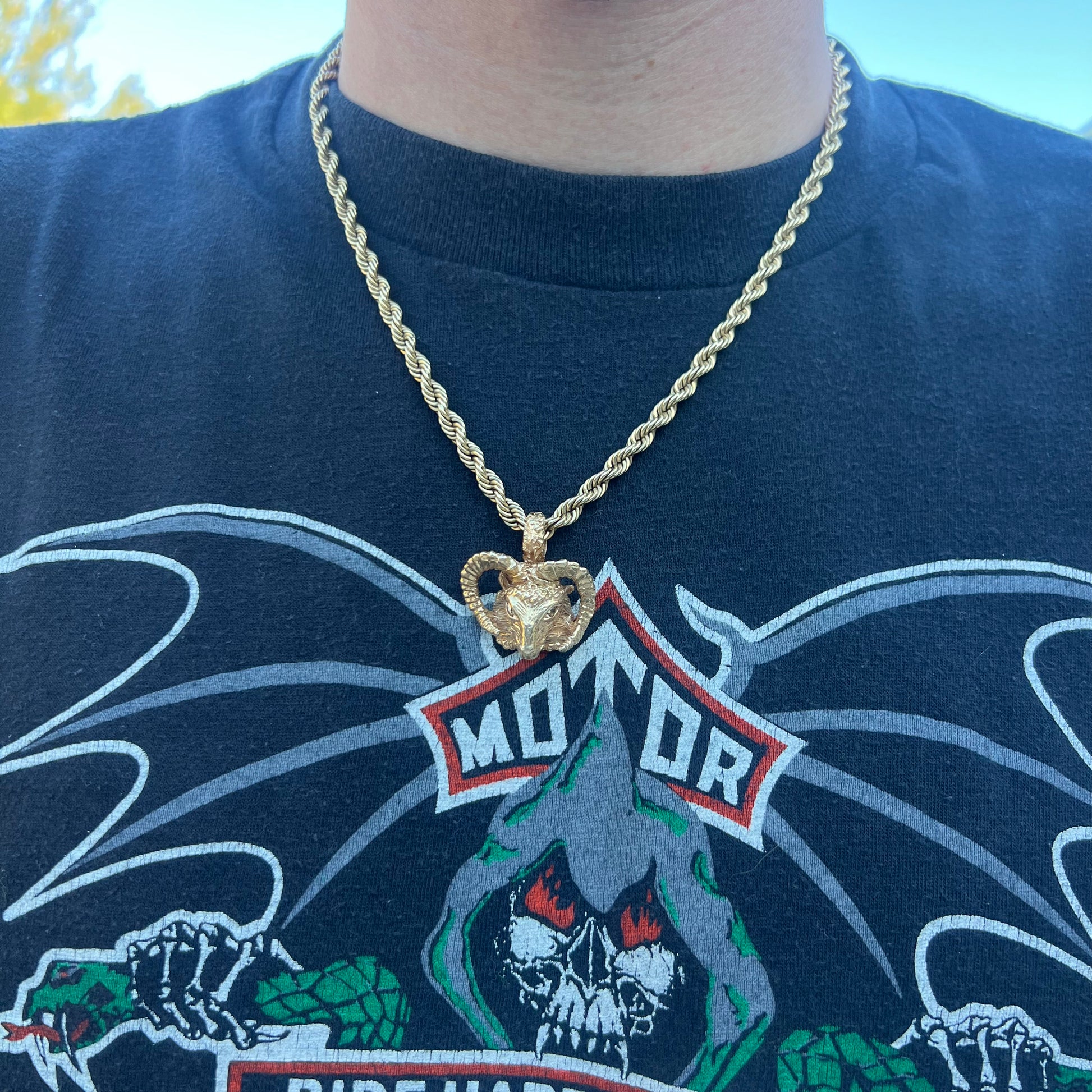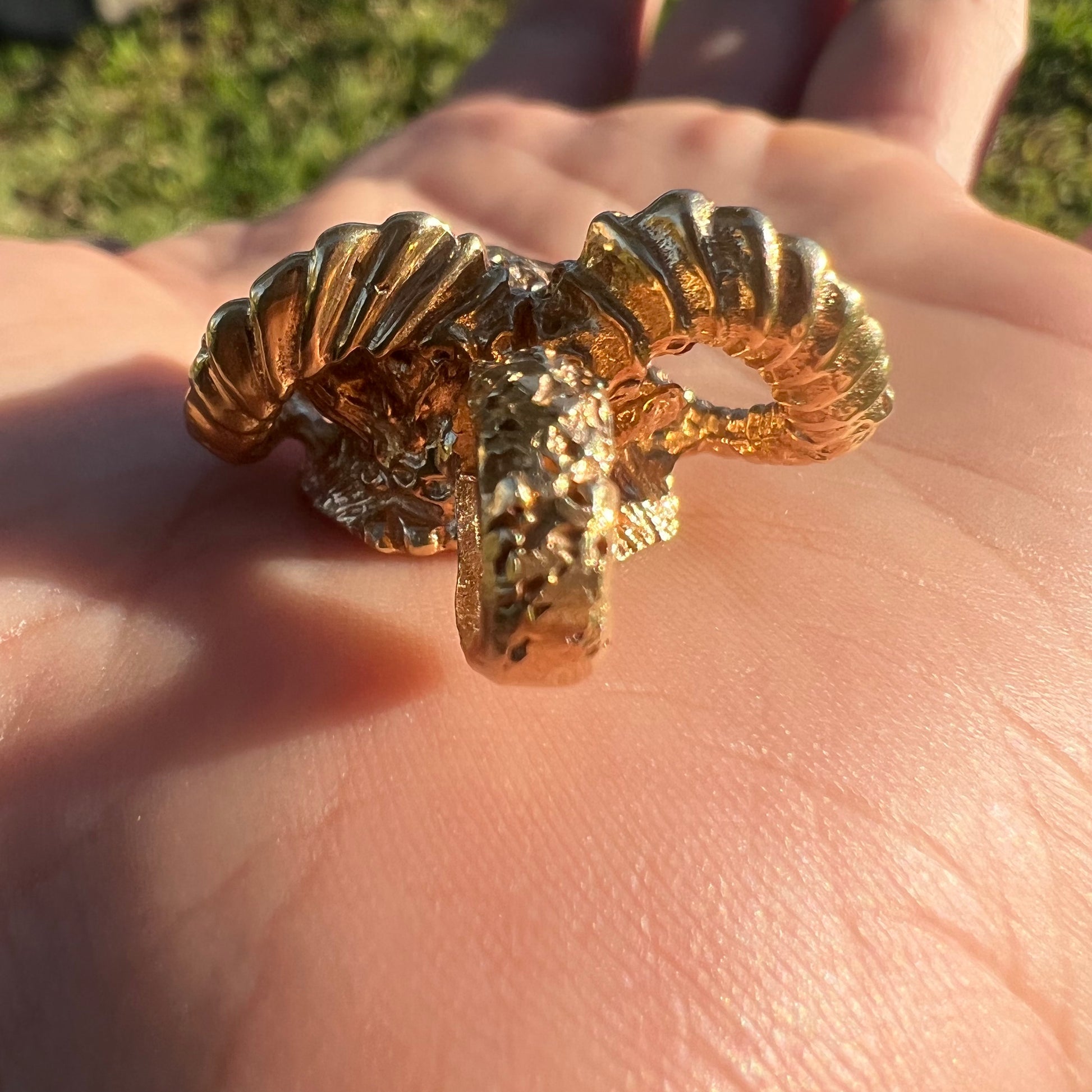 Custom made solid heavyweight casted out of vibrant 14k yellow gold is this finely detailed and lifelike ram head pendant. Encrusted with flush set natural diamonds in the eyes giving off an even more fierce appearance this pendant is purely bad ass. Whether your zodiac sign is an Aries, you’re head strong and battle ready like that of a ram, or you just want a heavy and tough looking animal hanging around your neck this piece is the one. Though the pictures are great you really need to hold this one in your hand and see it with your own eyes to really appreciate this one. With a large Nugget style nail with an inside diameter of approximately 7mm by 8mm this pendant can hang from a large and thick necklace as it also ways a staggering 14.12g and measures around 1.25” by 1.25”