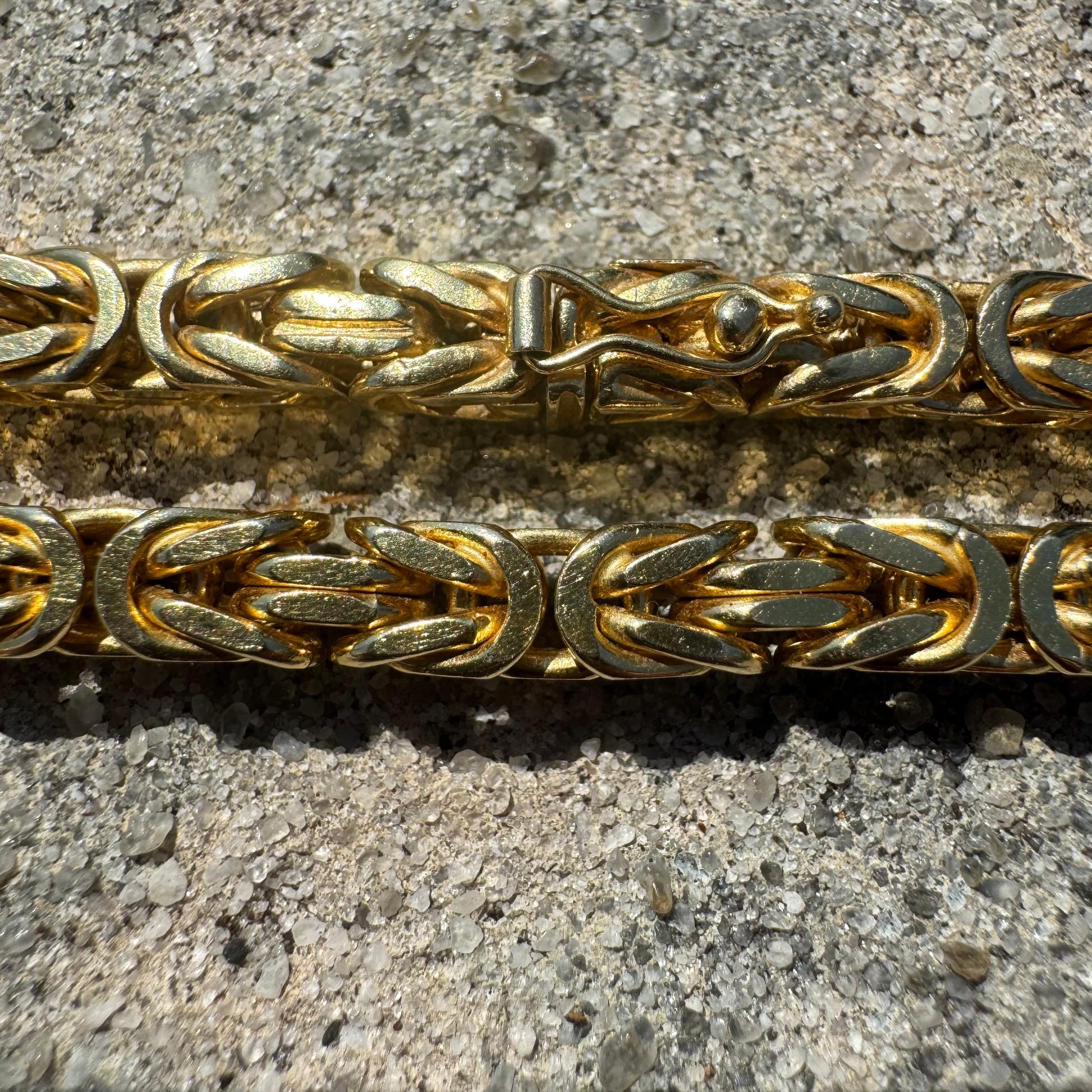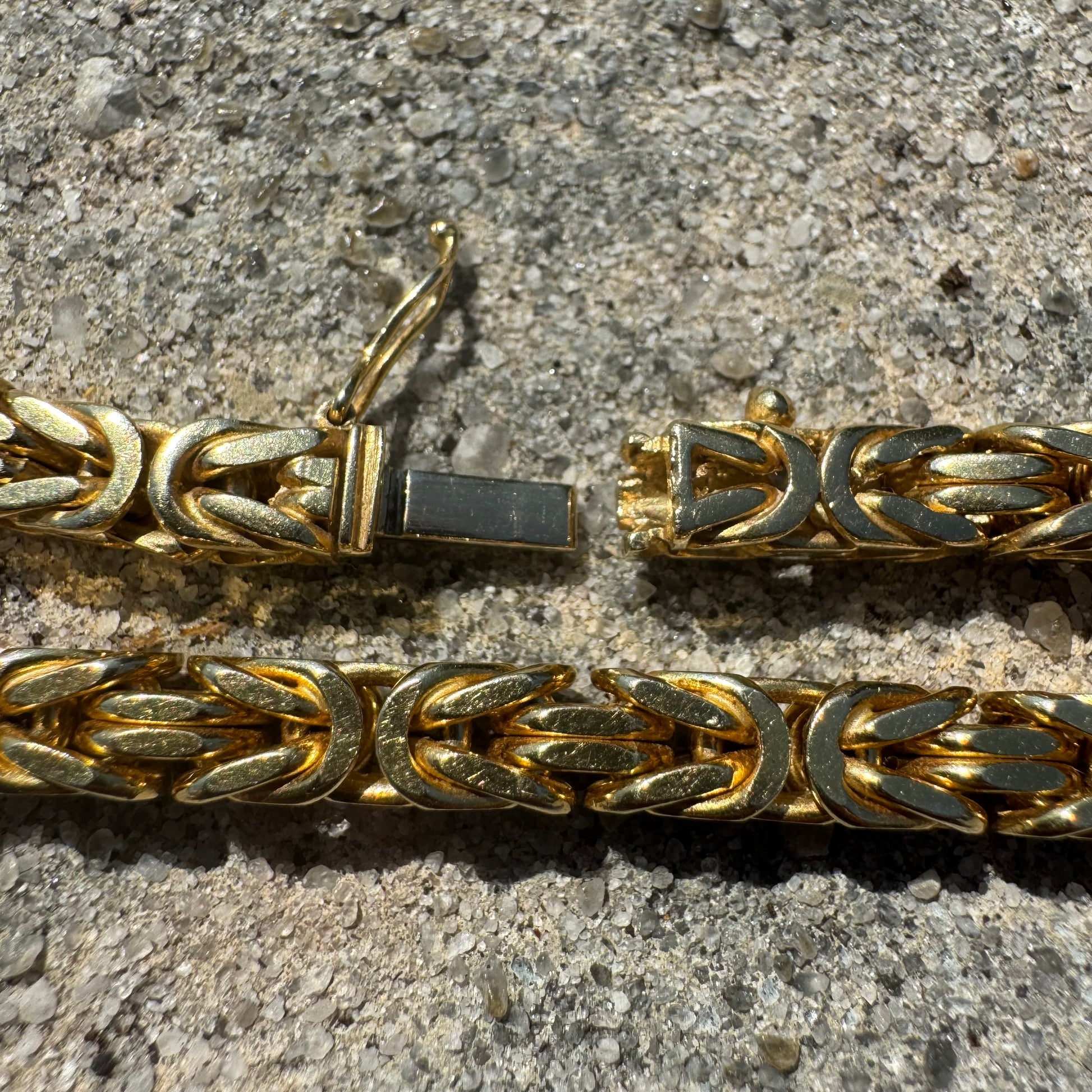 Rare and super hard to find old school style solid 14k vibrant and glowing Italian yellow gold Byzantine link necklace. One of the hardest and most time consuming link styles to make this piece was all made by hand one link at a time. Extremely comfortable to wear despite the chunky, solid, and heavy nature of this chain with rounded boxy edges and measures a thick and beefy 5mm by 5mm with a wearable length of 20.5” and all solid heavyweight at 88.7g. With a durably constructed Heavyduty box lock with side security latch you don’t have to worry about losing this one around your neck. As you see in pictures (#8, 9, & 10) the clasp has a low profile push button that’s level with the surface of the necklace adding to not only the comfortability but the look and security as well. This one’s being sold way cheaper than what it should be and way less than anyone else would price it at. With gold increasing in value every minute this is a safe and secure investment in an heirloom piece that will last you and your family a lifetime as it gets passed down from generation to generation.
