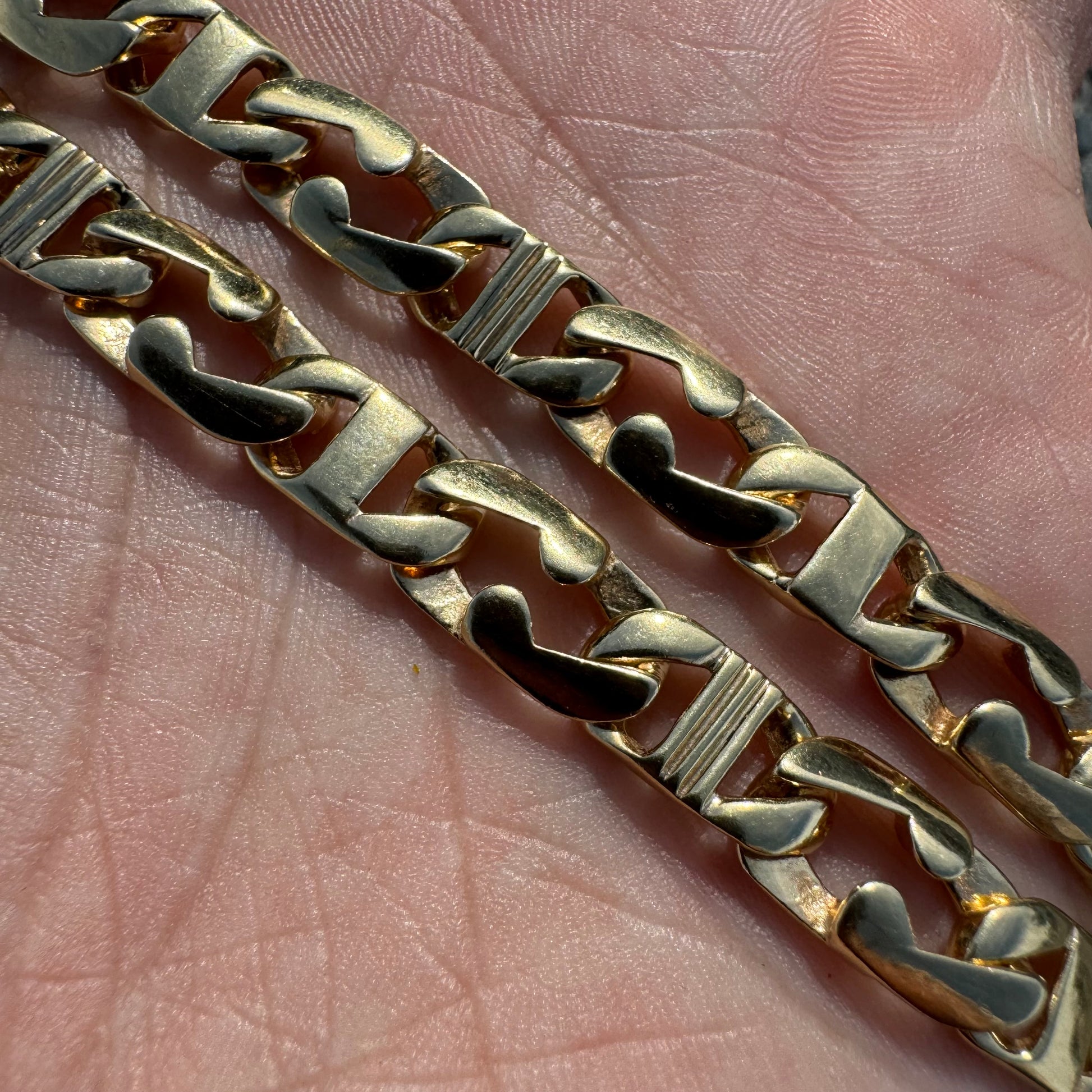 Expertly crafted in Italy, the Mecca of Goldsmithing, sometime in the 1980’s is this Solid 14k high mirror polished finish yellow gold Razor-blade style mariner link necklace. Not your average circular links but a very unique shape to the insides resembling the inside of a Razor-blade while it alternates to every other link in the form of a mariner style with cross bar anchor section. If you’re looking for a tough as nails look that is unique with distinction then this is the one. This beast can take a beating at a solid heavyweight of just under 49g with a chunky 8mm width and 3.25mm depth It measures just about 20” in length and a heavy duty large style bubble butt lobster clasp you won’t have to worry about losing this piece as it’s very secure with extra chunky terminal ends for added security.
