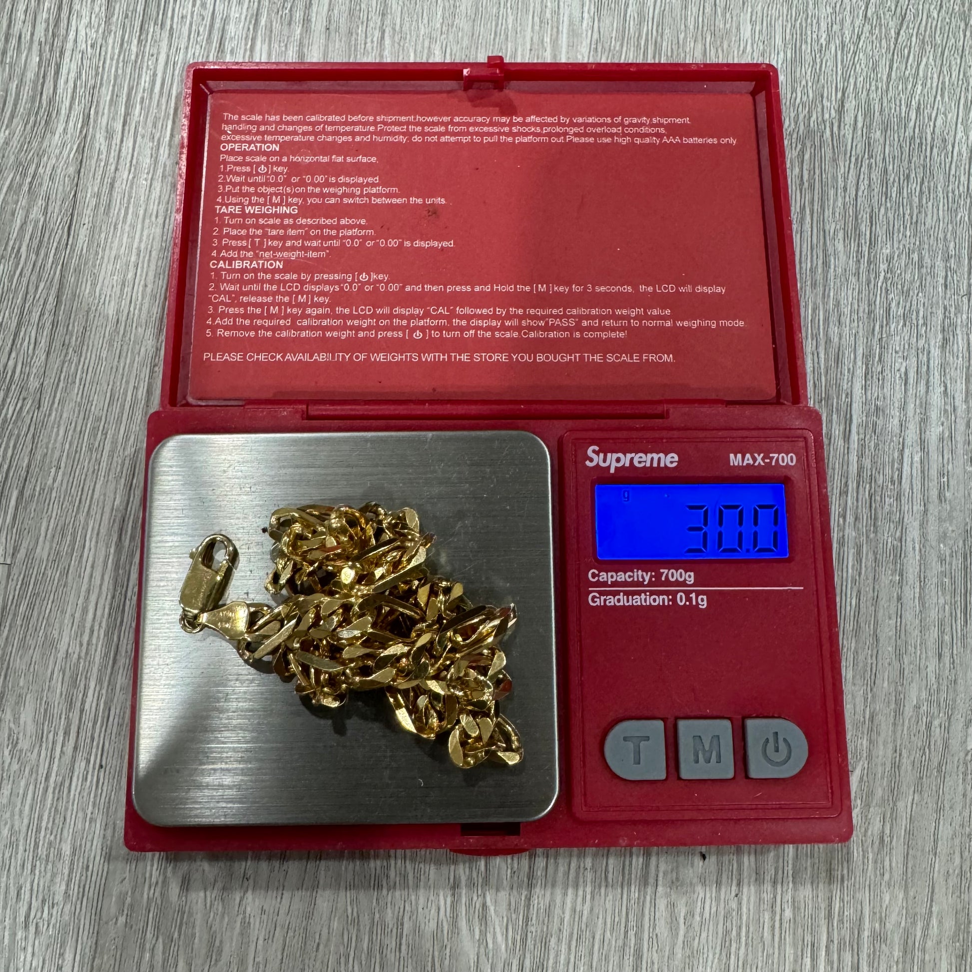 In absolutely immaculate Grade A condition is a solid heavyweight 14k yellow Italian gold Figaro link necklace, though this is not your average Figaro. This chain features a “Knife Edge”, if you look down the center of each link you’ll see a striation of pronounced cuts. These are meant to add depth and intake light into the necklace giving off a flashier appearance when in movement and while stationary to shine like the sun. Weighing in at just under an oz this is a beefy 30g and approximately 20” in length by 6mm wide this is a perfect size chain.