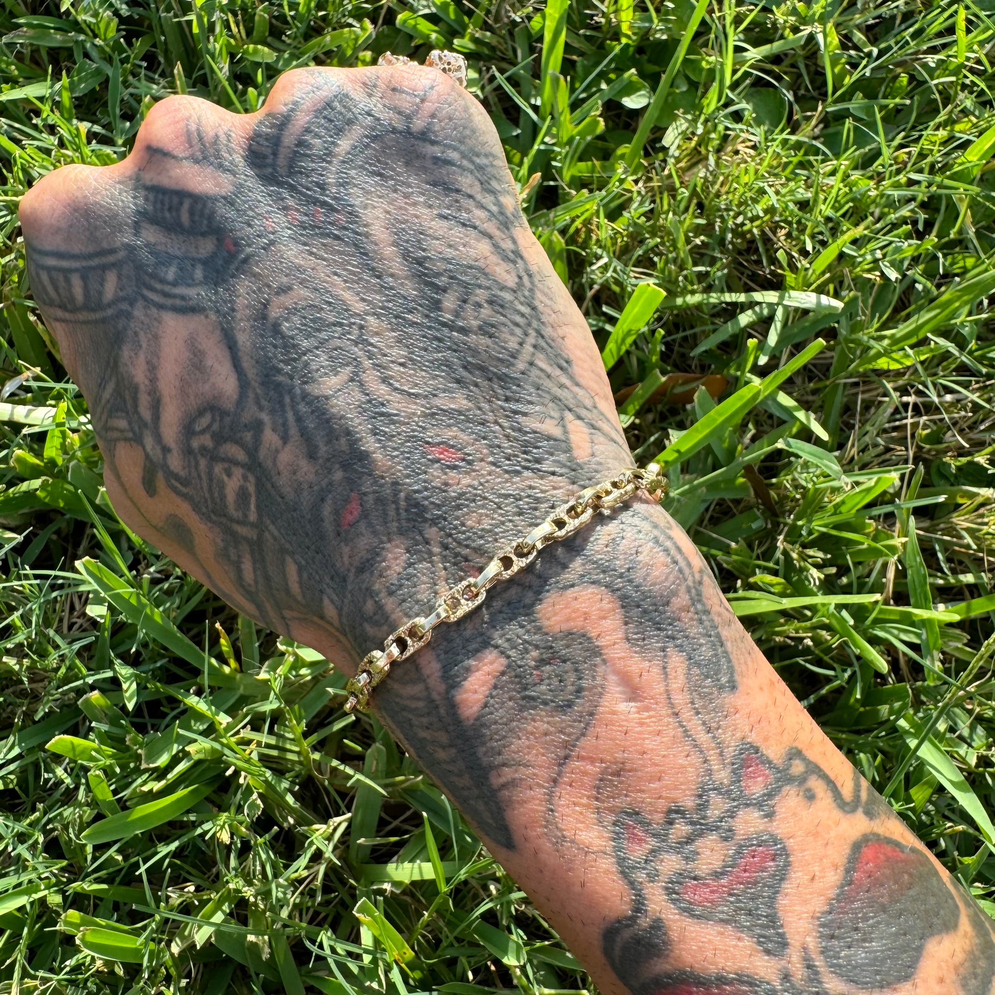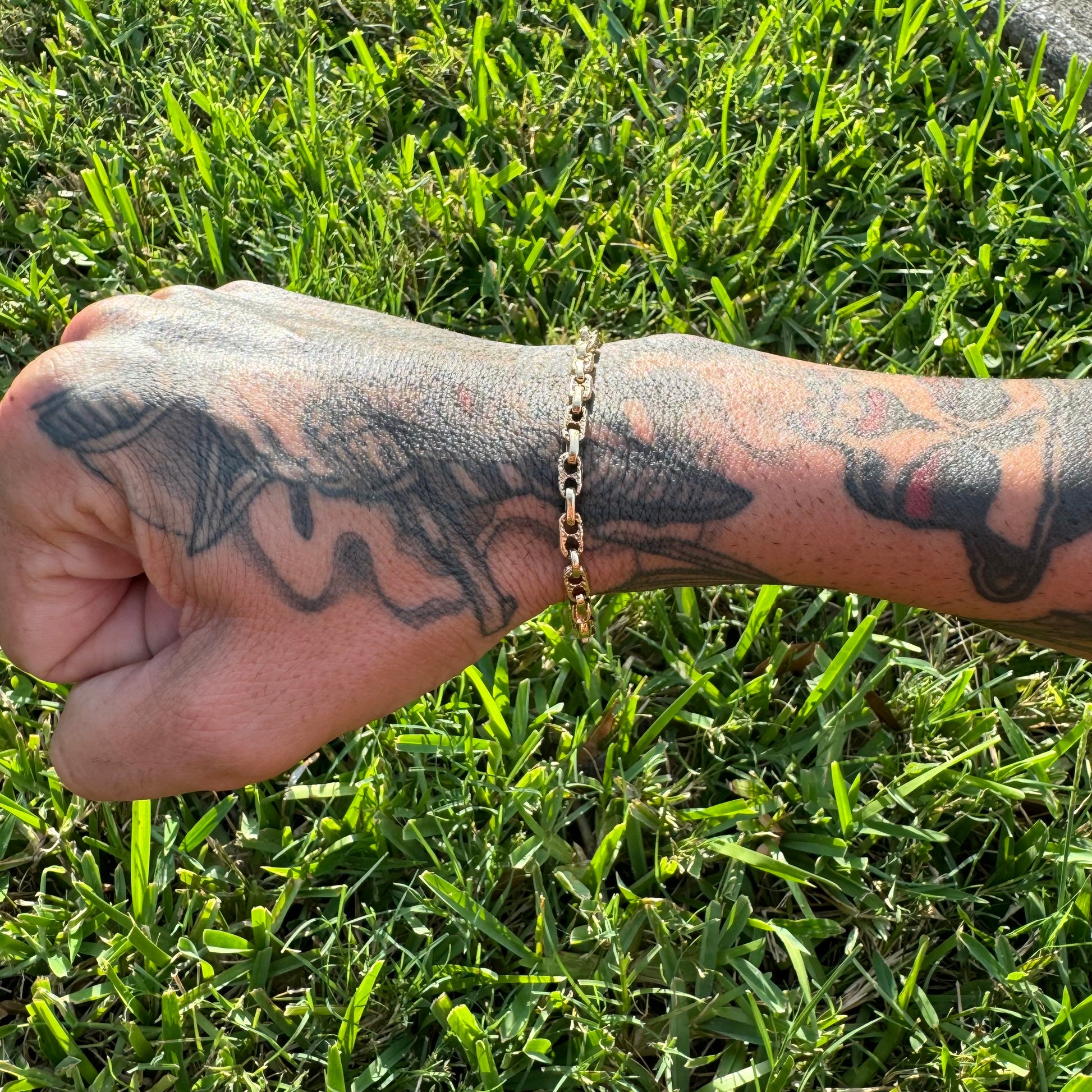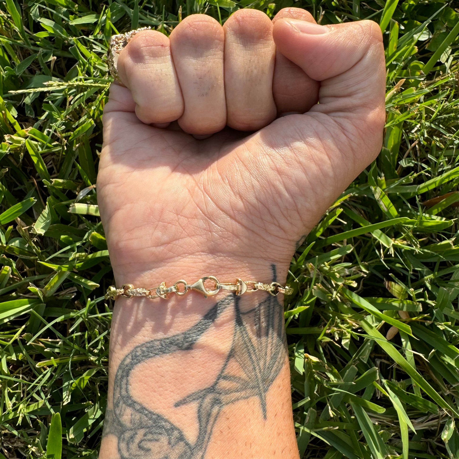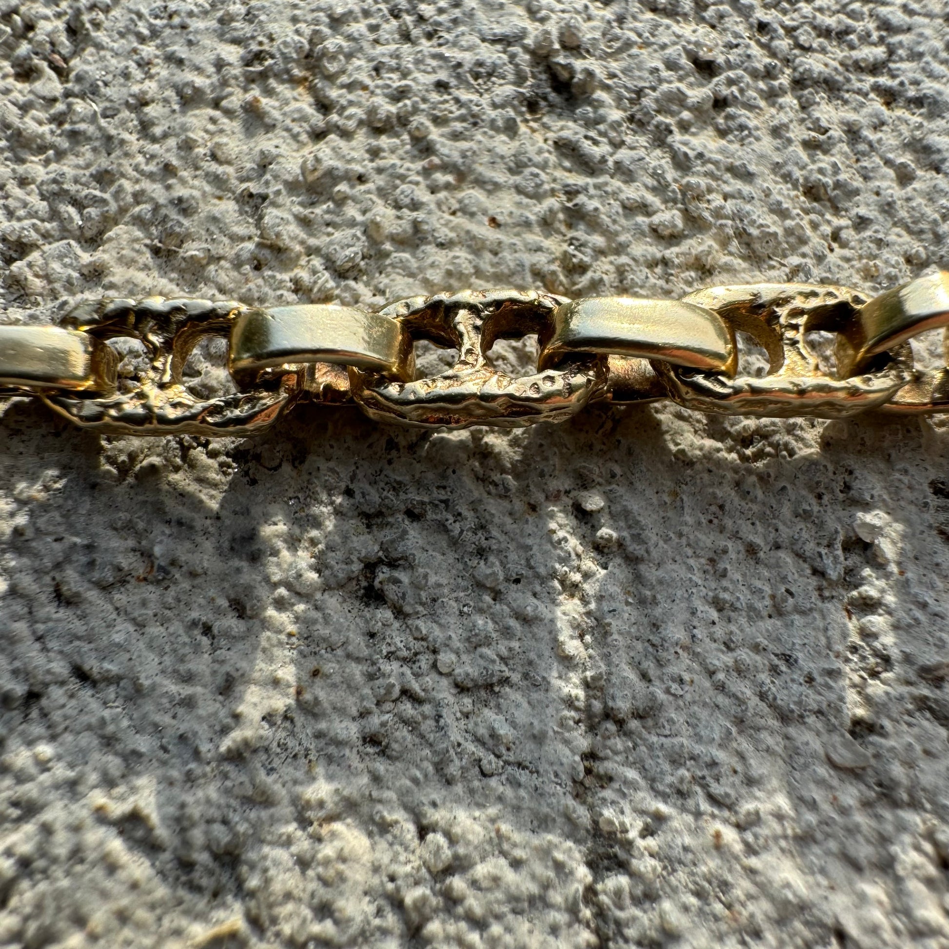 This one is really hard to say goodbye to. Coming straight out of my personal jewelry box and a piece that I’ve worn weekly for the last 3 plus years is a link style I’ve never actually seen another of in person. Crafted by hand out of solid 14k yellow gold is a brutalist Nugget style chaine D’Ancre mariner link bracelet. With flared out cross guard terminal ends connecting an oversized lobster clasp measuring 7.5” and 4mm thick weighing in all solid at 11.7g. You won’t find another one of these too easily, trust me I’ve been trying for years.