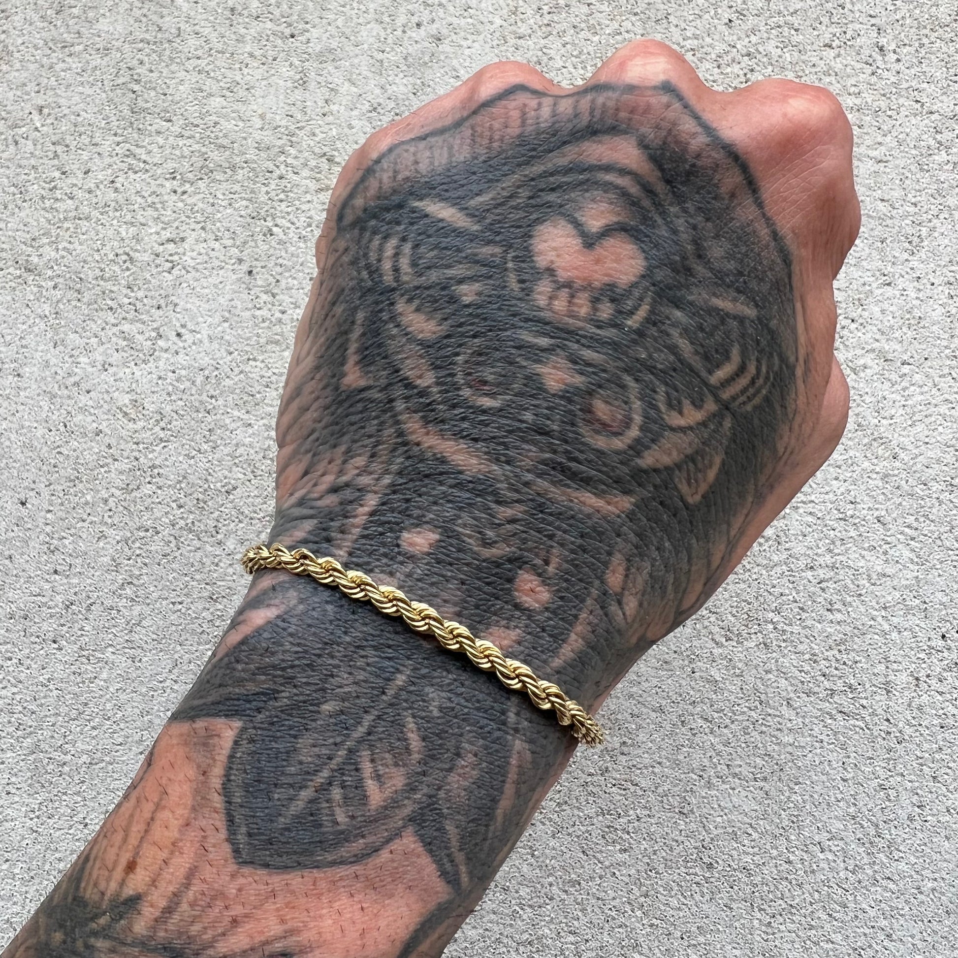 Nice and heavyweight in practically flawless condition is a smooth solid 14k yellow gold chunky rope bracelet with barrel lock double latching mechanism. Measures 8.5” end to end but fits 8.25” when clasped by 4mm wide circumference at approximately 11.1g.