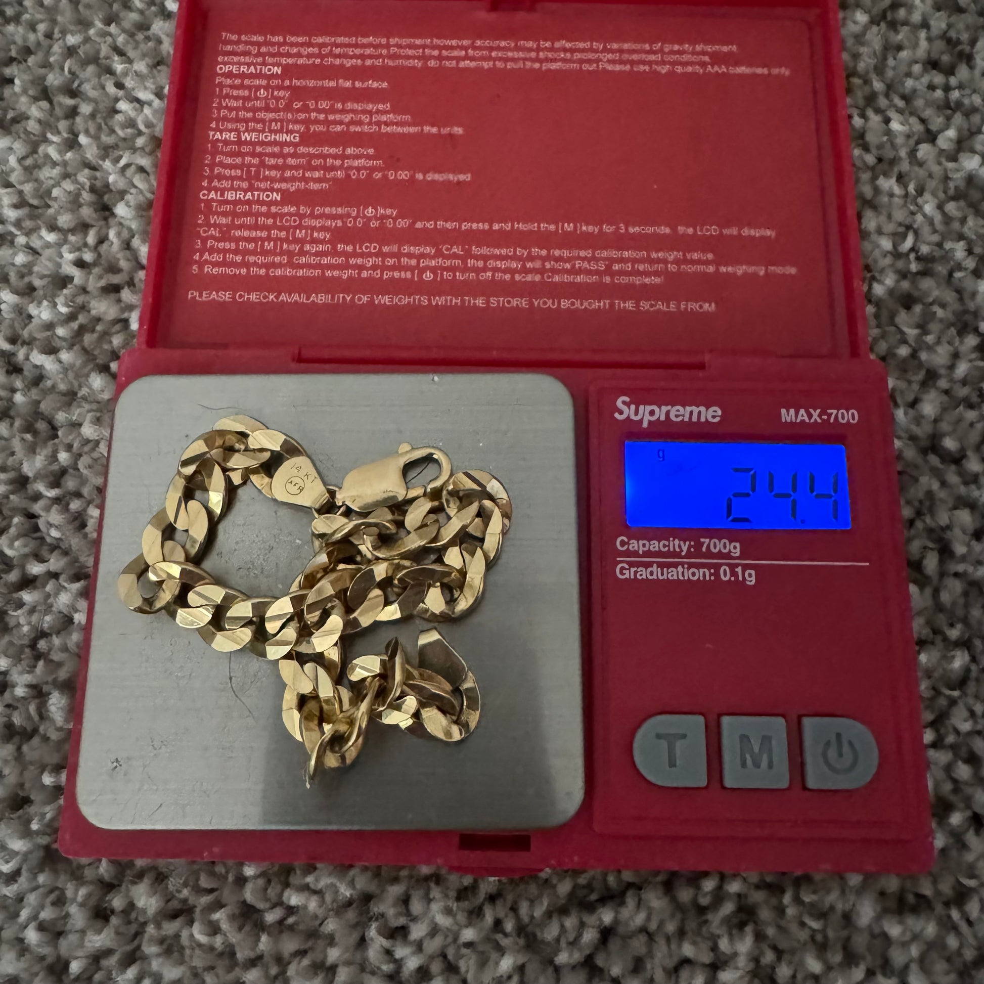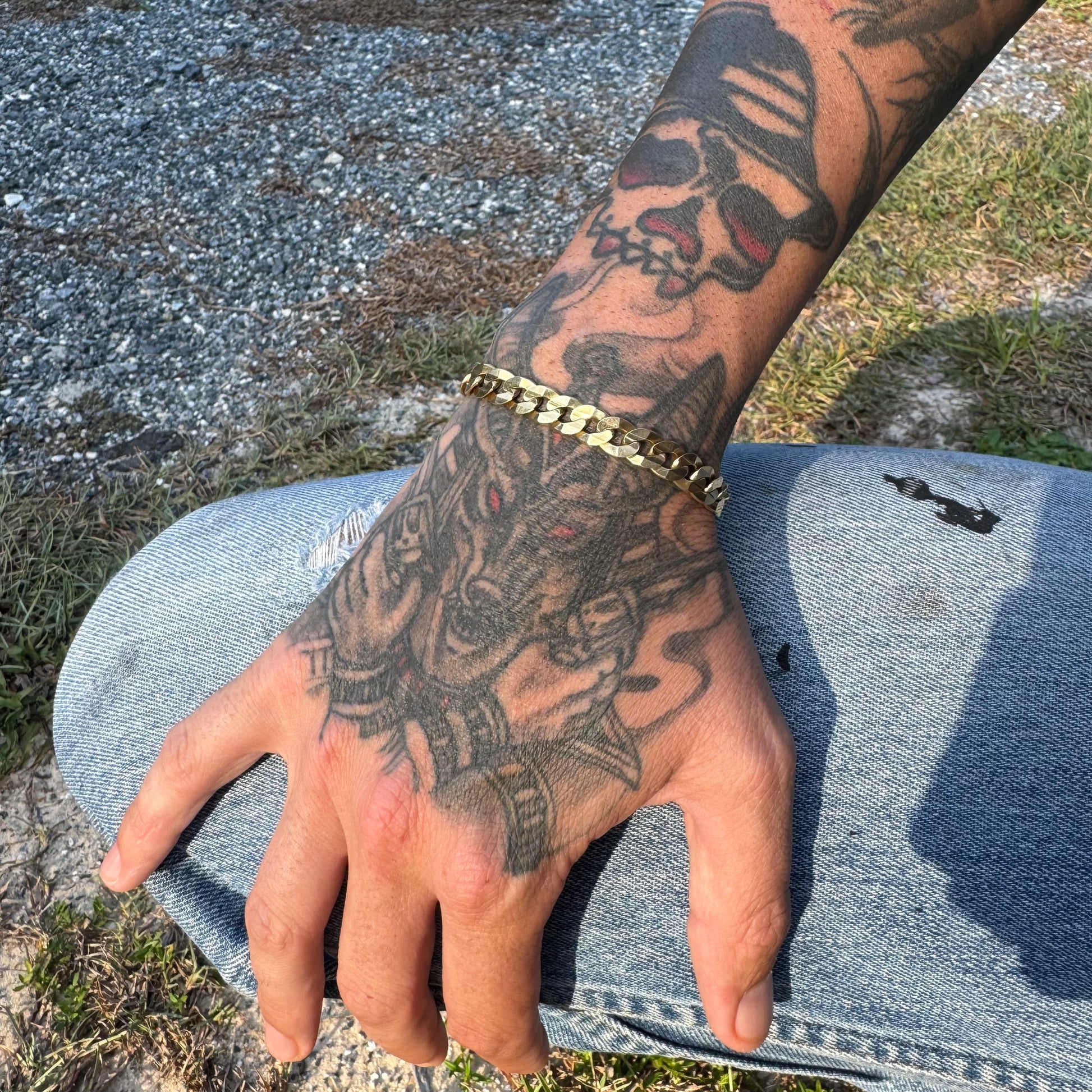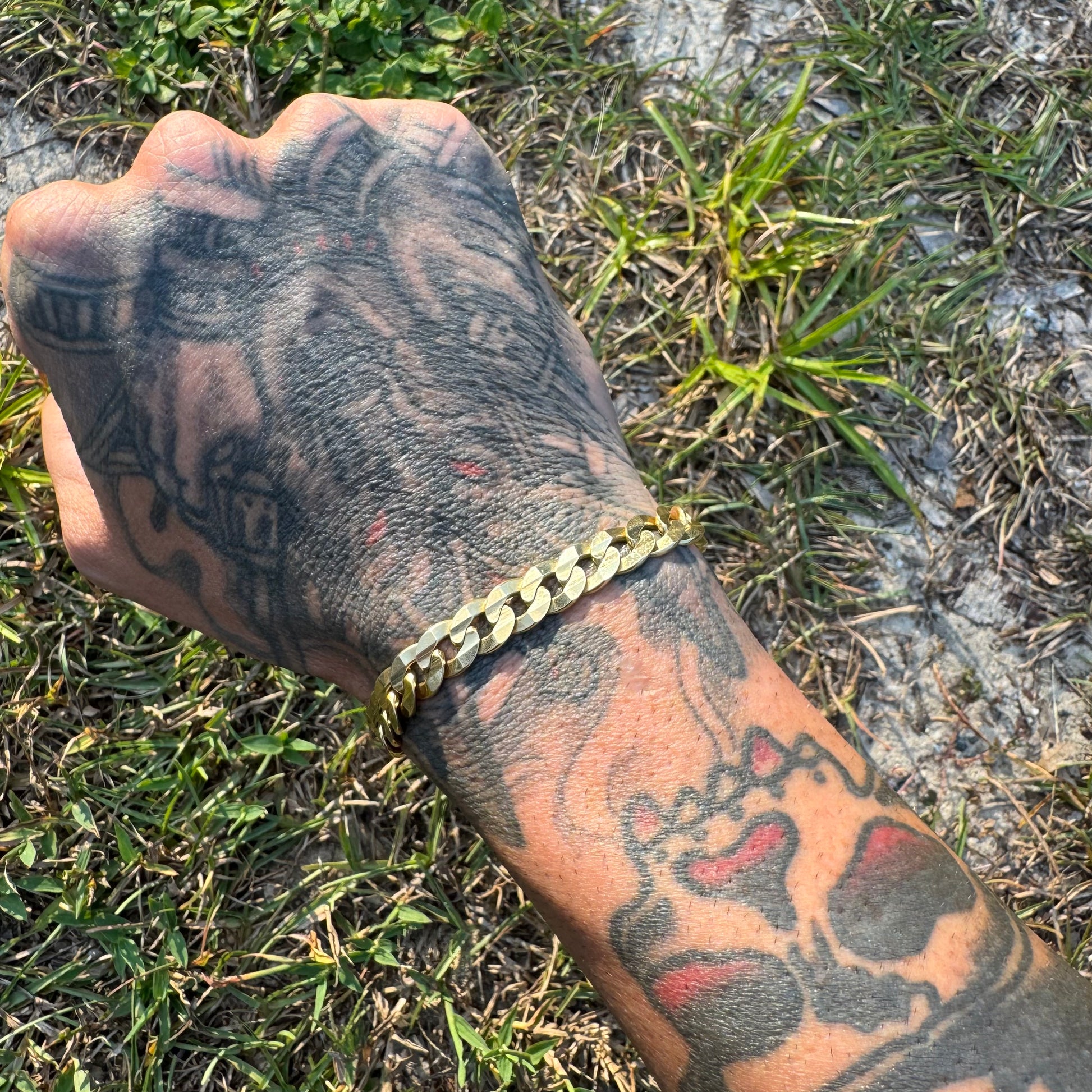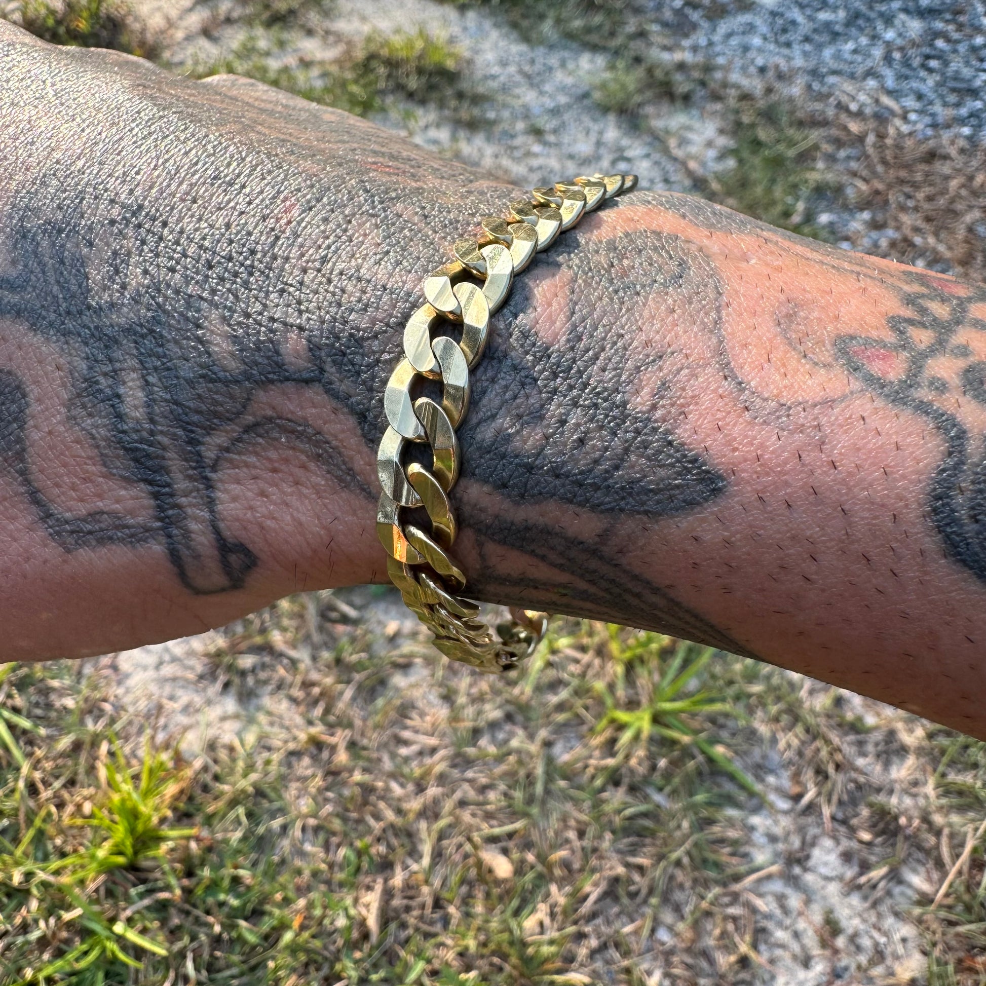 The perfect size to weight ratio if you’re looking for a solid everyday bracelet with substance this link is a timeless design with versatility to be worn with other bracelets in a stack or solo. Crafted out of a solid 14k vibrant yellow gold the hues are nice and deep just like that of an 18k gold glow especially as the light reflects off of the deep beveled edge cuts. Measuring in at a wearable 8.5” length, a heavy and solid weight of 24.4g, and a chunky width of 8mm the Cuban style curb links are comfortable to wear as they have a nice rounded out curve to them. This is a bracelet you will not have to worry about losing it getting damaged with the oversized heavy duty and secure lobster clasp and true Italian craftsmanship.
