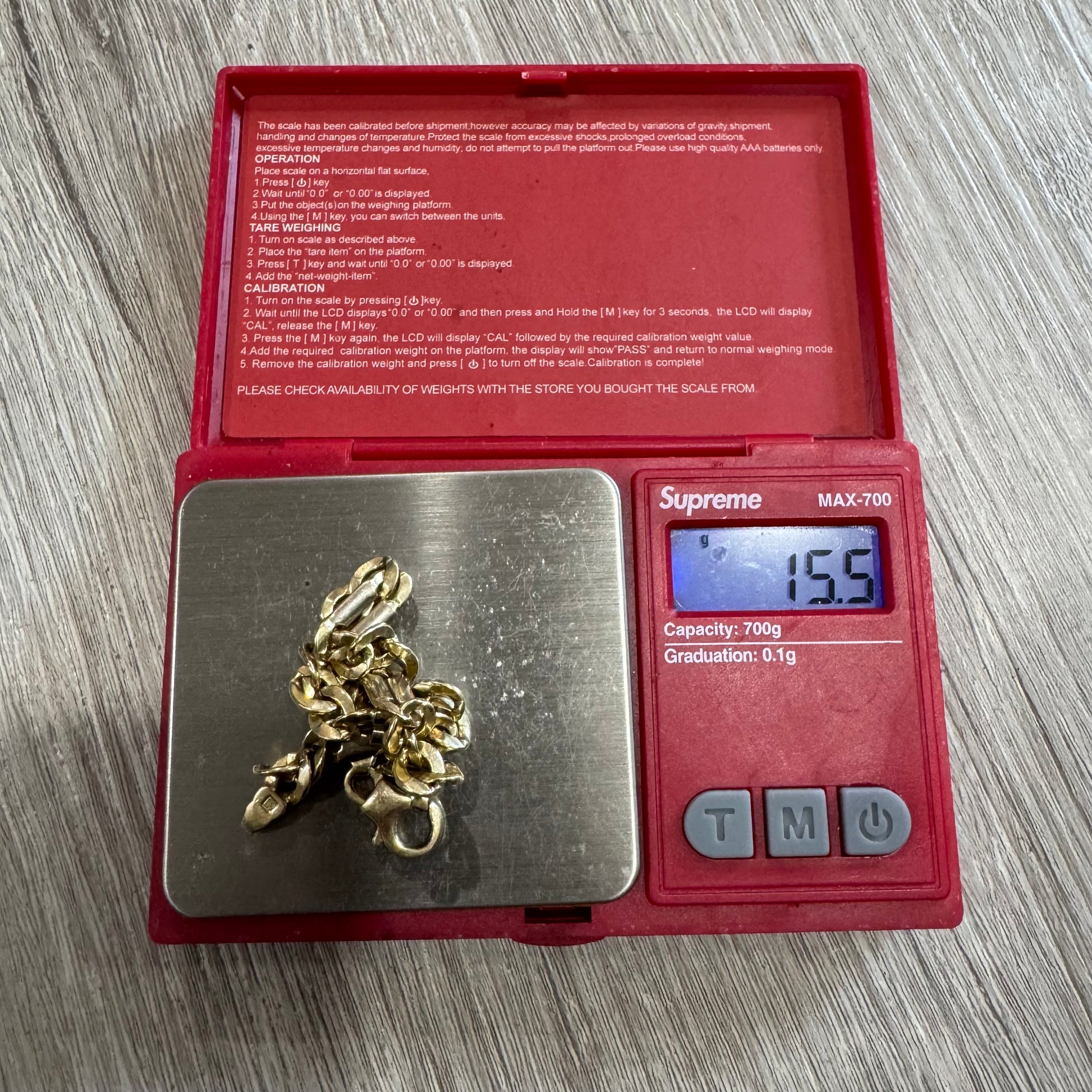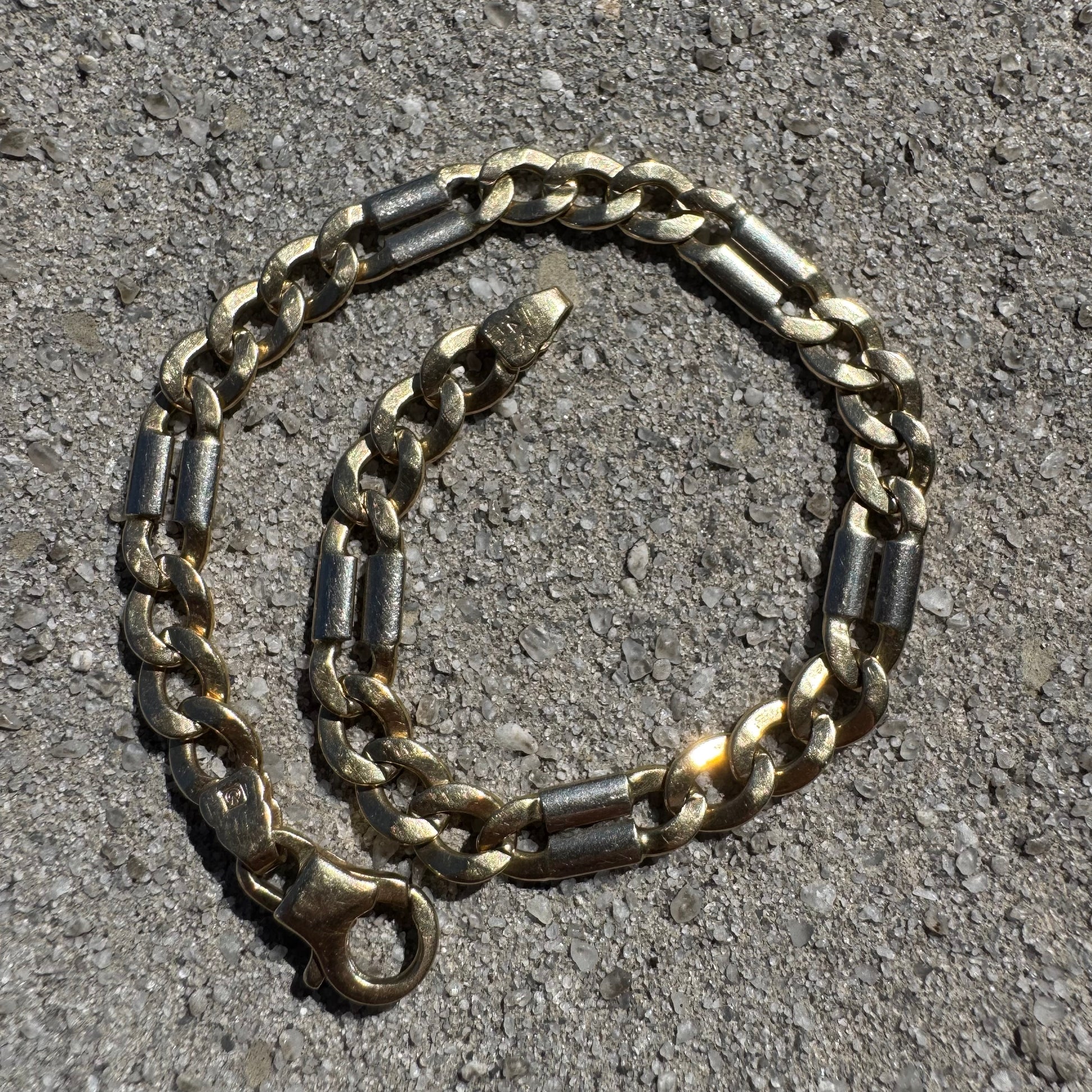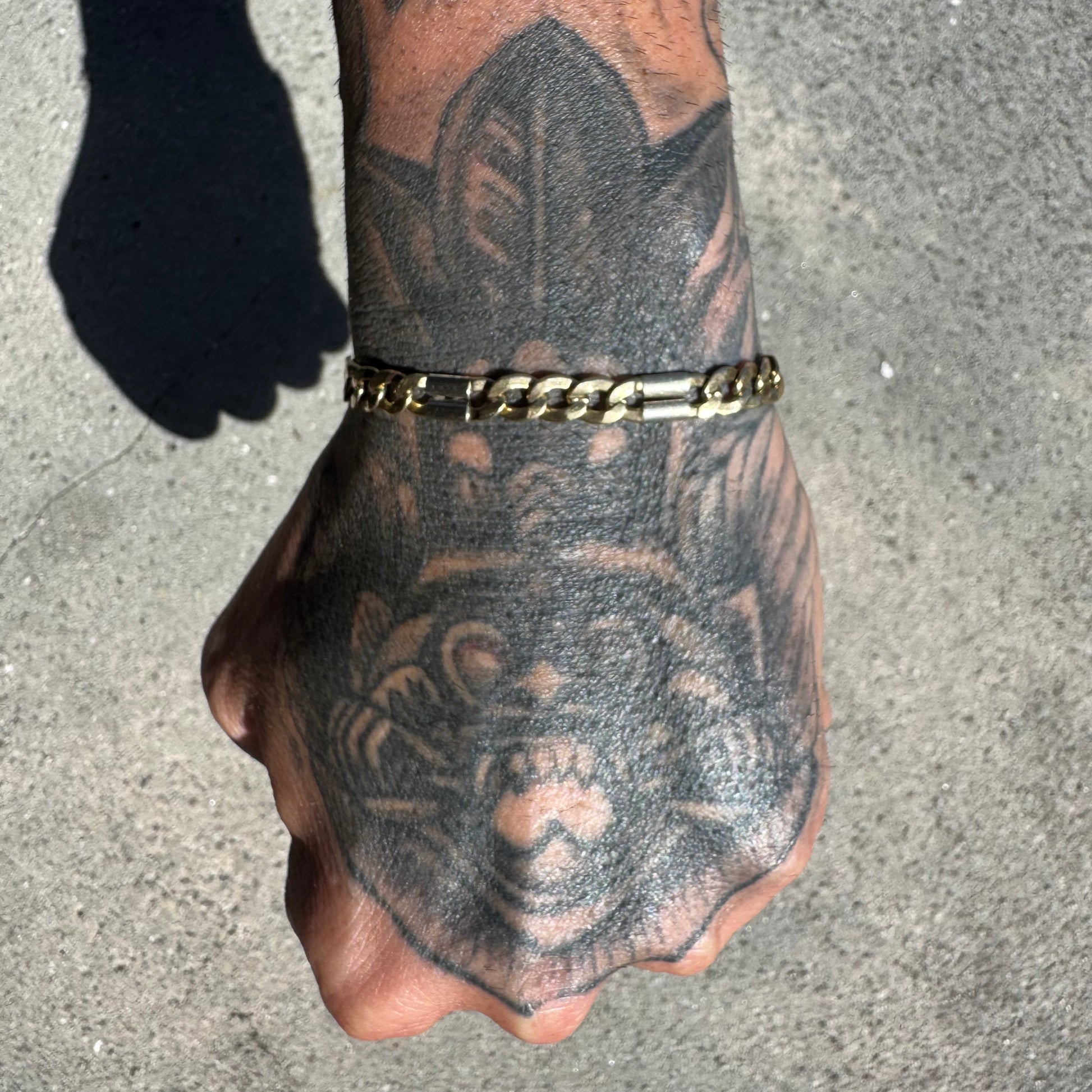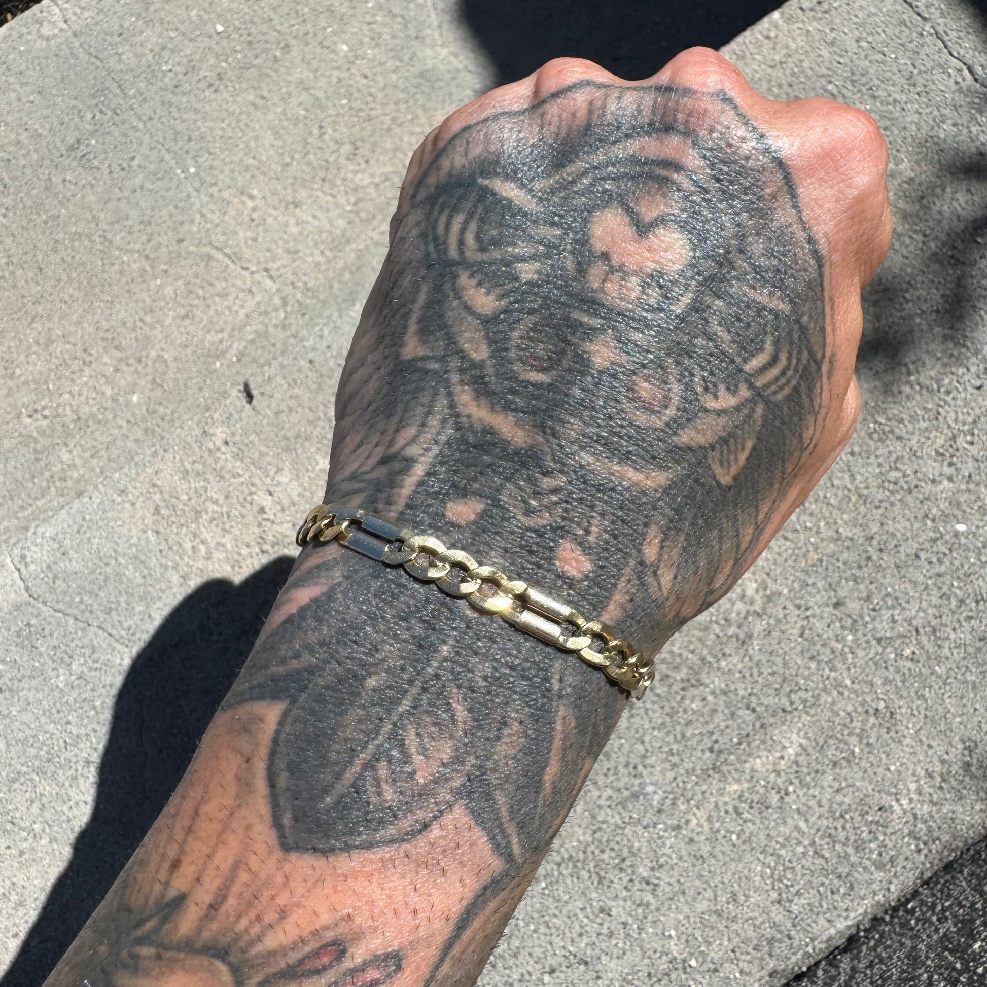 Show in picture #13 is the infamous Tony Soprano, the main character of HBO’s hit television series “The Sopranos”. As you see on his wrist and worn throughout the whole series is almost the identical version of the bracelet you see listed except for the slight difference of the figure 8 links on his are not connected on this bracelet giving more of a razor blade look to the main links. Italian made sometime around the 1990’s and Crafted out of solid 14k yellow gold each Cuban curb link has a slight rounded knife-edged appearance giving off that shine of light while in movement. Interconnected between each set of Cuban curb links is a razor blade style bar link that has been lightly plated over in a rhodium finish which gives off a look of a subtle white gold. With an oversized heavyduty style lobster clasp to securely fasten this solid heavyweight 15.5g bracelet together this 6.5mm thick bracelet isn’t falling off anywhere so don’t be afraid to wear this as your daily driver. At 8.25” in wearable length you’ll be complimented everywhere you go, especially by fans of one of the best television show characters ever created. Now the exact Tony Soprano bracelet is of course iconic but in my opinion this razor blade link version when compared side by side actually gives a more edgier and cooler vibe.
