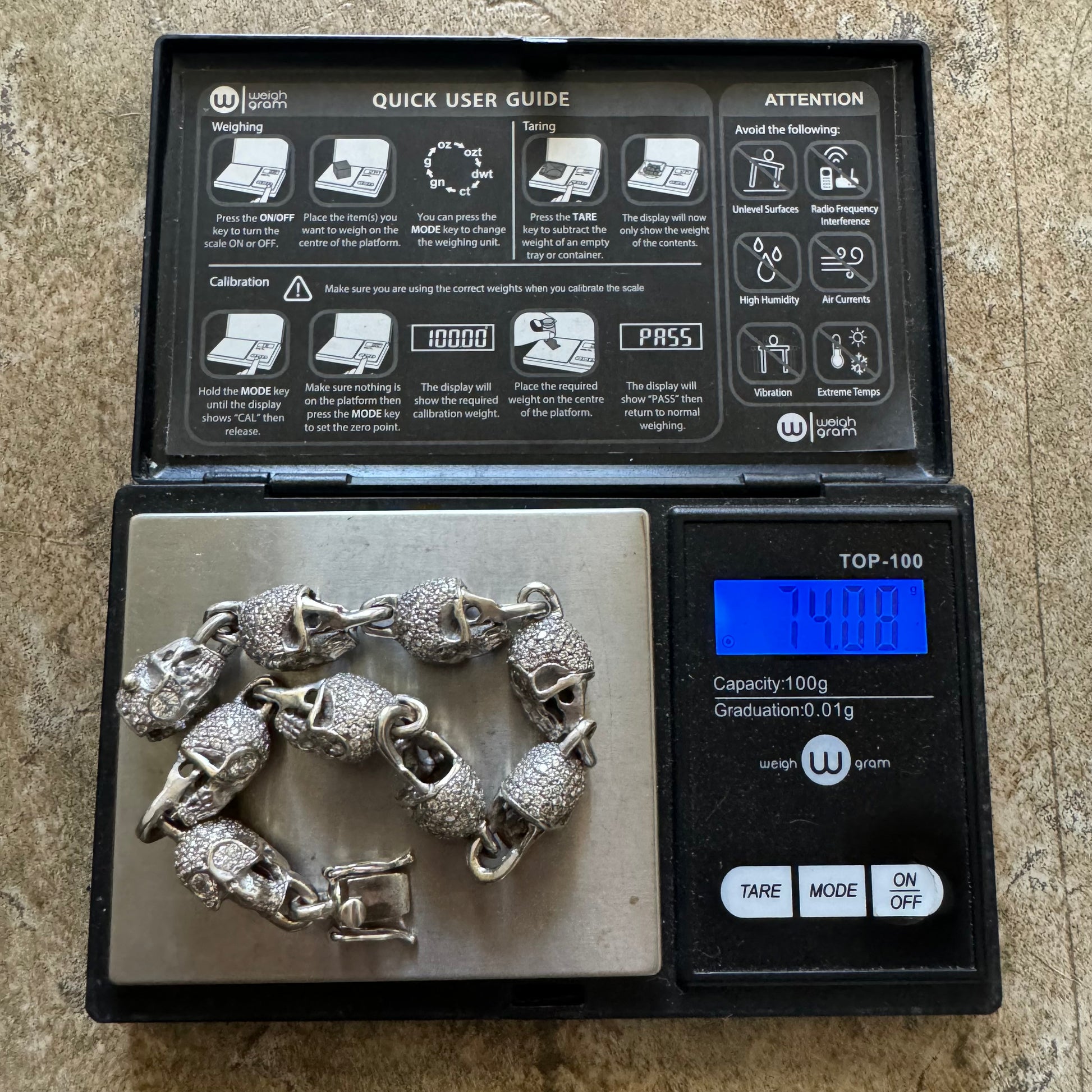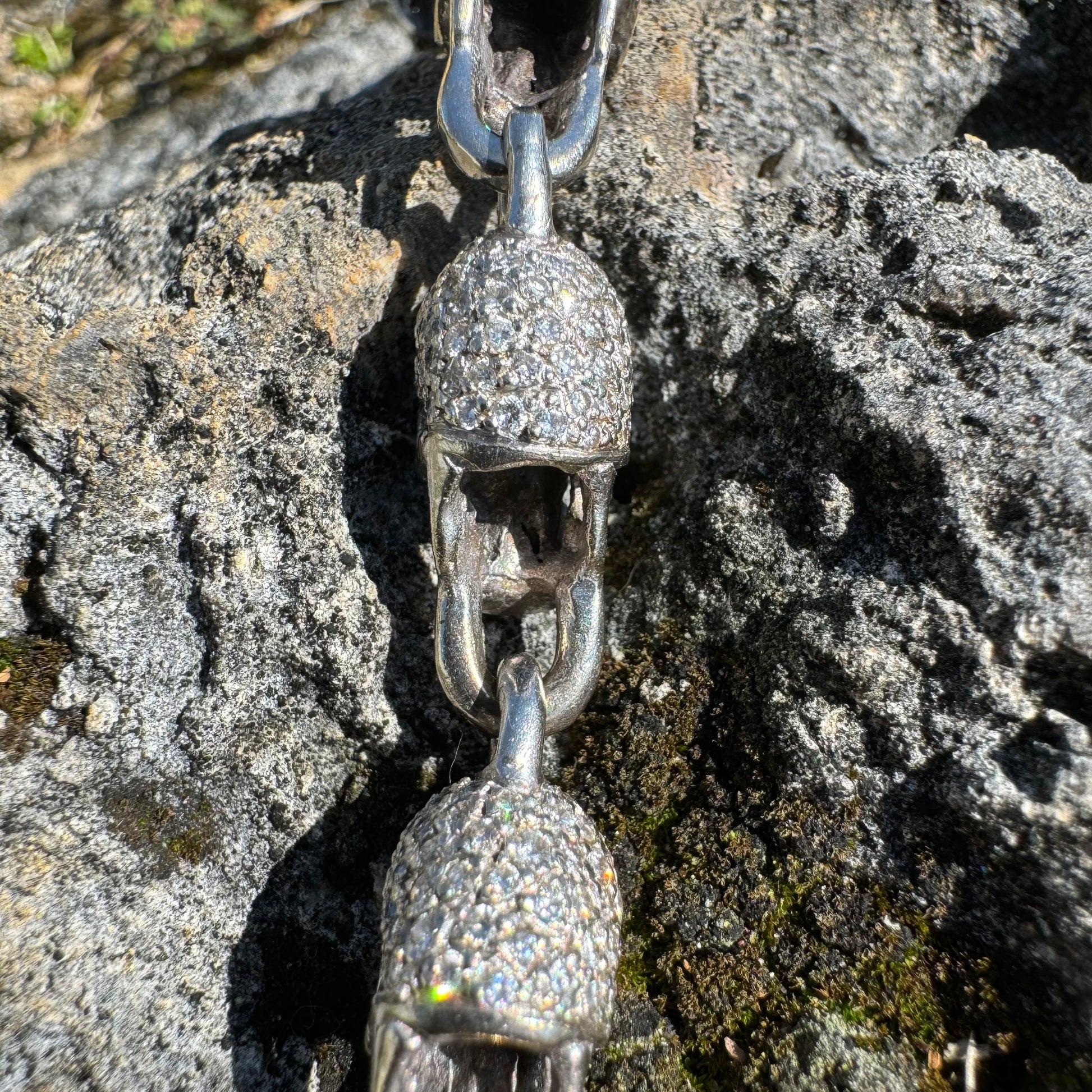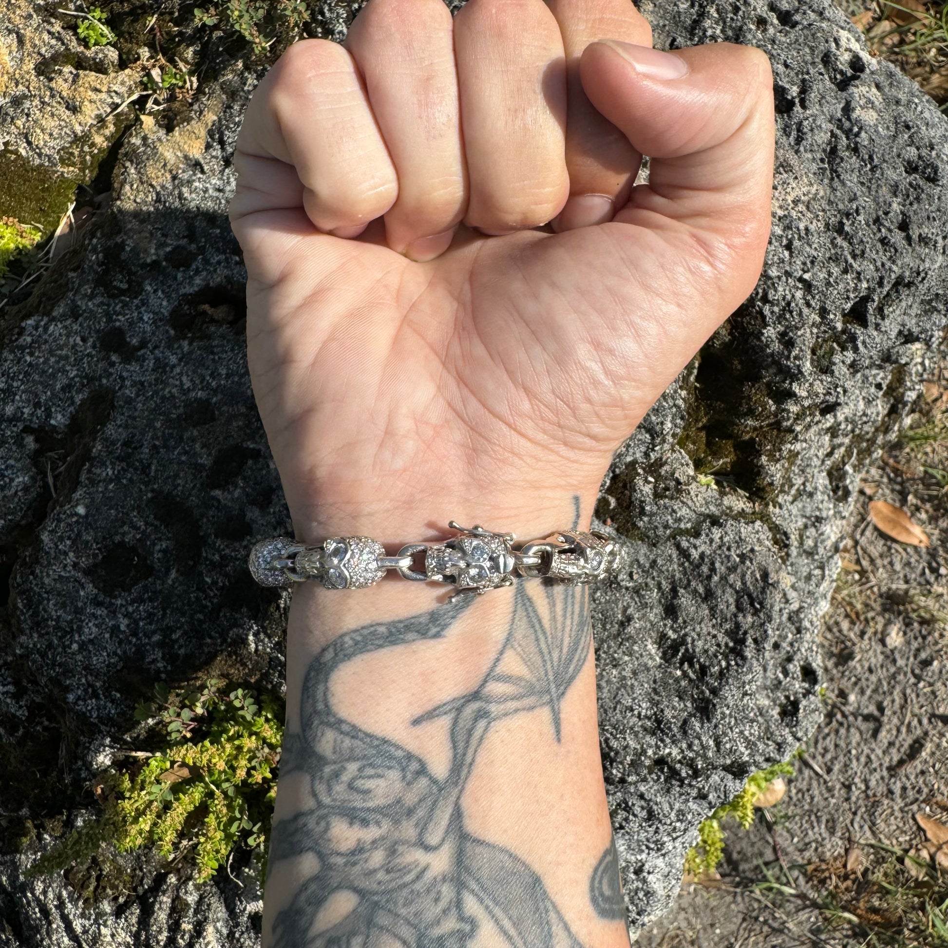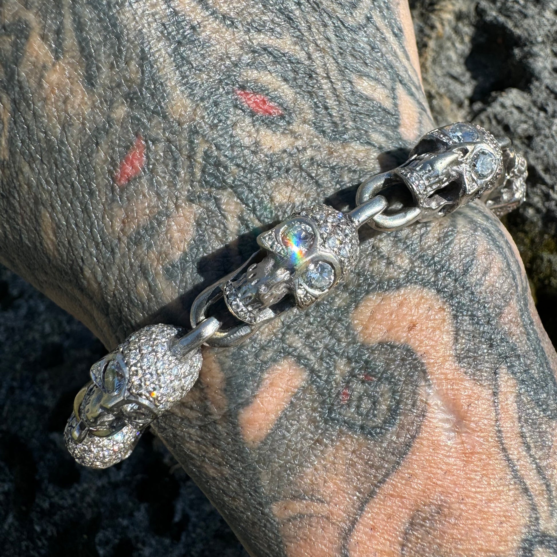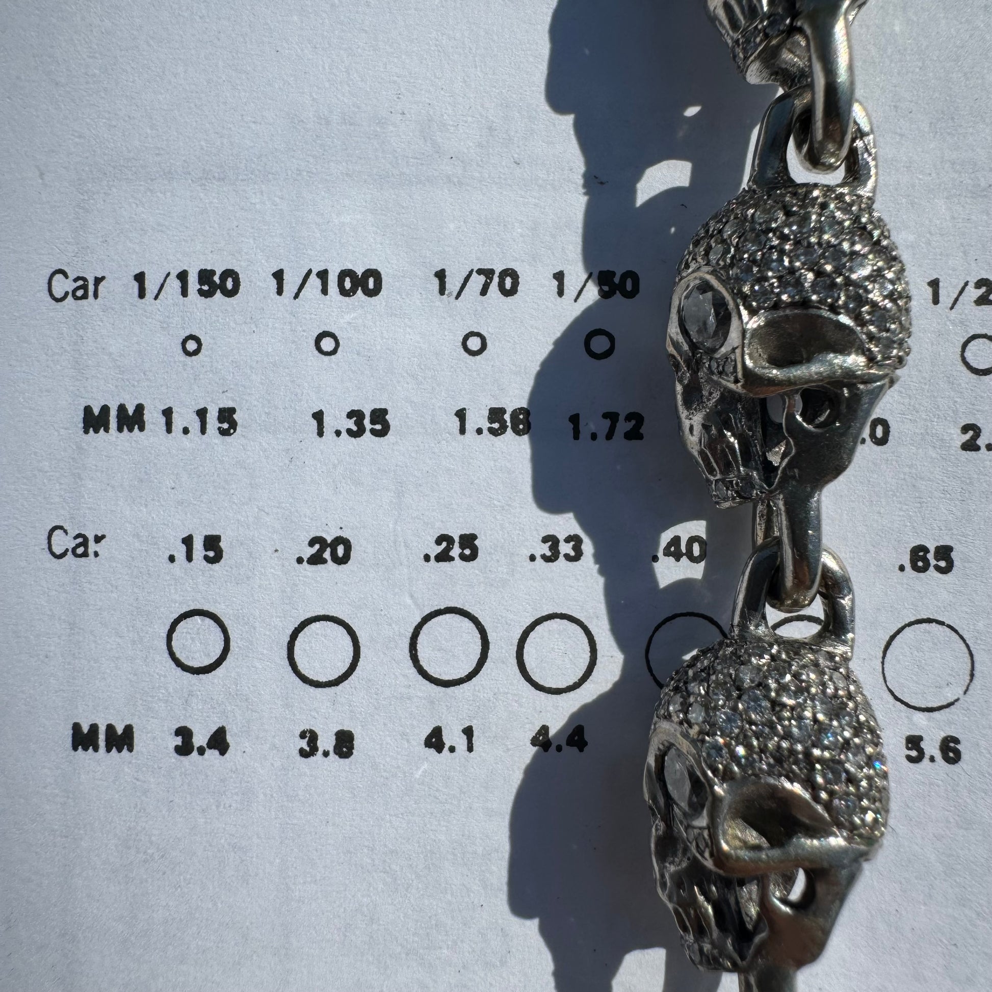 You’re looking at the best vintage custom skull bracelet on the internet by far at the best price you’ll find anywhere else in the world hands down. You couldn’t even make this bracelet right now for the price I’m giving it away at when you include the materials and labor. This one speaks for itself and should retail for over $25,000 considering the fact of one of the only other higher tier custom skull bracelets I found by one of the biggest names in the industry was priced at $25,480 though it was only 14k gold at 55g and 15.6ctw of diamonds so I’m really playing nice and conservative at that price. Keeping in mind I am not GIA certified, the Diamond count and grading scale is as follows and was done to the best of my abilities with the tools and knowledge I have at my disposal. It will not be an exact measurement but will be a close approximation + or - a little bit. There are approximately 18 (.25ct) natural diamonds to make up the eyes of 9 skulls (seen in picture #18 ), 95 (.02ct) natural diamonds to every full skull link (seen in picture #19 ) and 65 (.02ct) natural diamonds on the end skull that makes up the male side of the clasp. Conservatively adding all these up and favoring to the low side of the diamond count just to be safe we’re looking at around 21CTW of clean and colorless natural “earth mined” diamonds tested with a high grade gem tester (picture #22). All solid and heavyweight weighing in at just over 74g the gold purity is consistent of 18k which was tested multiple times in multiple places with acid and an XRF x-ray machine (seen in picture #21). With a length measurement of 8” (not including the clasp) the circumference of the chunky skull links at 9.5mm x 12mm actually brings this bracelet to a more wearable length of approximately 7” to 7.25” give or take a few. This is being sold at a wholesale price, do any investigating and try to find these same specs of any other bracelet even close to this price and you won’t even come close. I would say you won’t find a deal like this ever again and when I think about it neither will I 🤦🏻♂️. If you aren’t buying this as your personal a dealer will be swooping this one up to easily double their money and still be leaving meat left on the bone after that.