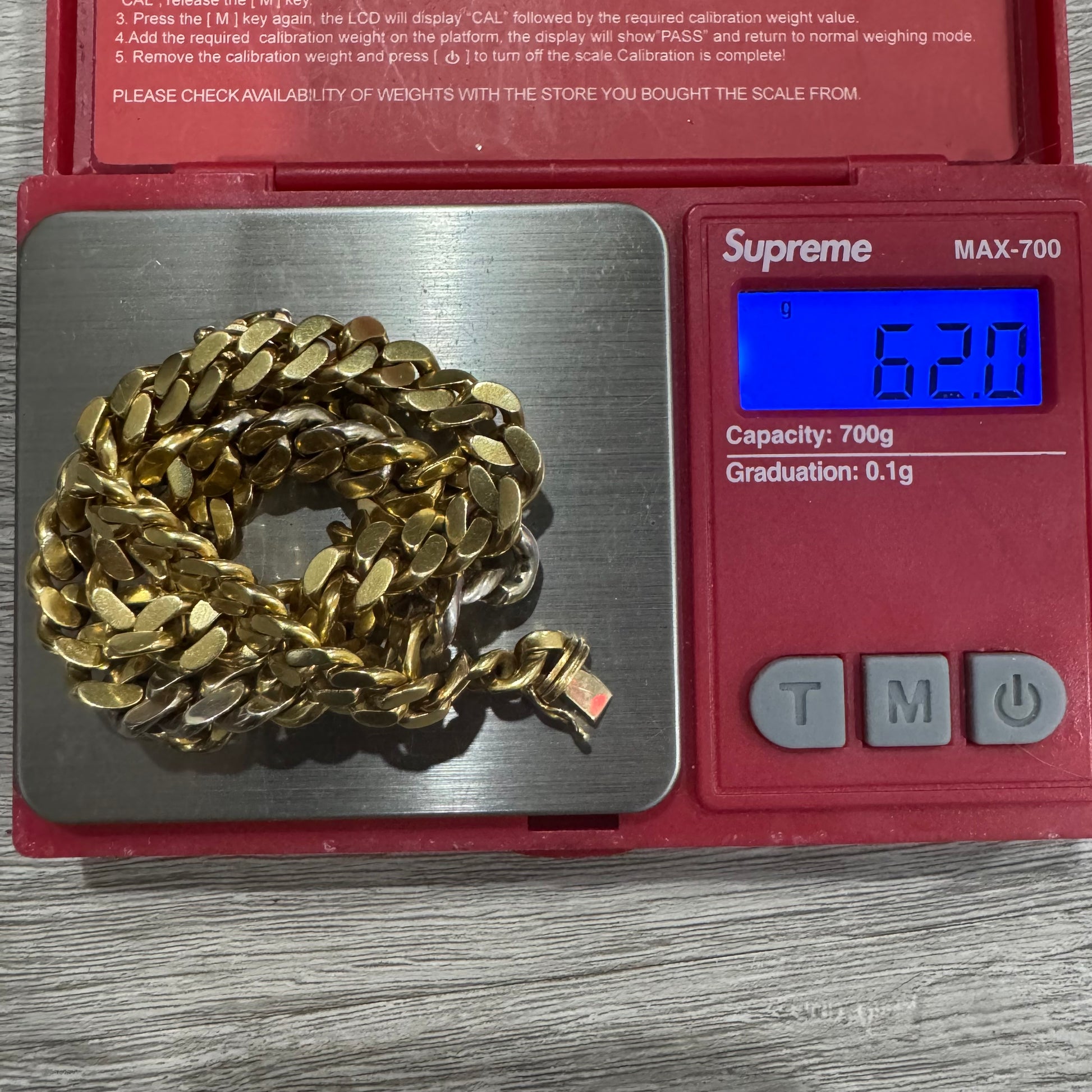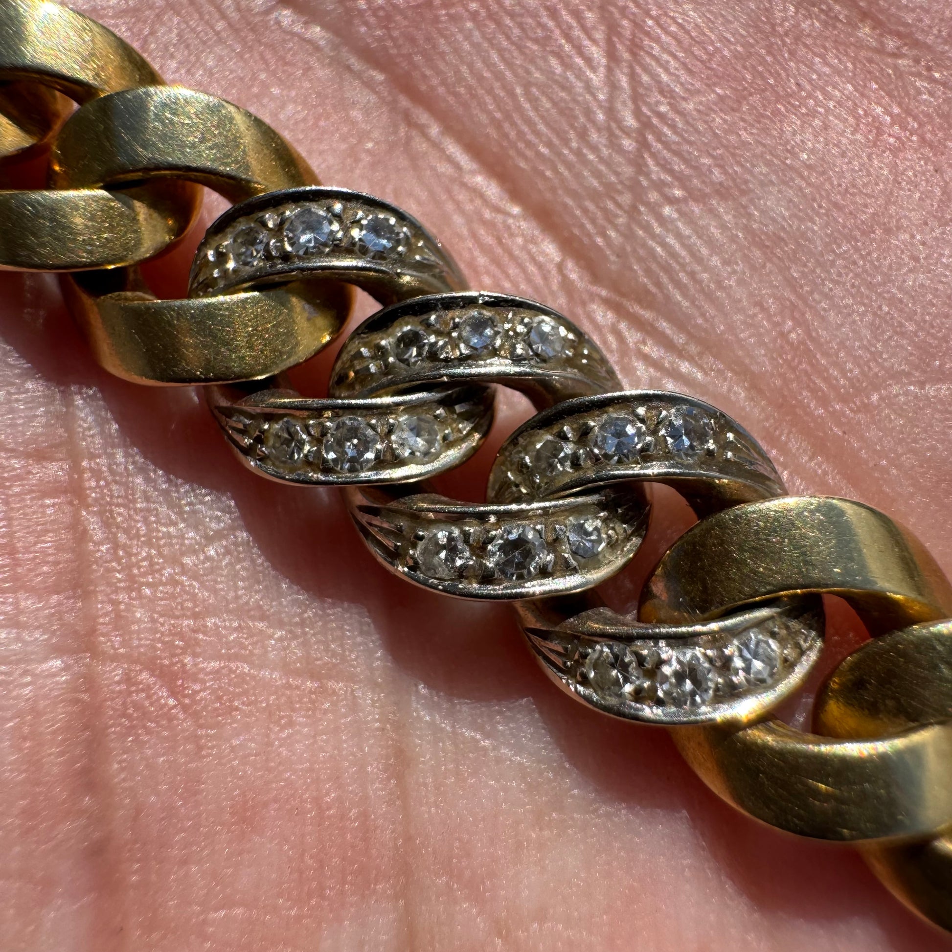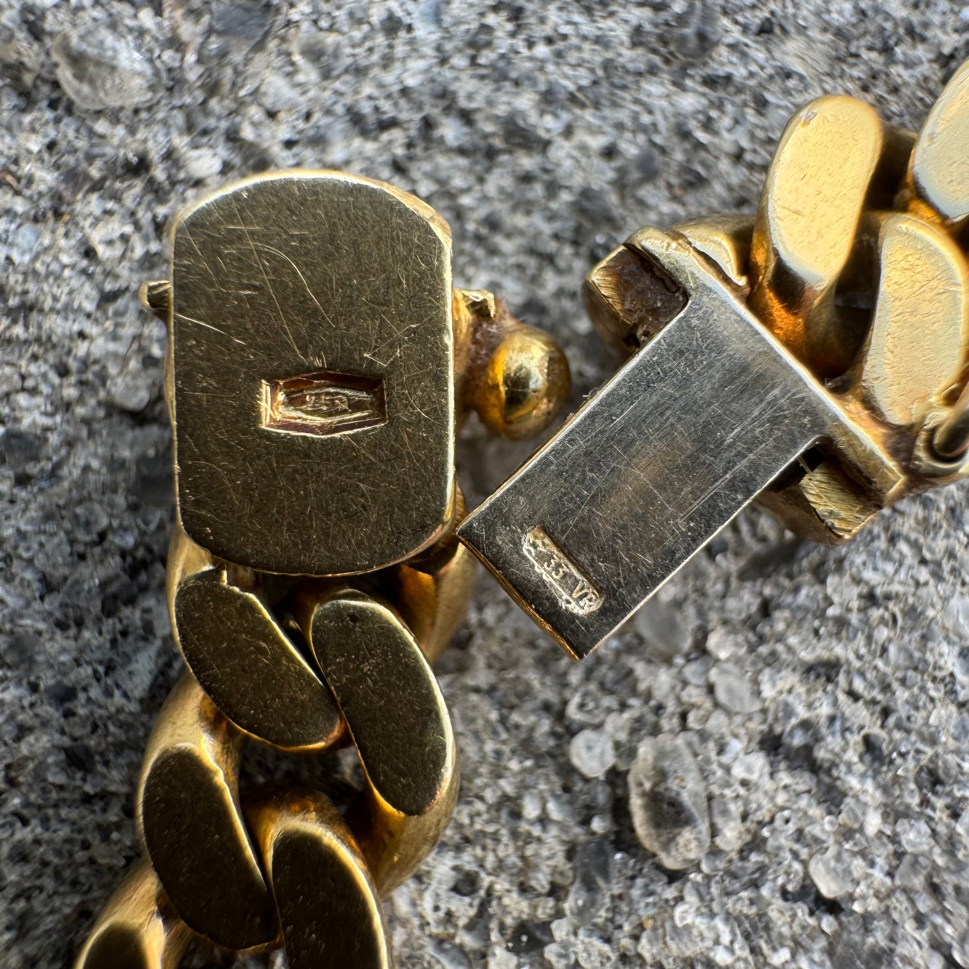 Old Italian designer at its absolute finest, this masterpiece was handcrafted out of a fully solid 18k vibrant yellow gold in Verona Italy by Paulo & Amedeo Bottoli. With 9 links in the center of the chain rhodium dipped and encrusted with 54 all natural VS single cut diamonds totaling to approximately 1.0ctw this necklace has just increased from a first round draft pick to a league MVP. Chunky, heavyweight, menacing, yet elegant this meets all the criteria you’re looking for as each curb link has a slight twist yet tapers from 8mm at its widest in the center to 6mm once it gets closer to the strong and durable clasp ends with extra safety side latch. At 62g in weight, 3mm thick, and 16” in wearable length the necklace lays on the neck ever so softly and feels like you’re being hugged due to its flat formation on the backside of the links. Pride and craftsmanship throughout the entire piece you can try your hardest to pick it apart and find a defect and you will come up short everytime. Search high and low this isn’t an average curb link that you will just find when you want and if you do, the price and premium will be way higher than what you’re paying for this one. Dont miss out!