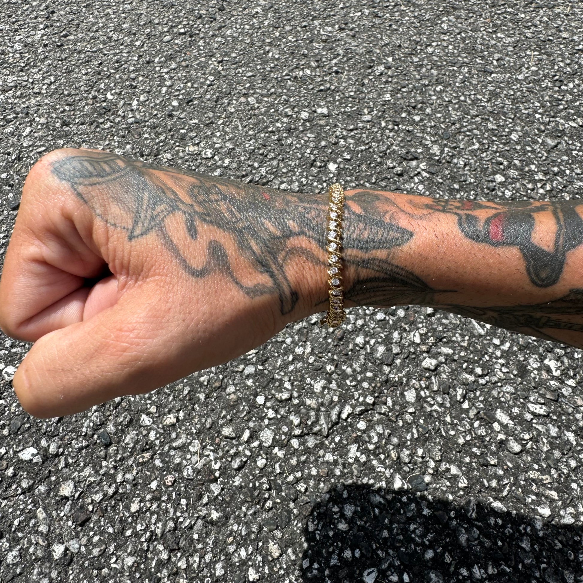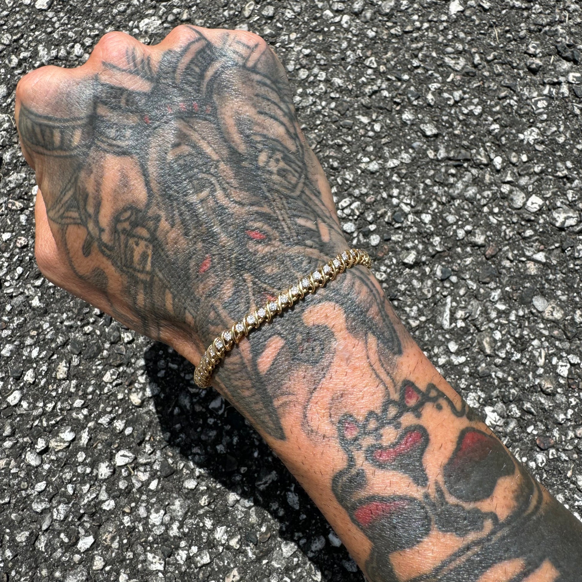 Spectacular and chunky with approximately with 2.0ctw (hallmarked on the underside picture #14) of eye clean natural VS2 and SI1 diamonds consisting of 50 diamonds at .04ct each (Picture #7 shown taken under a magnifying loupe) this heavyweight vibrant 18k yellow gold bracelet is very well constructed. If you look at the close up pictures of the construction on the back side you can tell how well this bracelet was made as it forms to your wrist and moves with your movement just like the vertebrae in your spine would. Thick look and feel at 5mm wide the gold arches in between the diamonds give off not only a protection of the diamonds but also a clean and sparkling effect. 7.25” in length and 14g this is an excellent deal.