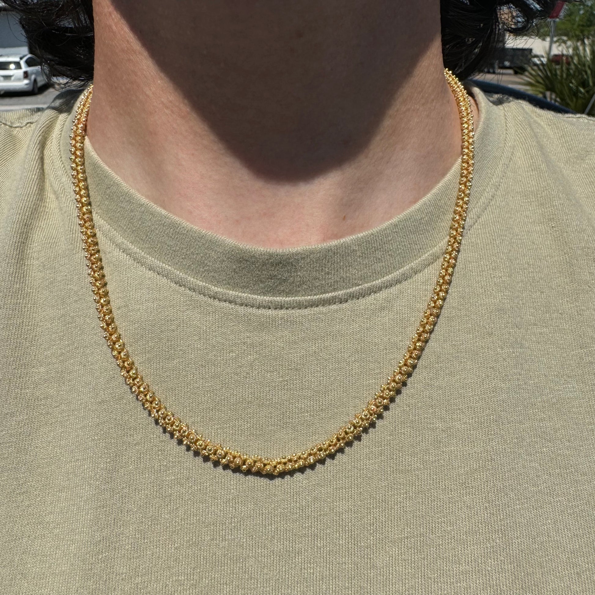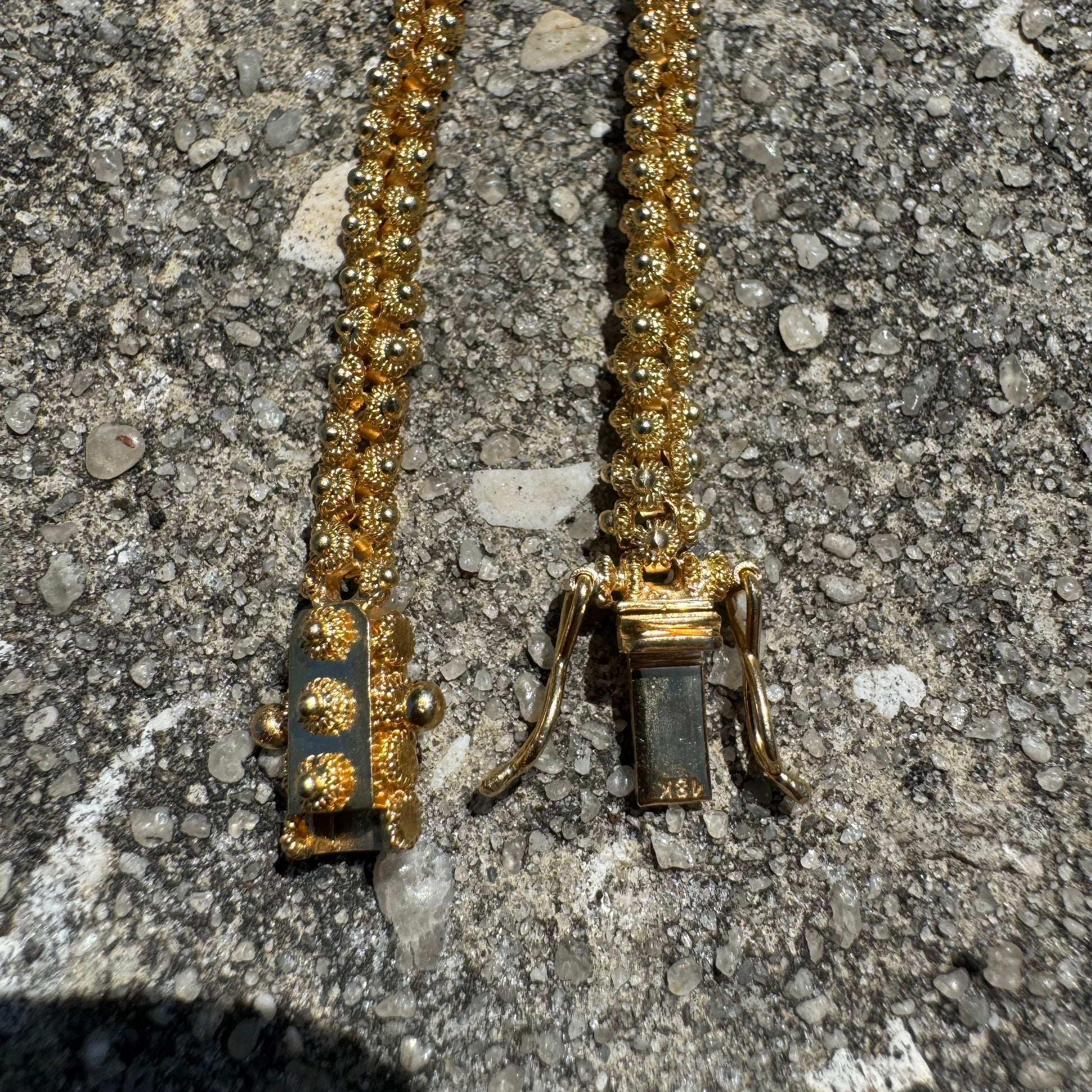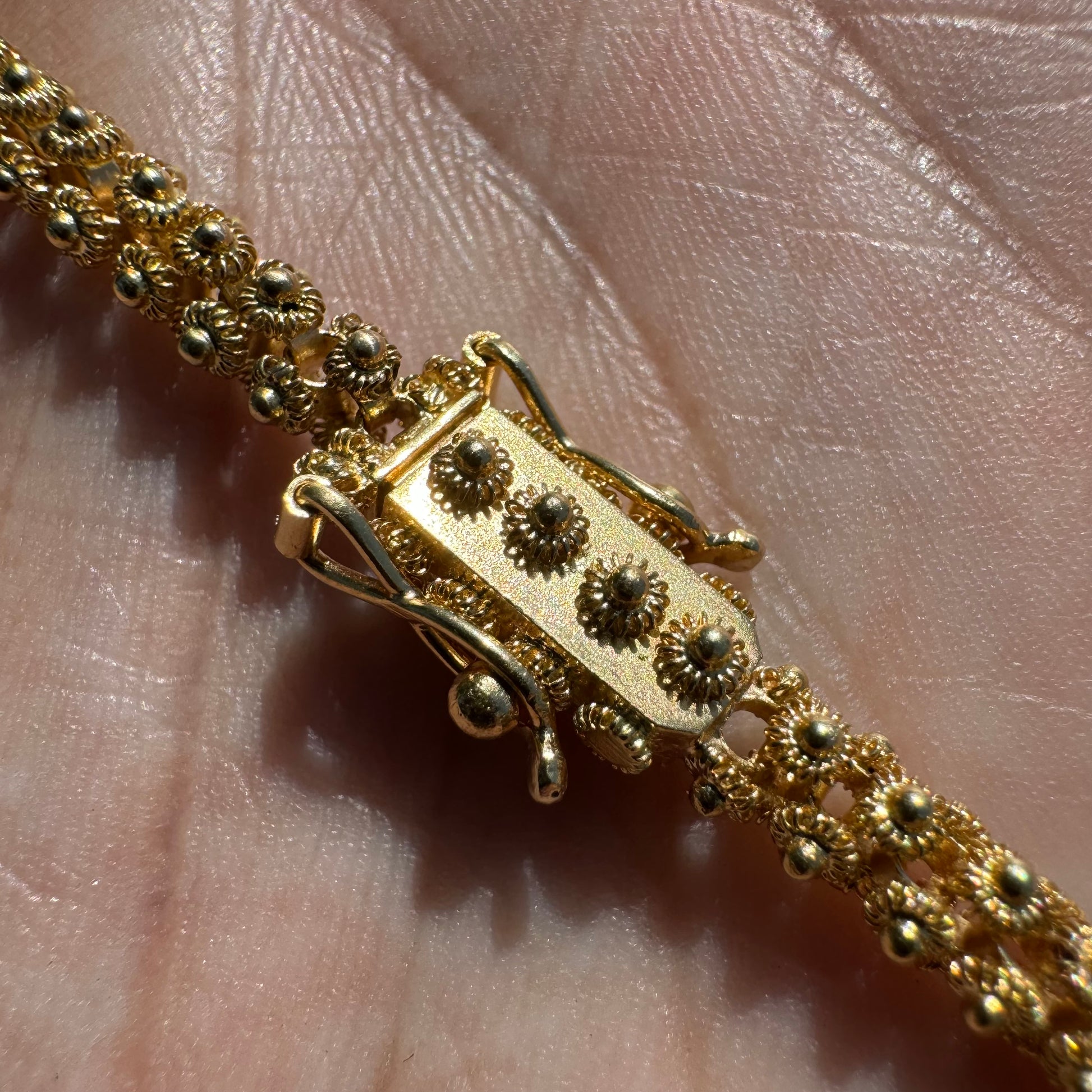 The time, expertise, and craftsmanship that went into this piece is next level. All crafted by hand out of solid 18k vibrant yellow gold in the old school and old world techniques this is an extremely intricate link style. Called the pikun flower link each little flower bead was all set by hand fully around a circular link as they were all laced together in a criss cross pattern. Crafted with an extra heavy duty and secure double sided security latch box lock this baht style necklace is all solid and heavyweight measuring out to a fitting 20.5” length by 5mm circumference and weighing in at a whopping 34.66g. This is an investment heirloom piece that will continue to grow exponentially in value as you continue to pass it down through the family.