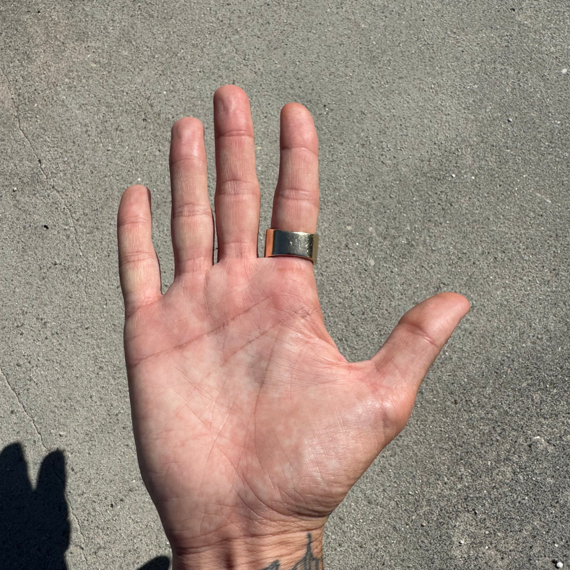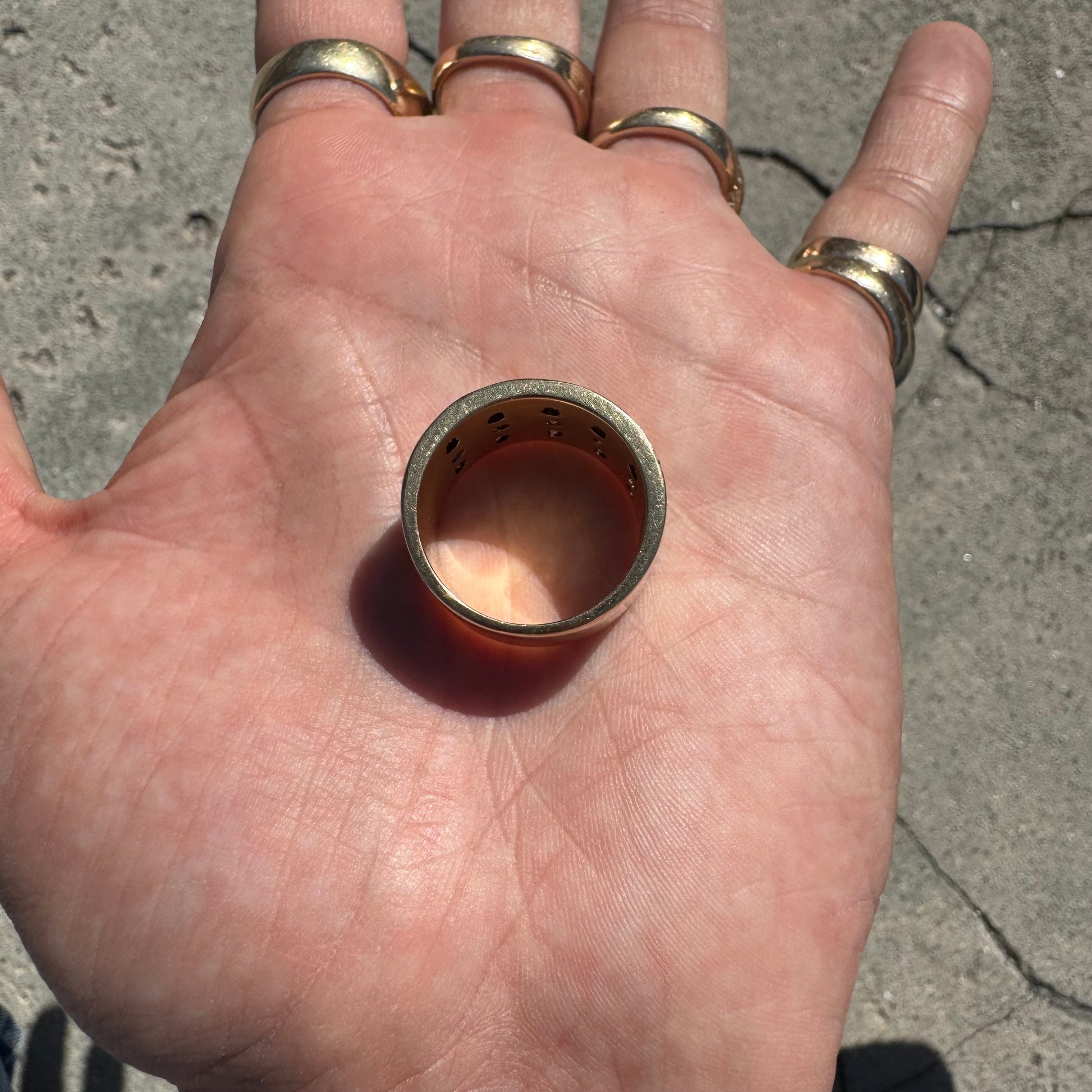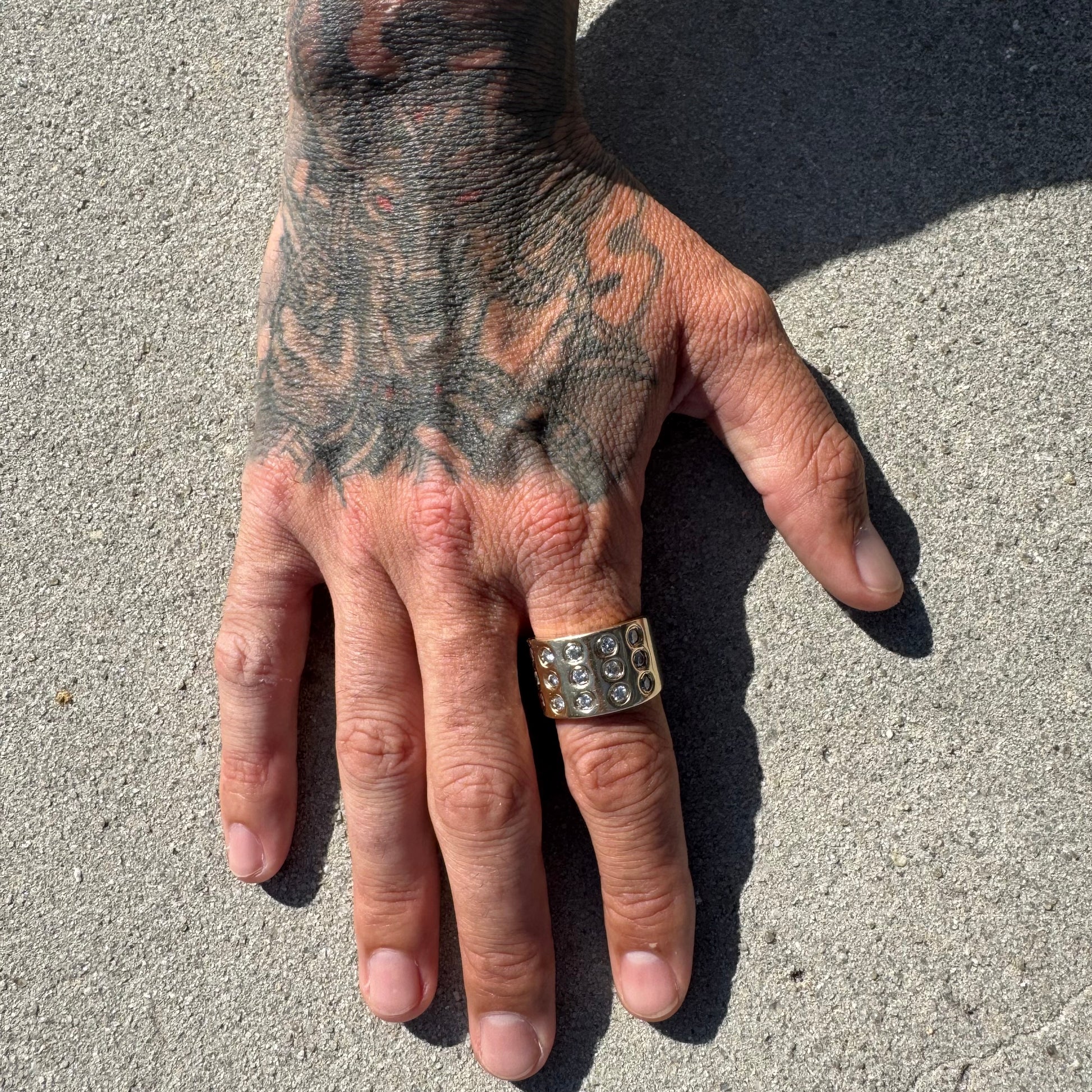 This piece is an absolute force to be reckoned with. At 15mm this is one of the widest and largest cigar bands I’ve come in contact with while still not being to overbearing. All handset with 15 large .10ct natural diamonds seated just below the surface totaling up to approximately 1.5ctw in a heavyweight solid 18k yellow gold thick band. The ring takes up a prominent space on the finger but yet is very comfortable with its rounded edges as it weighs in a beefy 22.7g. As you can see on the ring sizing mandrel picture it fits right in between a size:10.75-11 because of how large it is. This ring will get you noticed a mile down the road as it’s also a safe and sound investment at a great price point for how much weight in gold you have here.
