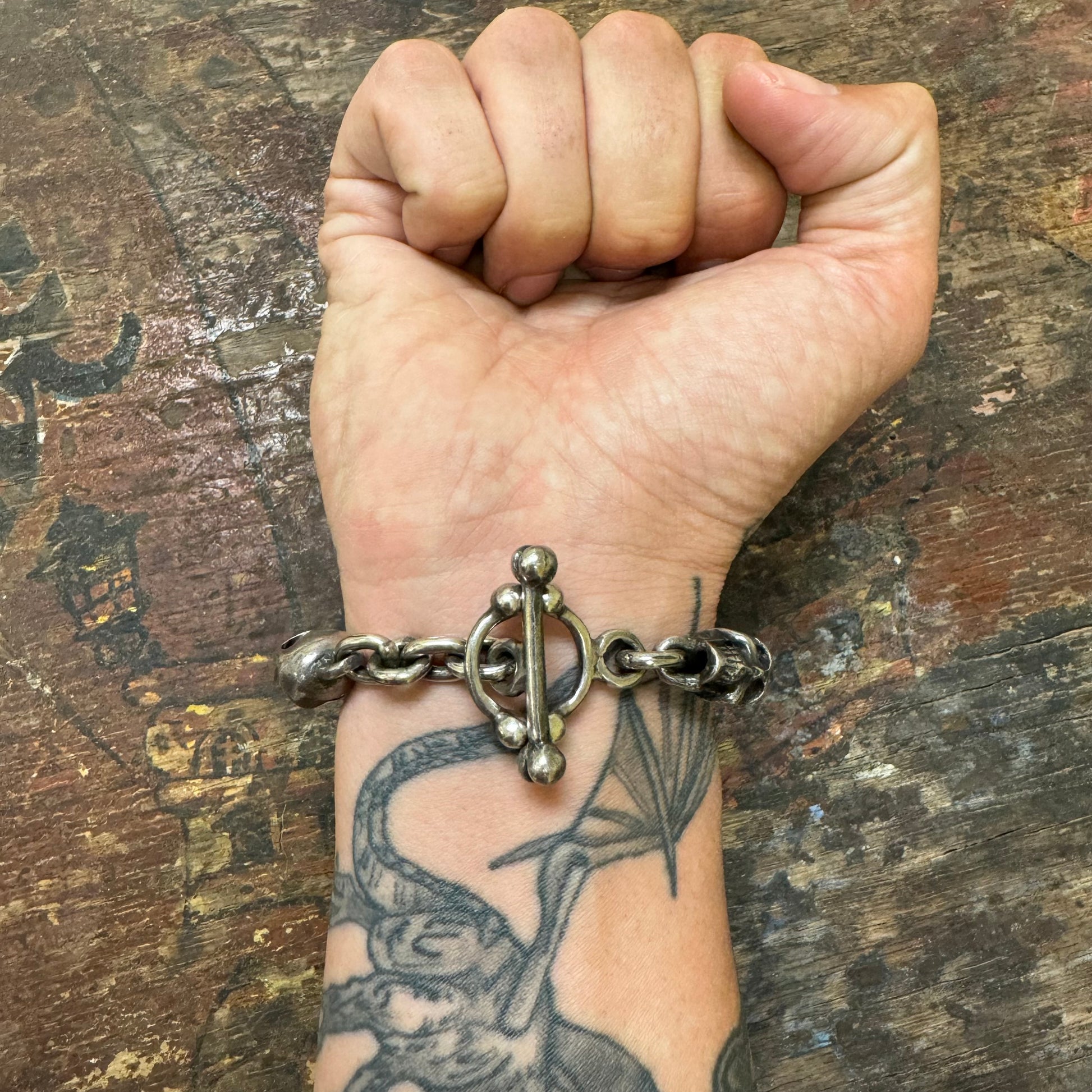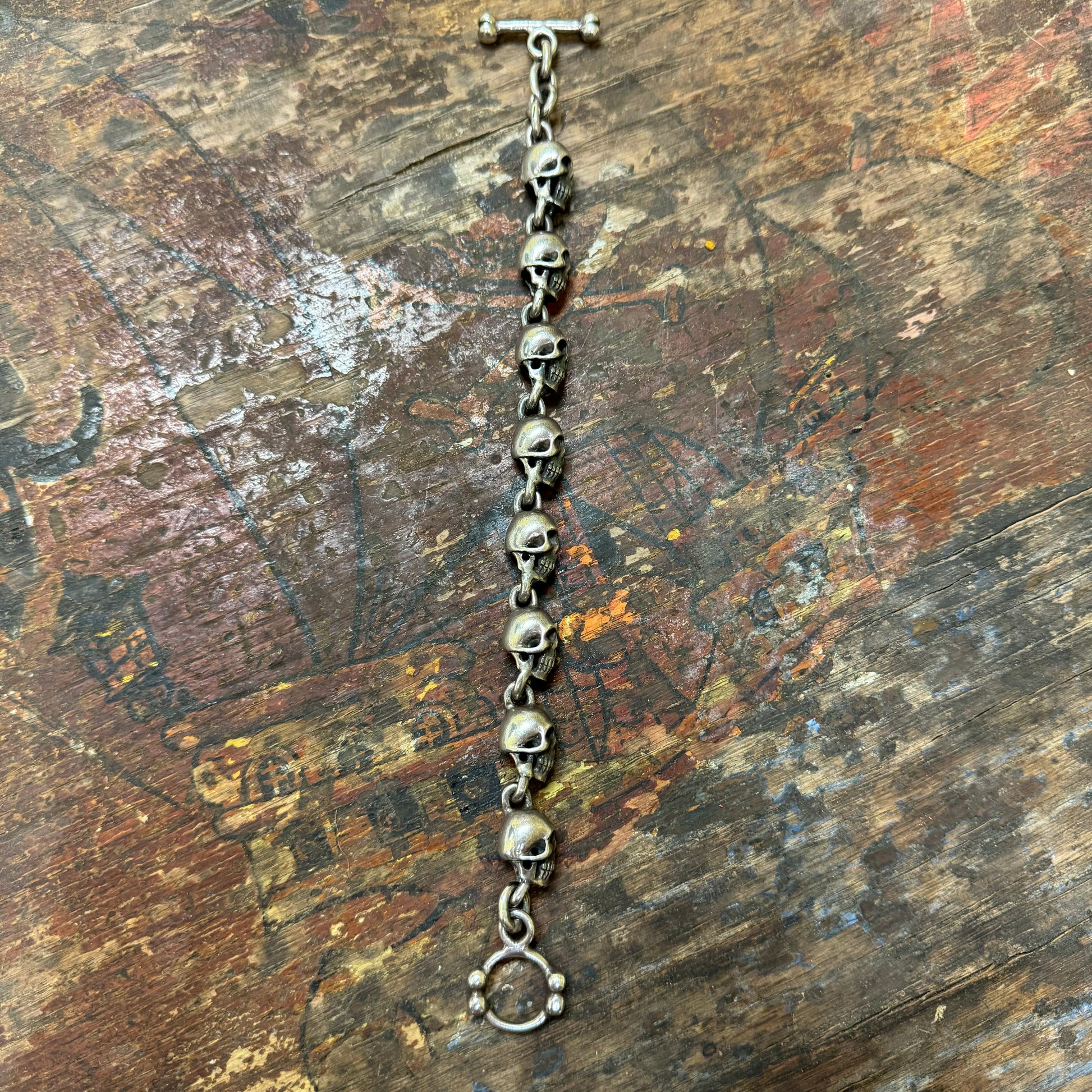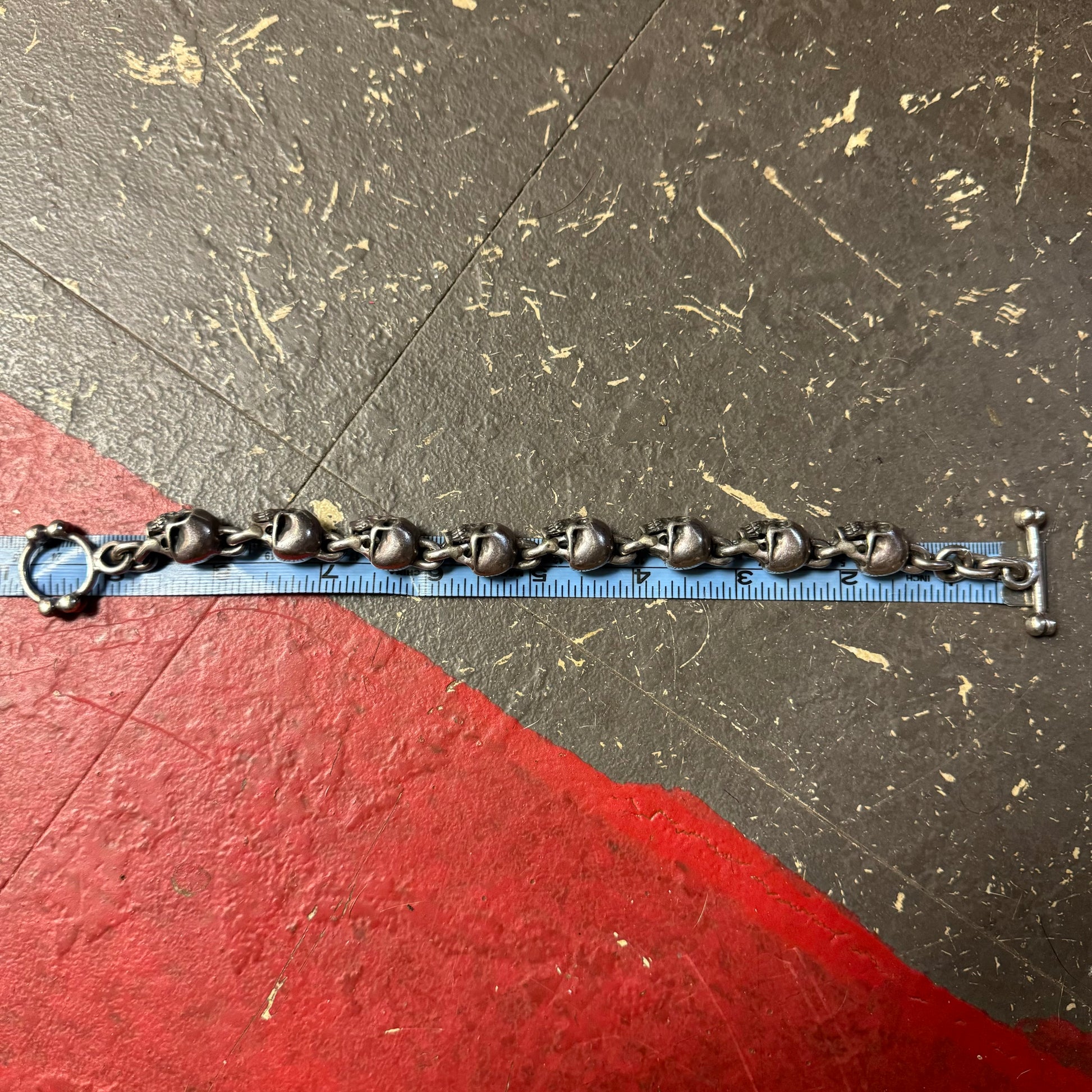 Perfectly oxidized from being worn over the years since it was crafted sometime around the 1980’s/90’s is this super heavyweight fully 3D skull pile bracelet. Measuring 9.5” end to end the solid skulls measure 11.5mm x 14mm giving it a thicker circumference that really gives it a fitting of approximately 9”. With a bad ass toggle clasp made of crossbones this biker style bracelet is tough as nails and a chunky heavyweight of just under 100g