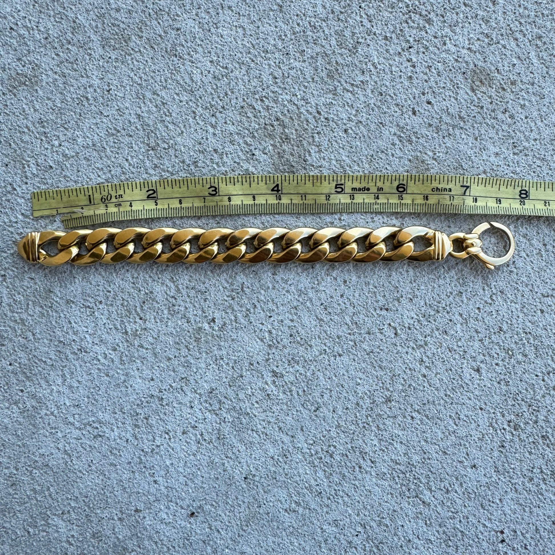 Made my one of the most famous high end Italian gold designers, UnoAErre, this buttery yellow 18k gold Cuban/carb link bracelet is a Godsend. Super chunky and visible on the wrist measuring approximately 15mm wide by 4mm thick this one is the definition of a conversation starter and statement piece. With oversized heavy duty large lobster clasp set up for both looks and functionality it’s to die for. Measuring 7.5” in length and weighing just under 32g it is a heavy piece but considered “light” and extremely comfortable for how big it actually is. Though the pictures are pretty good it still doesn’t do this one justice. In great condition, no dings or dents, with slight signs of wear from over the years this bracelet was probably not worn often.